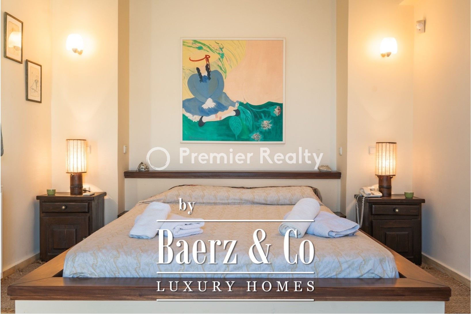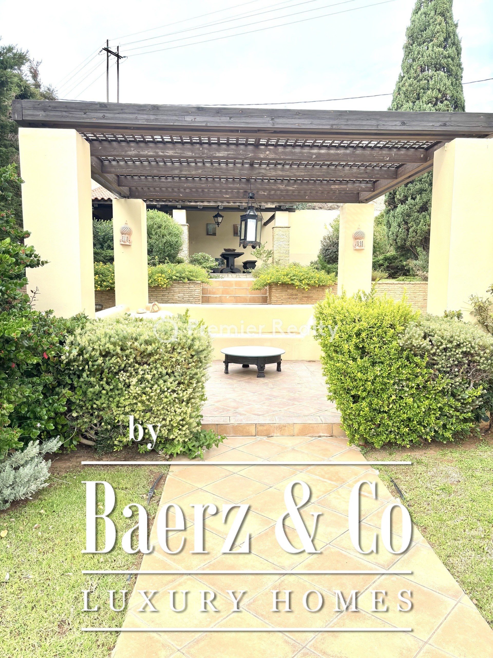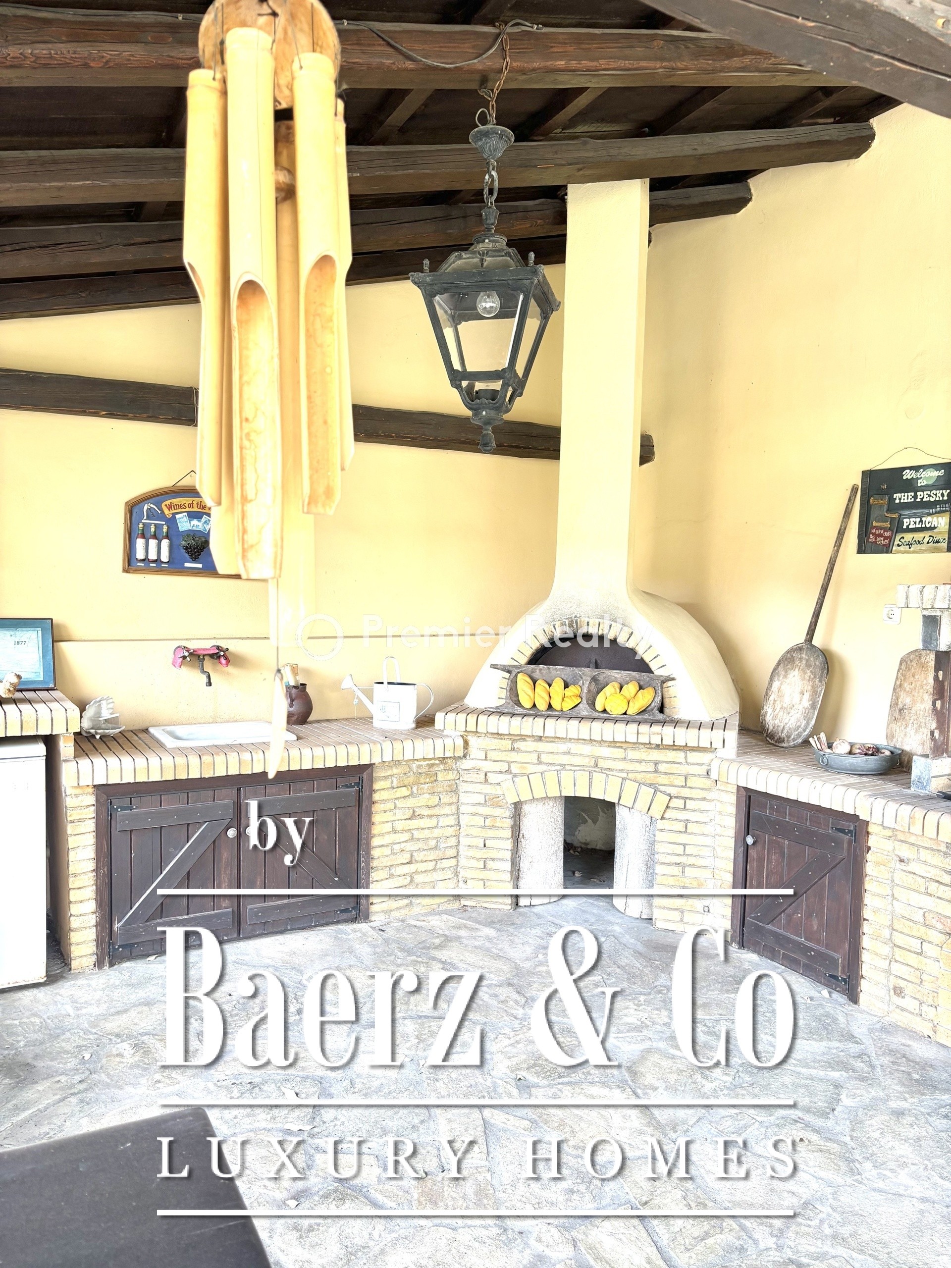 Materials include antique-cut marble, wood floors, and aluminum frames with double-glazed windows. Individual heating per floor, air conditioning, security features, and independent garages for two cars support comfort and security. Manicured gardens, an automatic irrigation system, and a dedicated BBQ area invite outdoor gatherings in the Mediterranean air.