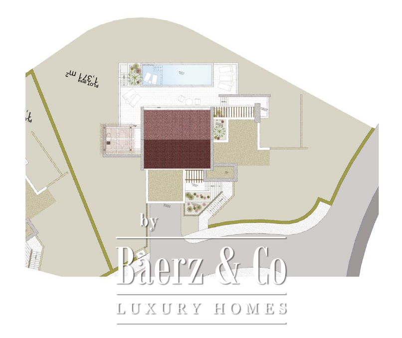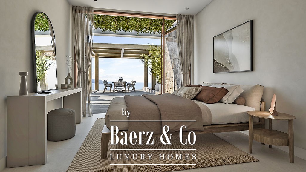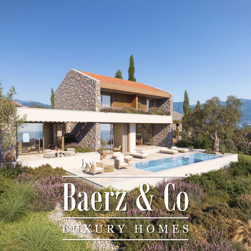 Structure of the villa: hallways, living room with kitchen and dining area, 3 bedrooms, 3 bathrooms, a toilet, 4 terraces and a yard with a pool. It has a view of the sea and the mountains that surround it. The villa will be fully furnished.