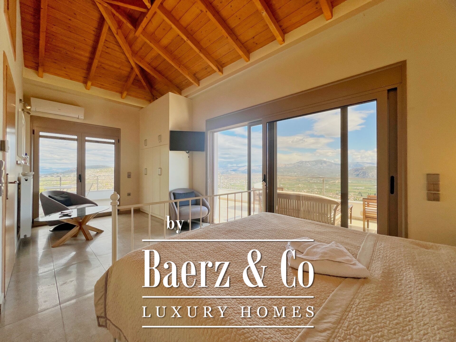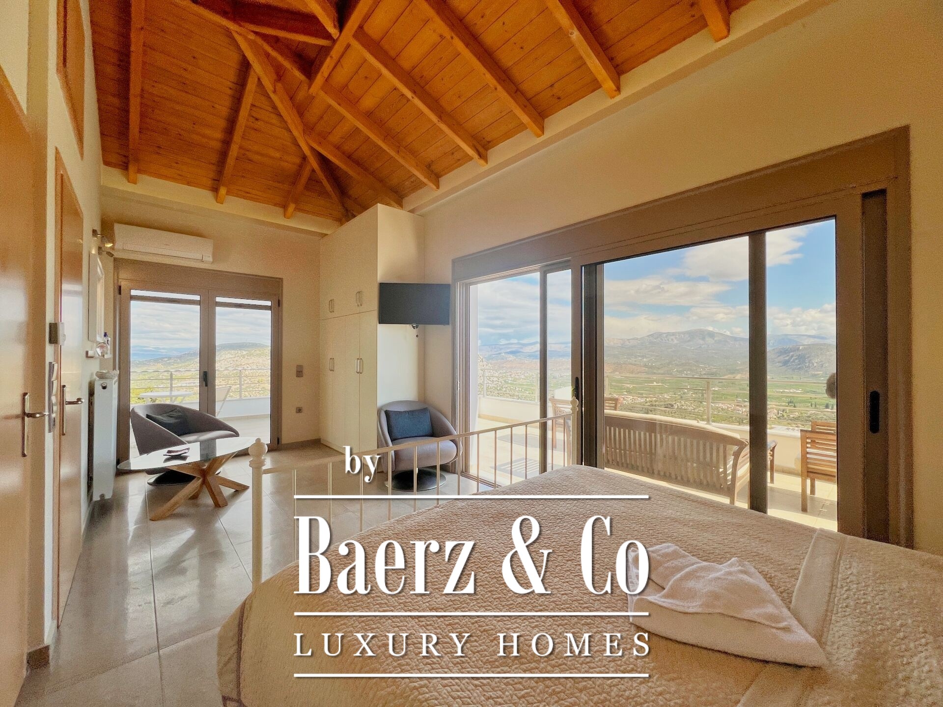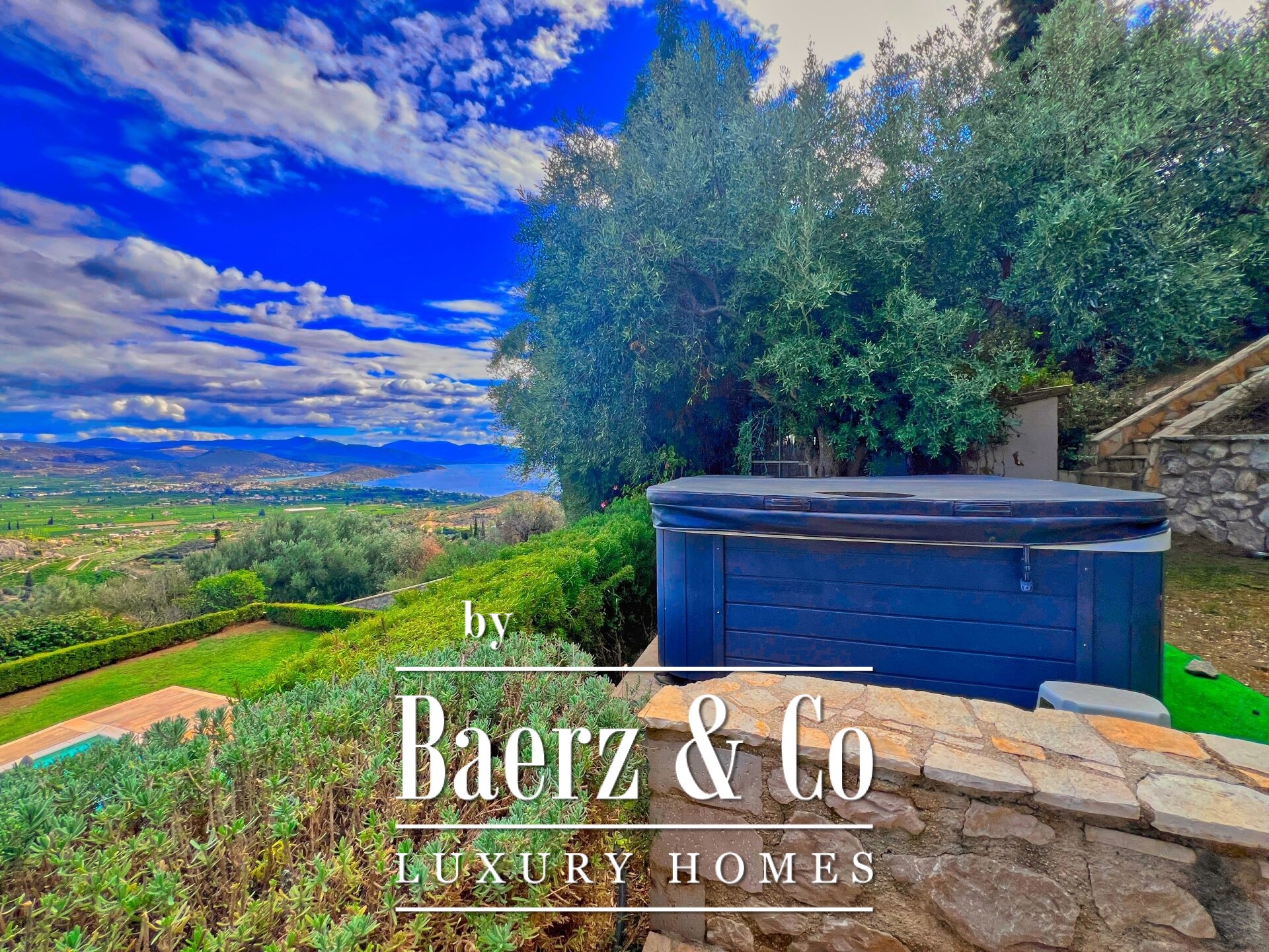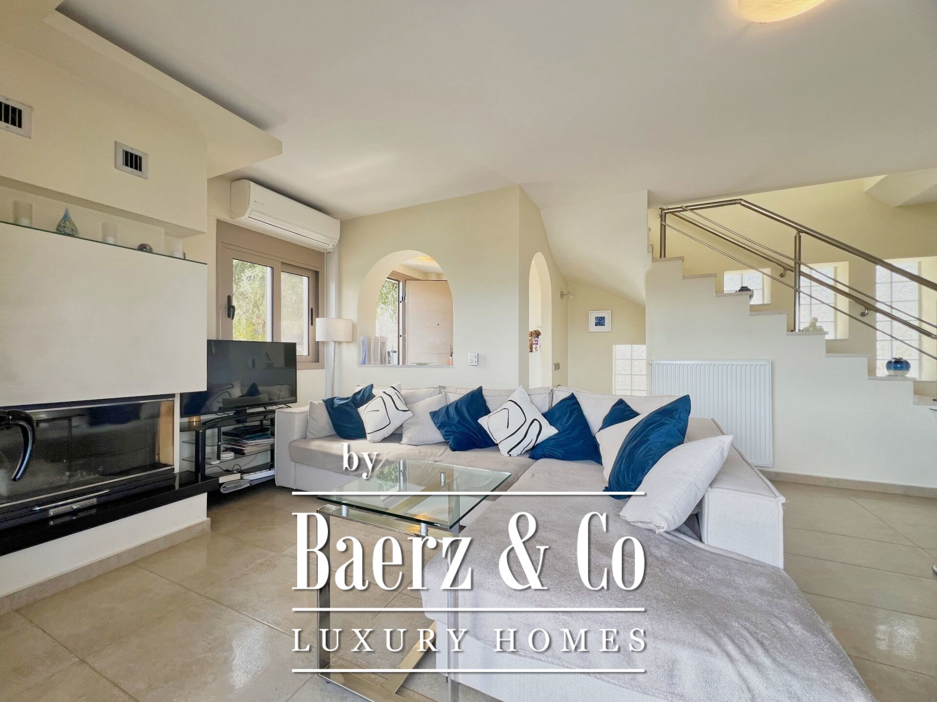 This luxury villa Tolo sits on one of the area’s highest points, commanding panoramic views of the sea, Spetses island, the mountains and open countryside. The property stretches over 165 m² across three thoughtfully arranged levels, offering a sense of seclusion while remaining just 2 km from the sandy beach and local shops.