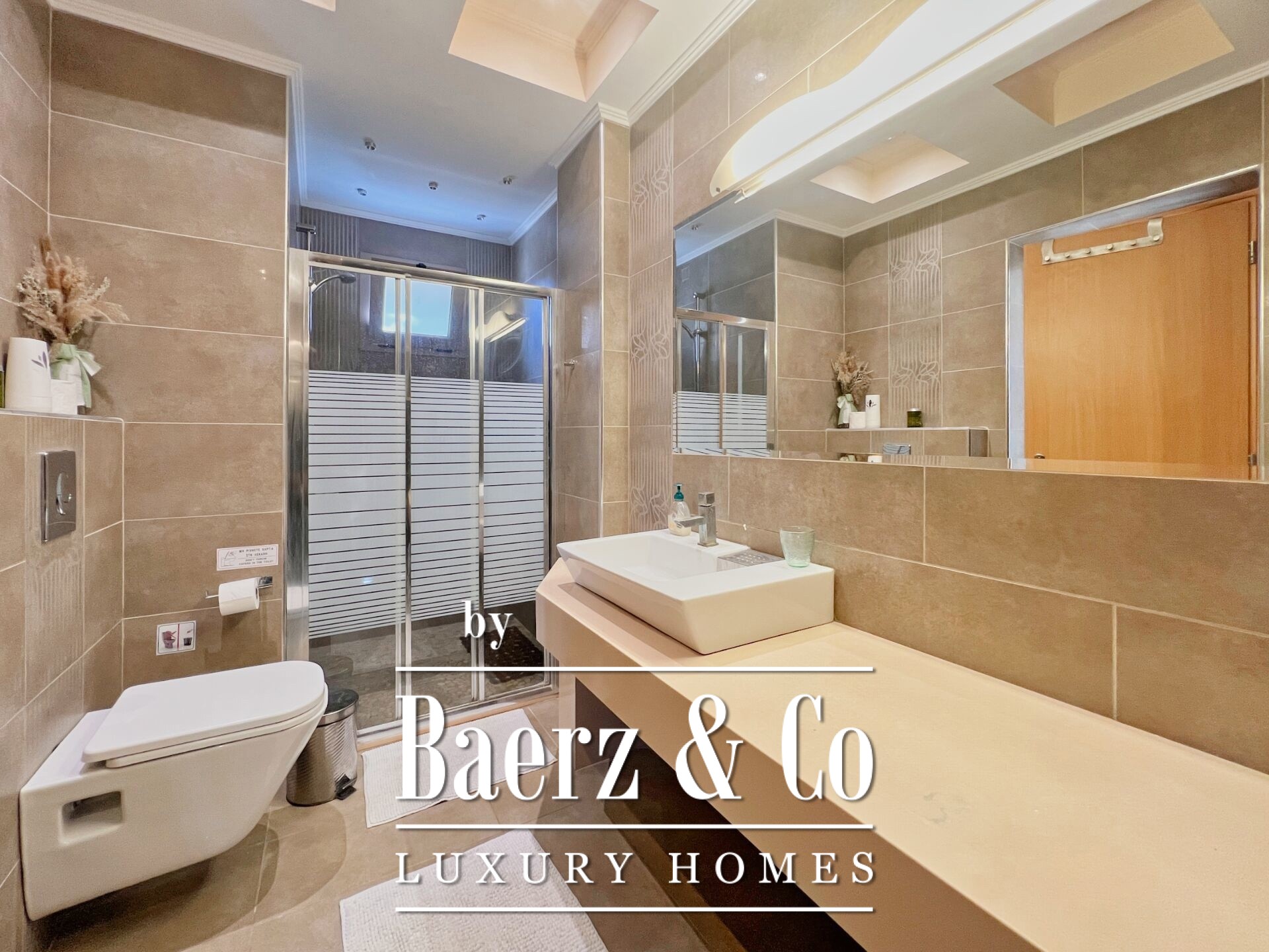 Step through the main entrance on the second level, where a formal living room with a fireplace invites quiet evenings and gatherings. The adjoining dining space and luxury kitchen open out to a covered terrace with a 180-degree vista, setting a tranquil rhythm that carries through the home. Two bedrooms and two bathrooms on the first level blend comfort with access to the landscaped garden, while the entire upper level belongs to the master suite, complete with its private bathroom and two generous terraces for reflection or dining al fresco.
