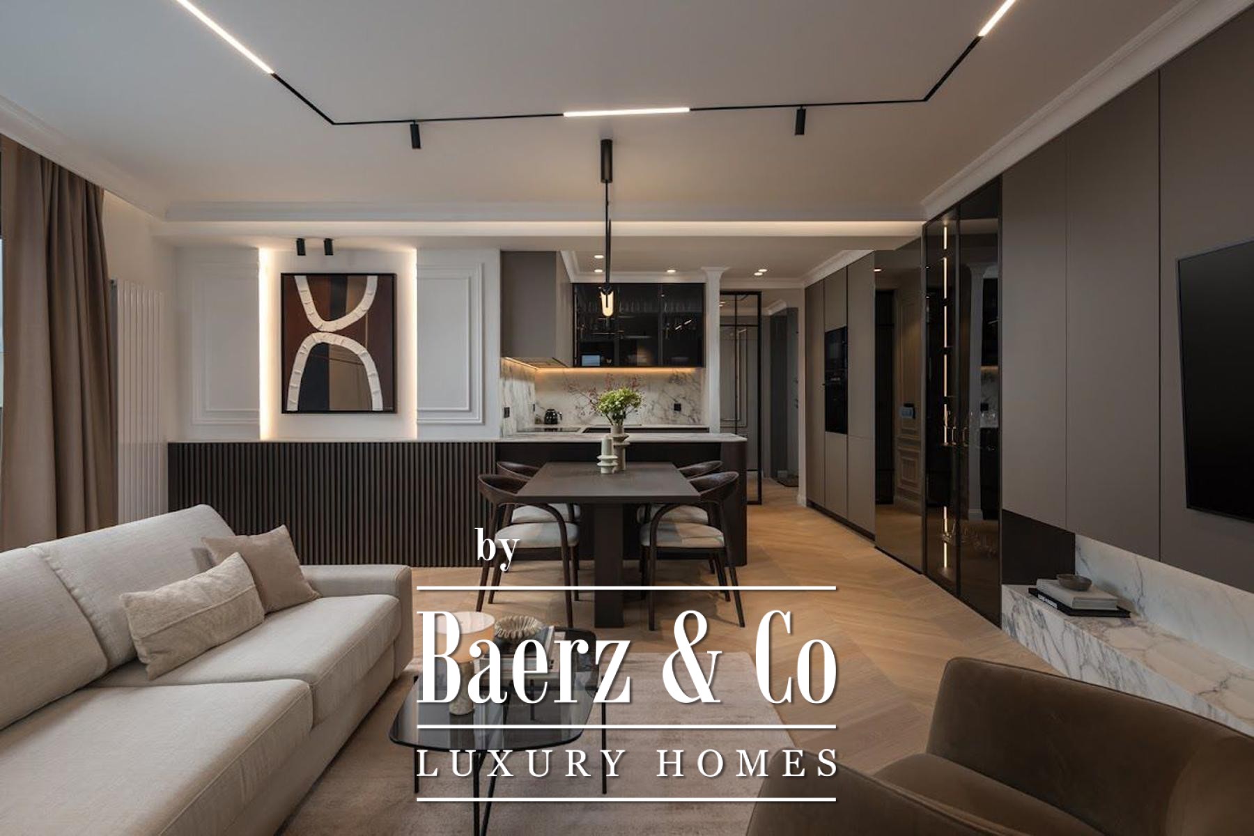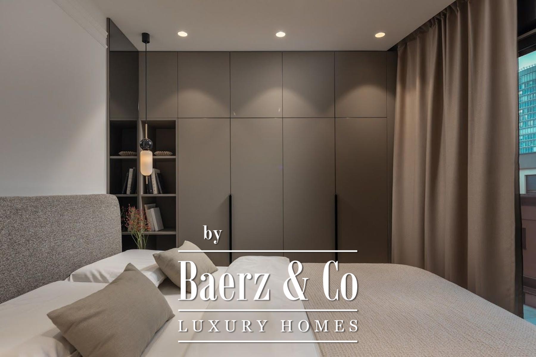From the direct elevator entry connecting the underground garage to the private entrance, the penthouse signals rare intimacy and discretion. The residence features five bedrooms and five bathrooms, each with custom sanitary installations and underfloor heating. The living spaces are enveloped in light, with elegant Chevron Boen parquet, aluminum joinery, triple-glazed windows, and integrated LED illumination imparting a refined, welcoming ambiance.