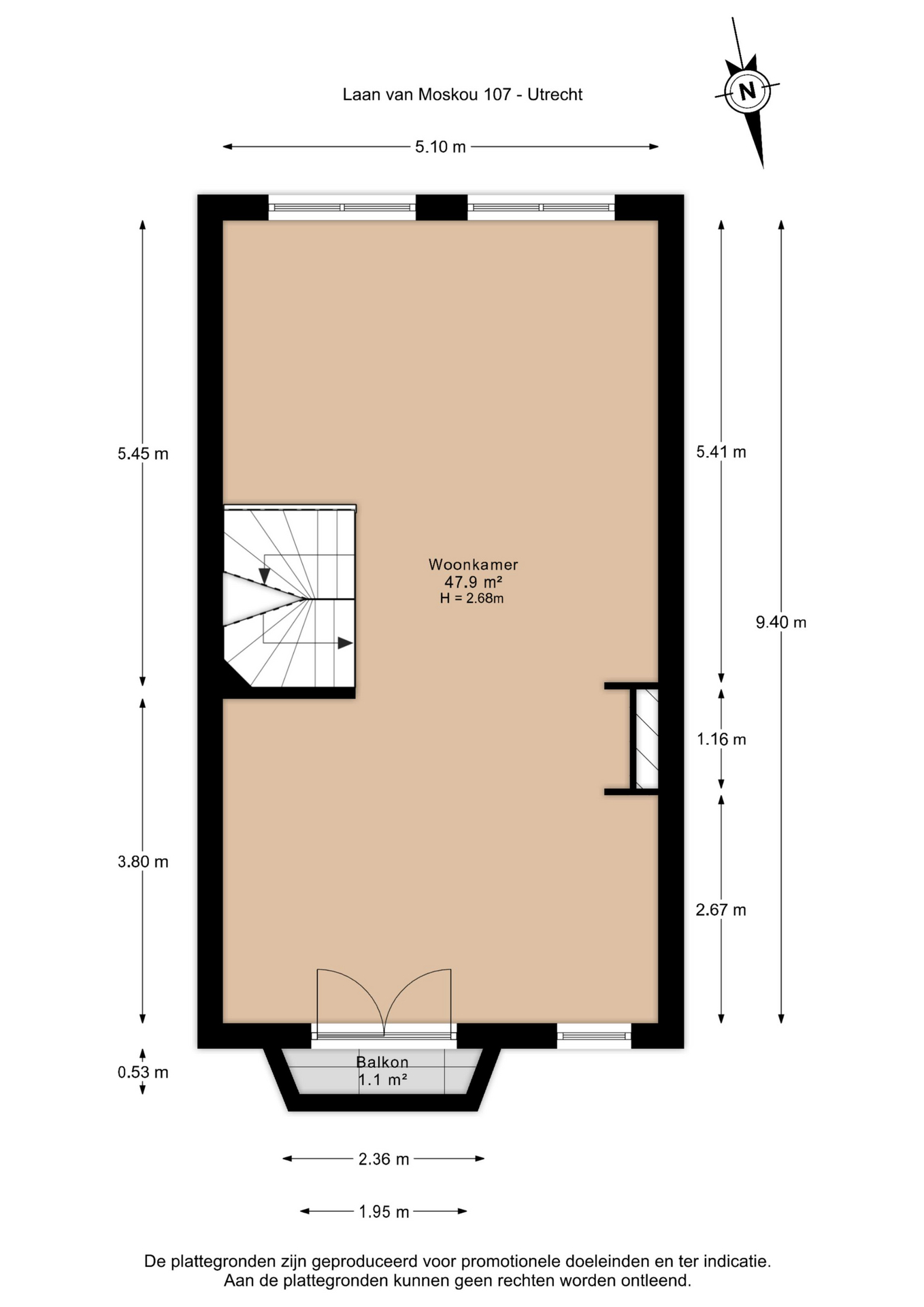 Je komt binnen in een ruime hal met toilet en plek voor de kinderwagen en garderobe. Vanuit hier loop je de indrukwekkende voorkamer in met een plafondhoogte van 4,76 meter en ramen tot aan het plafond. Deze ruimte staat in verbinding met de iets hoger gelegen leefkeuken. De keuken is op maat gemaakt en biedt ruimte voor een grote eettafel. Onder de trap bevindt zich een royale bergkast. Vanuit de keuken is er toegang tot de patio en de gezamenlijke binnentuin.