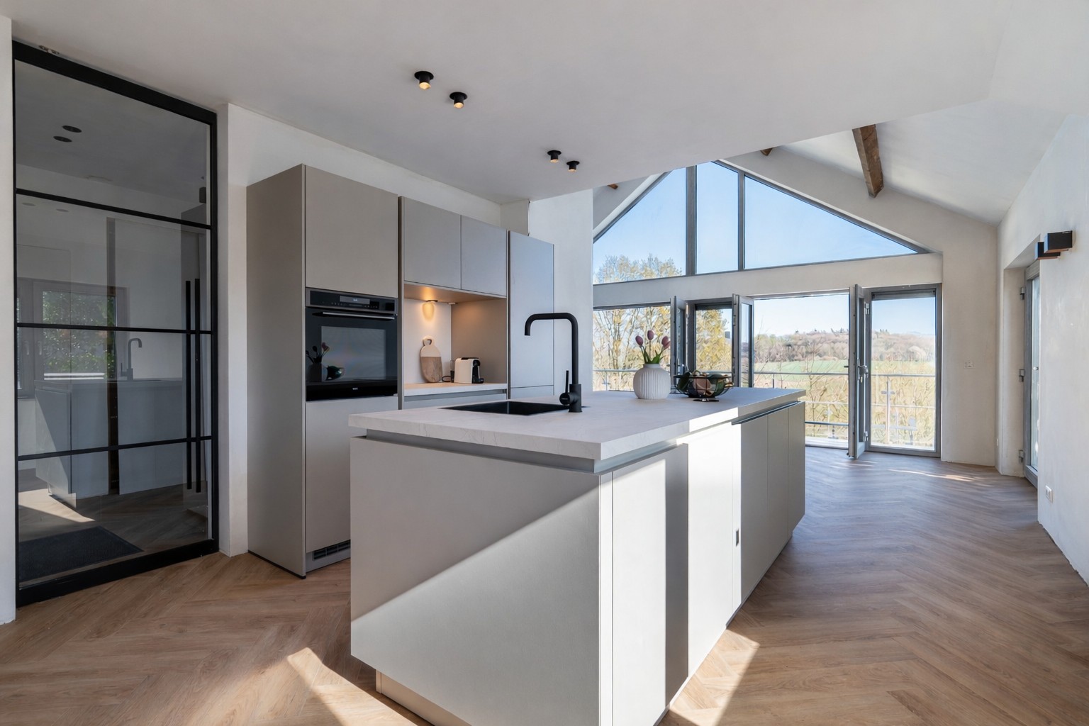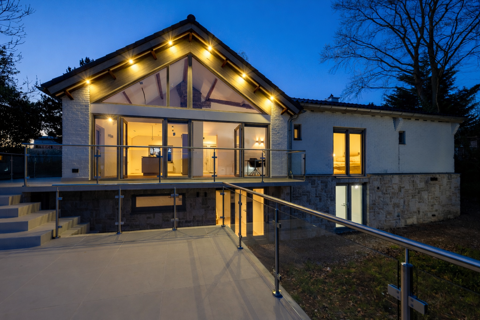 The living area is located at the rear and is fully oriented toward the panoramic view. Thanks to the large windows, natural light floods in, and the indoor and outdoor spaces blend seamlessly. With an XL garage, a practical layout, and all essential living amenities on the ground floor, this home combines luxury with lifetime-ready living. The home features a spacious, multifunctional basement and a practical attic.