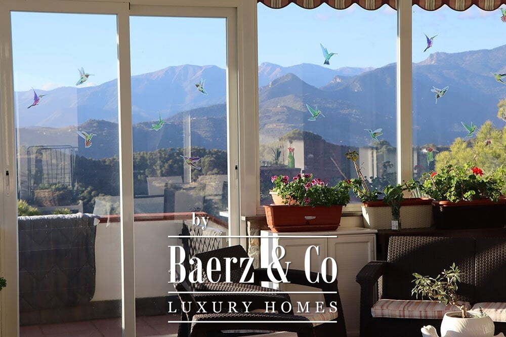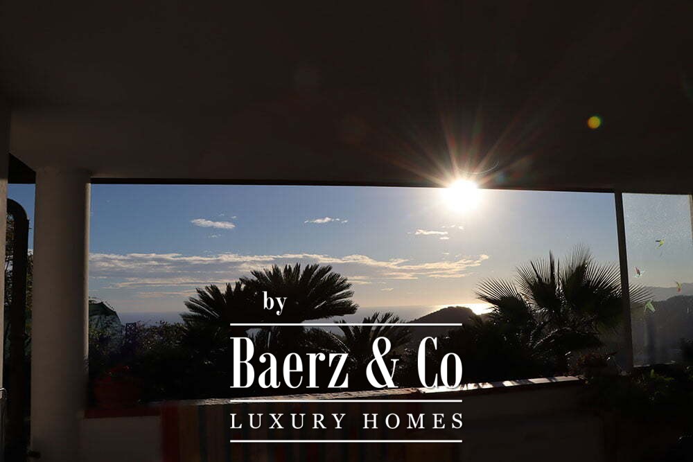 Entering the villa, the top floor presents a generous living room opening onto a covered terrace, framing unobstructed vistas of the Mediterranean and valley below. This level holds two bedrooms, each with its own bathroom, while the principal suite includes a private walk-in closet. On the lower level, a substantial garage accommodates multiple vehicles, and a spacious studio or office connects seamlessly to the property’s layout.
