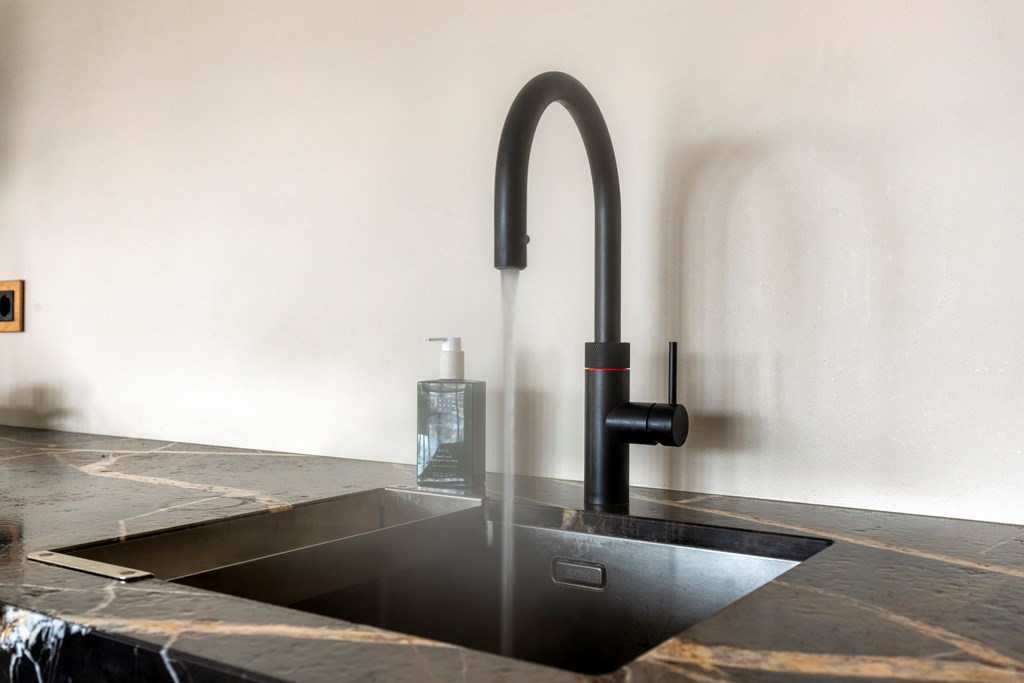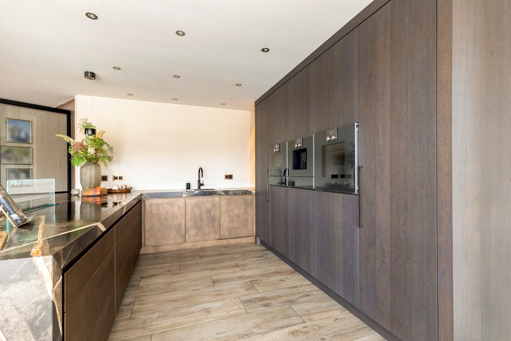 The luxury kitchen is truly a showpiece. The generous cooking island invites long dinners and convivial gatherings, while high-end built-in appliances by Gaggenau, including a combi-oven, steam oven, coffee machine, induction hob with downdraft extractor, Quooker, dishwasher, refrigerator, and freezer, ensure optimal cooking comfort. Adjacent is the luxurious dining area, perfectly positioned in natural daylight.