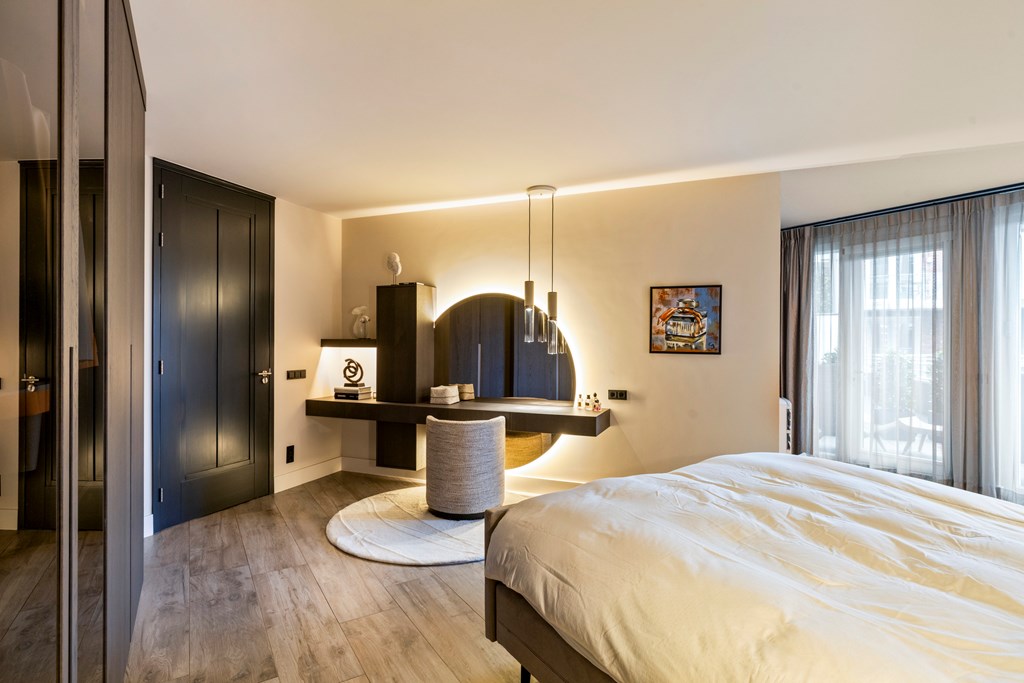 The apartment features several generously sized (bed)rooms. The master bedroom feels like a luxury hotel suite, complete with bespoke wardrobes, and both bedrooms offer direct access to a covered balcony where you can also enjoy the evening sun. The stylish bathroom is spacious and equipped with a rain shower with sunshower function, a vanity unit with double taps, illuminated mirror, wall-mounted toilet, and high-quality finishes down to the finest detail.