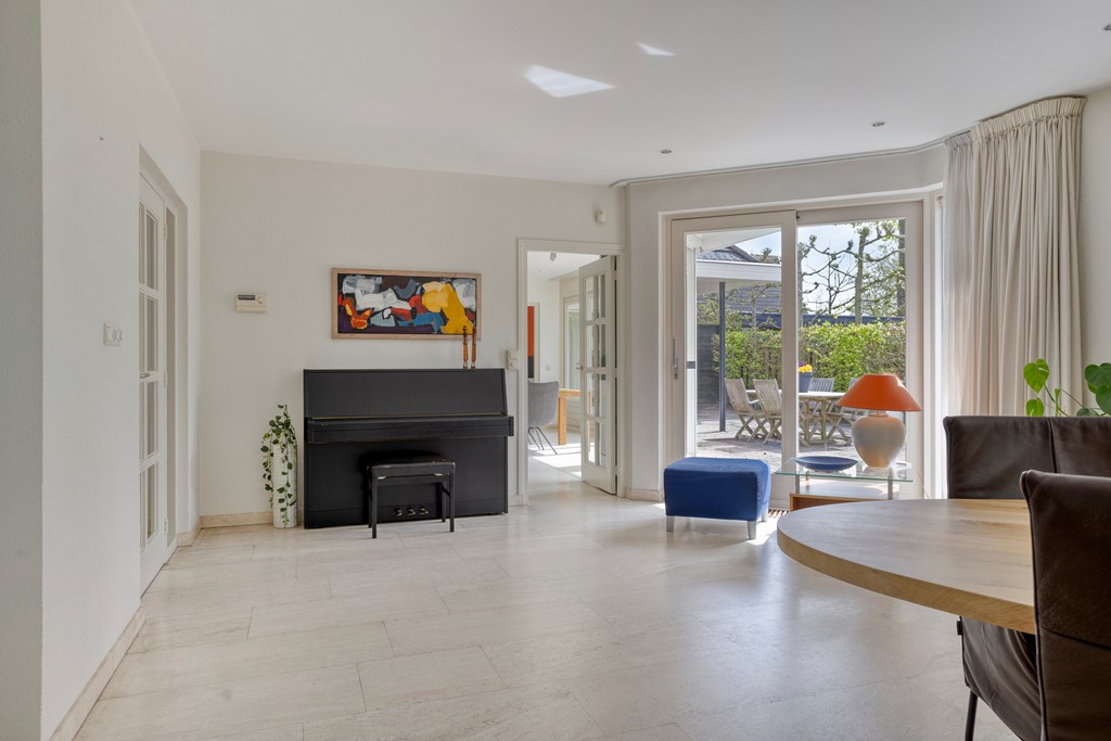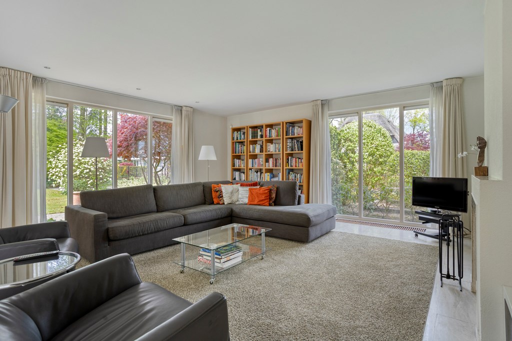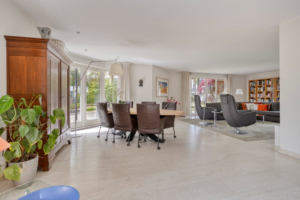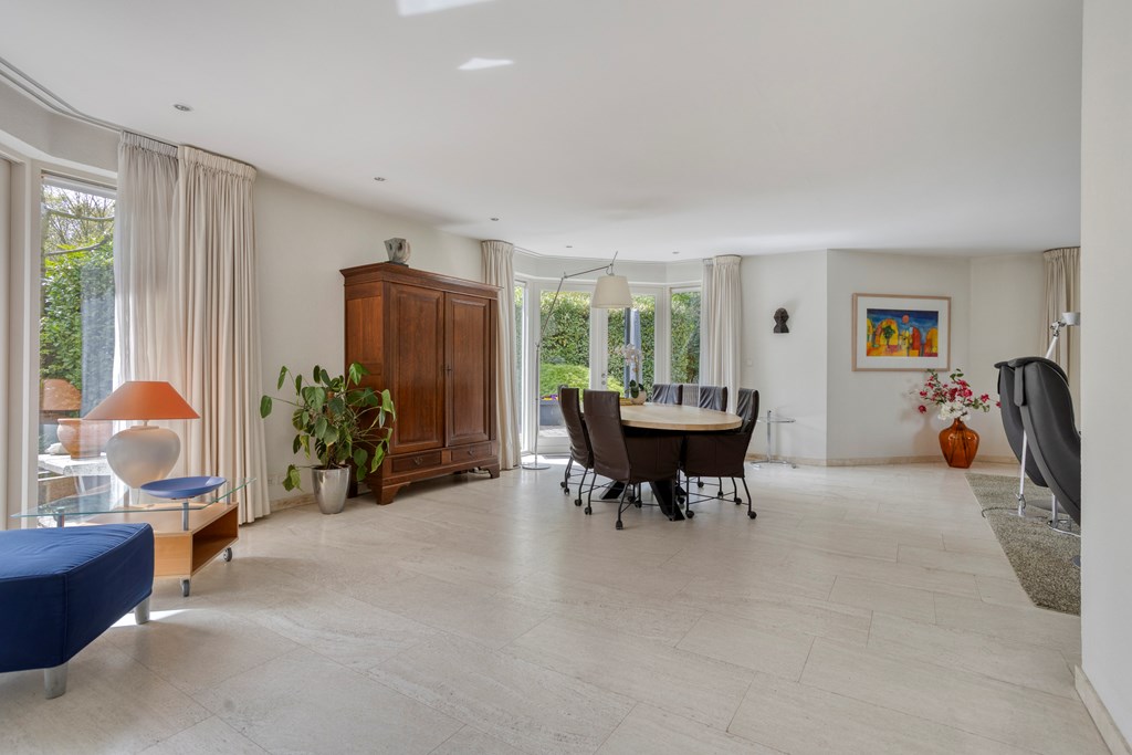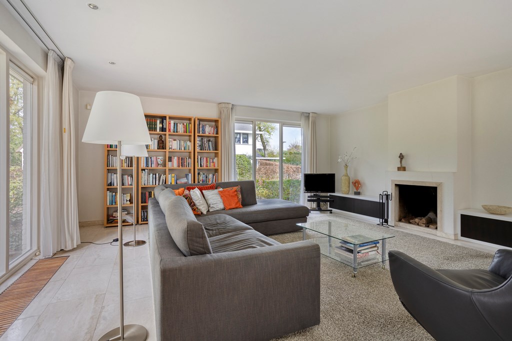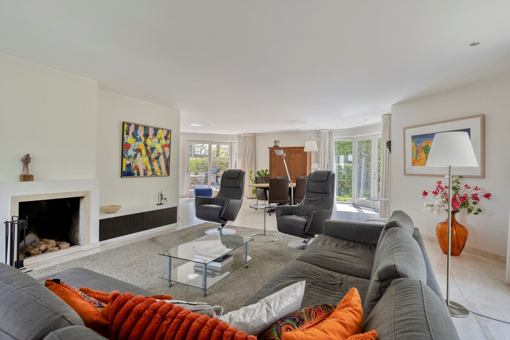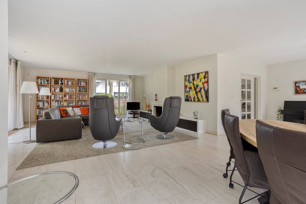The living room is undoubtedly the beating heart of the ground floor. This generously sized space is characterized by its open layout and abundance of natural light. There is plenty of room to create a comfortable seating area and a cozy dining space. The fireplace serves as a true eye-catcher, adding warmth and atmosphere. Through the French doors, the living room is directly connected to the garden, seamlessly blending indoor and outdoor living.