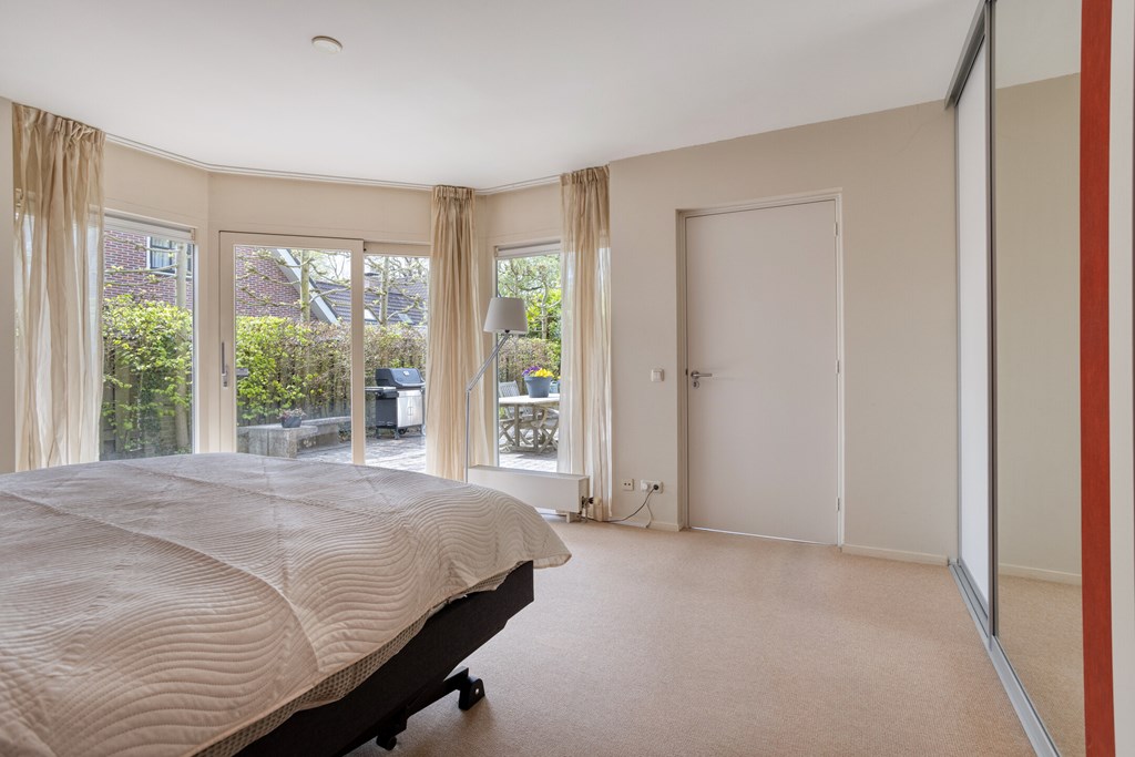 On the ground floor, there is a spacious and well-maintained bedroom. The room is bright and offers sufficient space for a bed, desk, and wardrobe. Thanks to the air conditioning, you can enjoy extra comfort here. The room also provides direct access to the garden, making it particularly appealing.