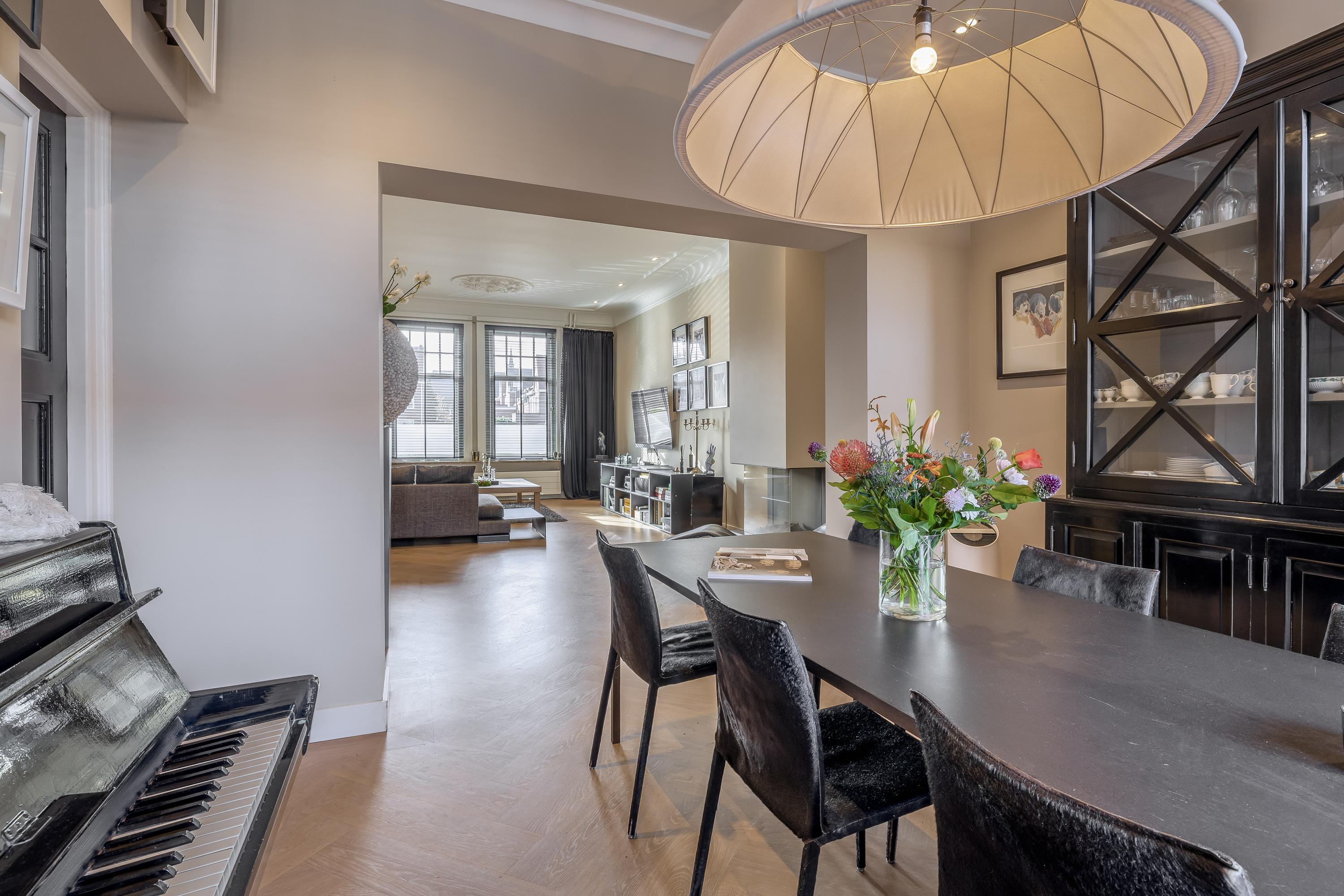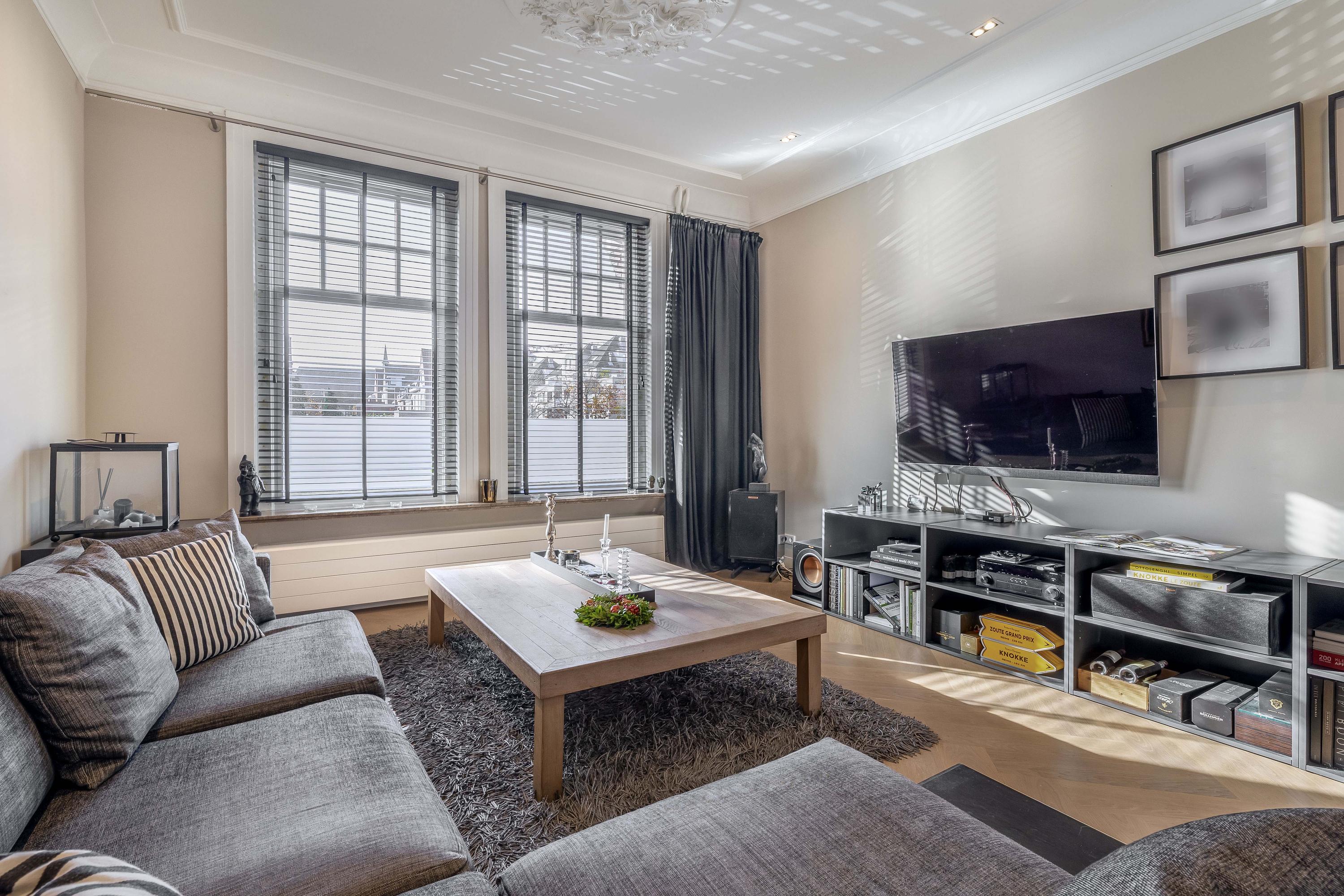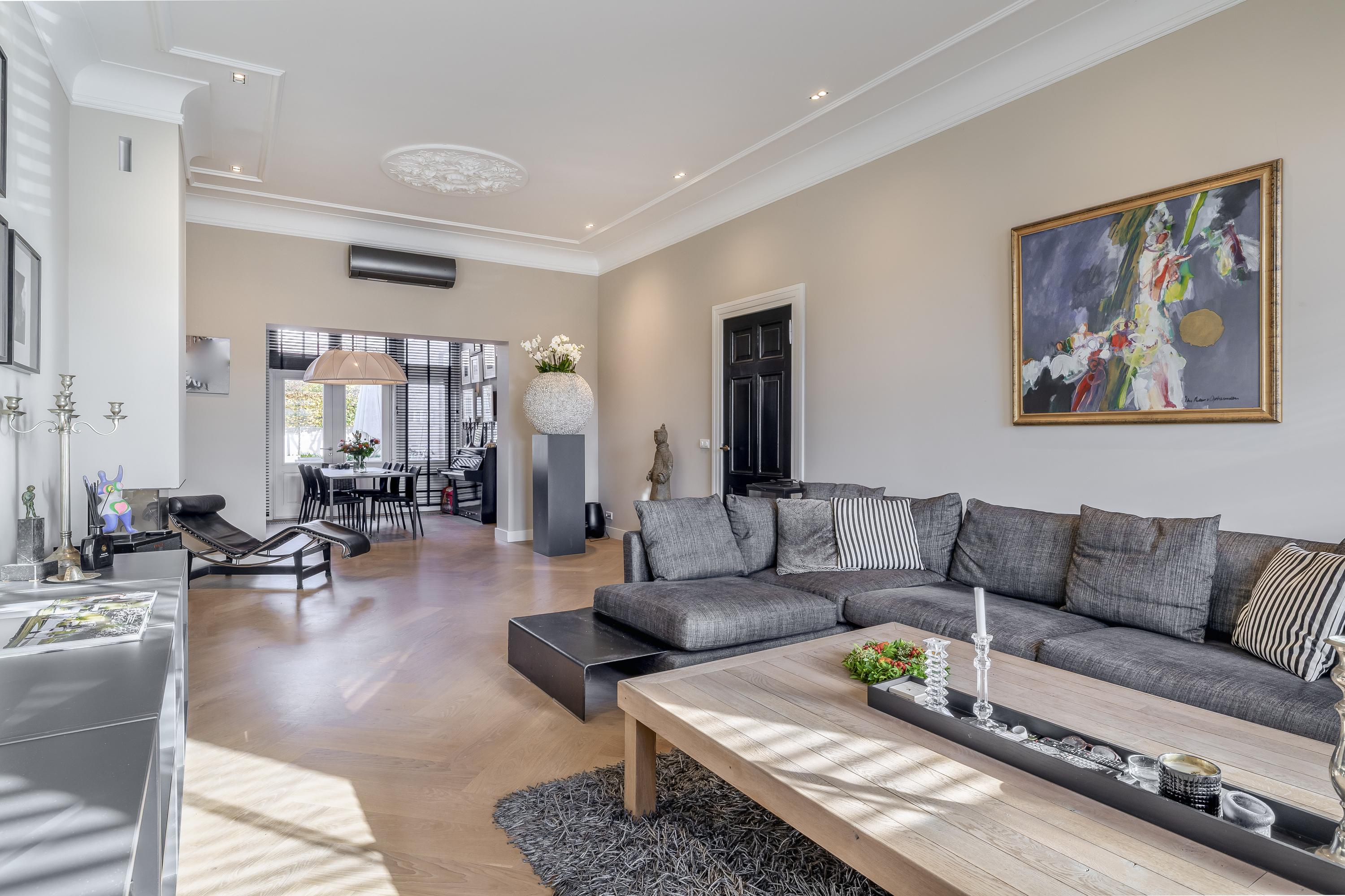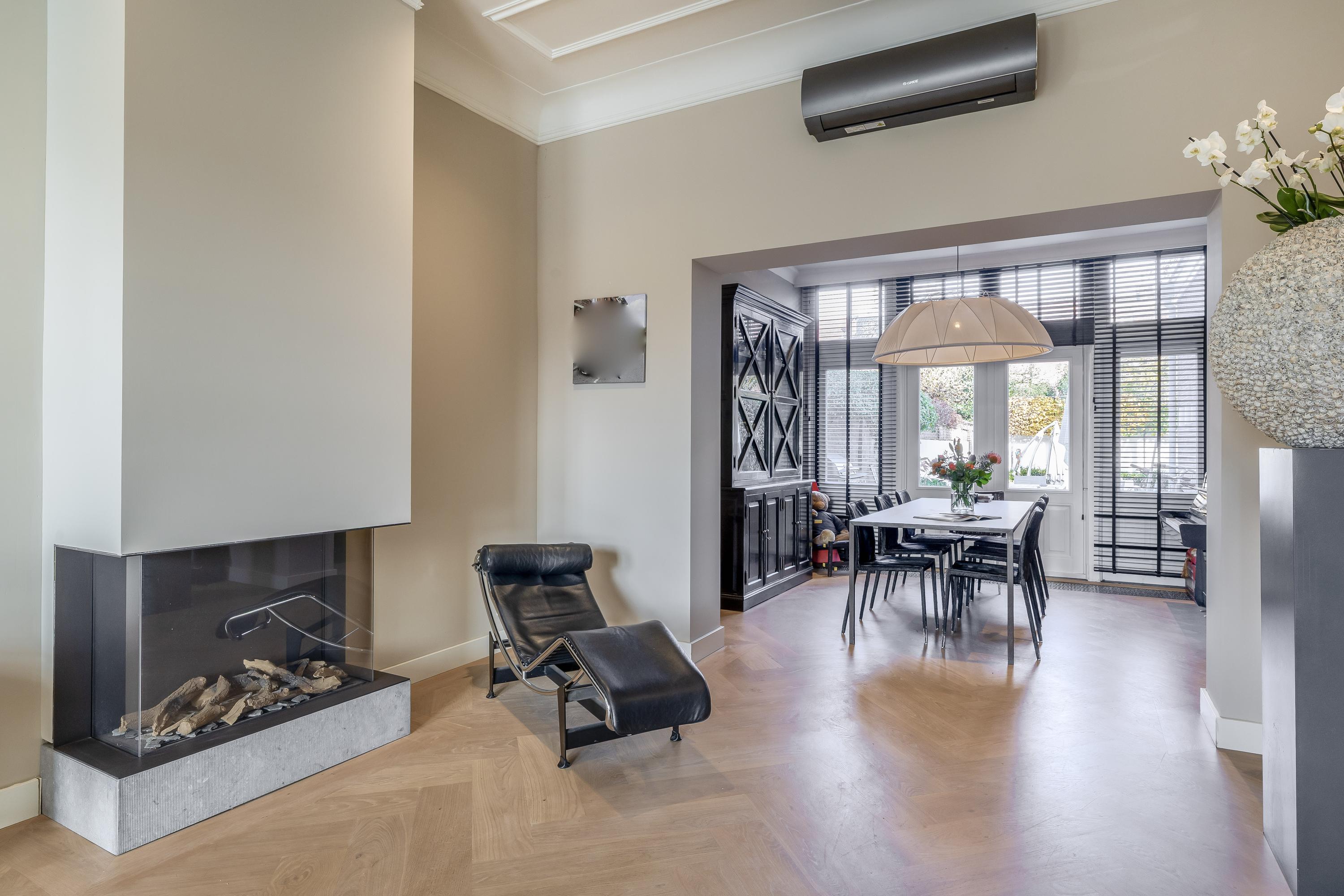 The deep and wide living room is fitted with extra-wide French oak herringbone parquet flooring. The impressive high ceiling features original ornaments and cornices with integrated dimmable lighting. At the front, you enjoy unobstructed views of the Rosarium. A gas fireplace adds extra ambience, while the air conditioning provides both cooling and heating. Due to the raised position of the windows relative to the pavement, there is no visibility from outside. At the rear, French doors open directly onto the garden.