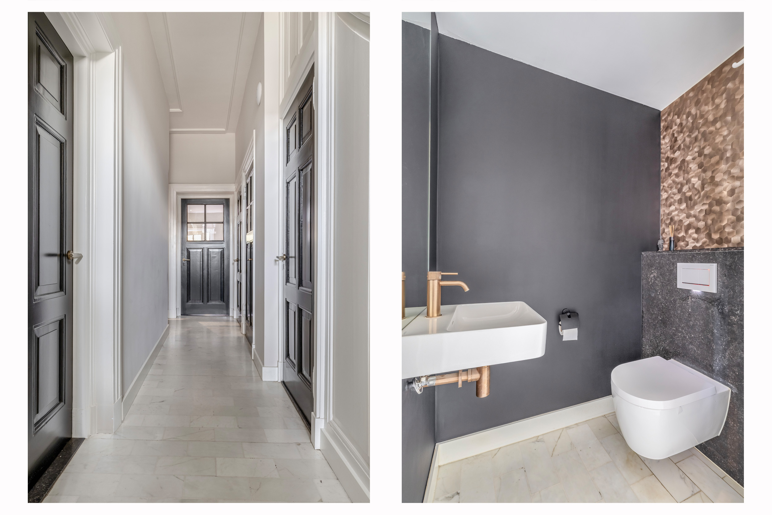 The wide entrance hall features a Bianco Carrara marble tile floor. From here, you have access to the basement, the toilet with washbasin, and a storage cupboard housing the heat pump and central heating boiler.