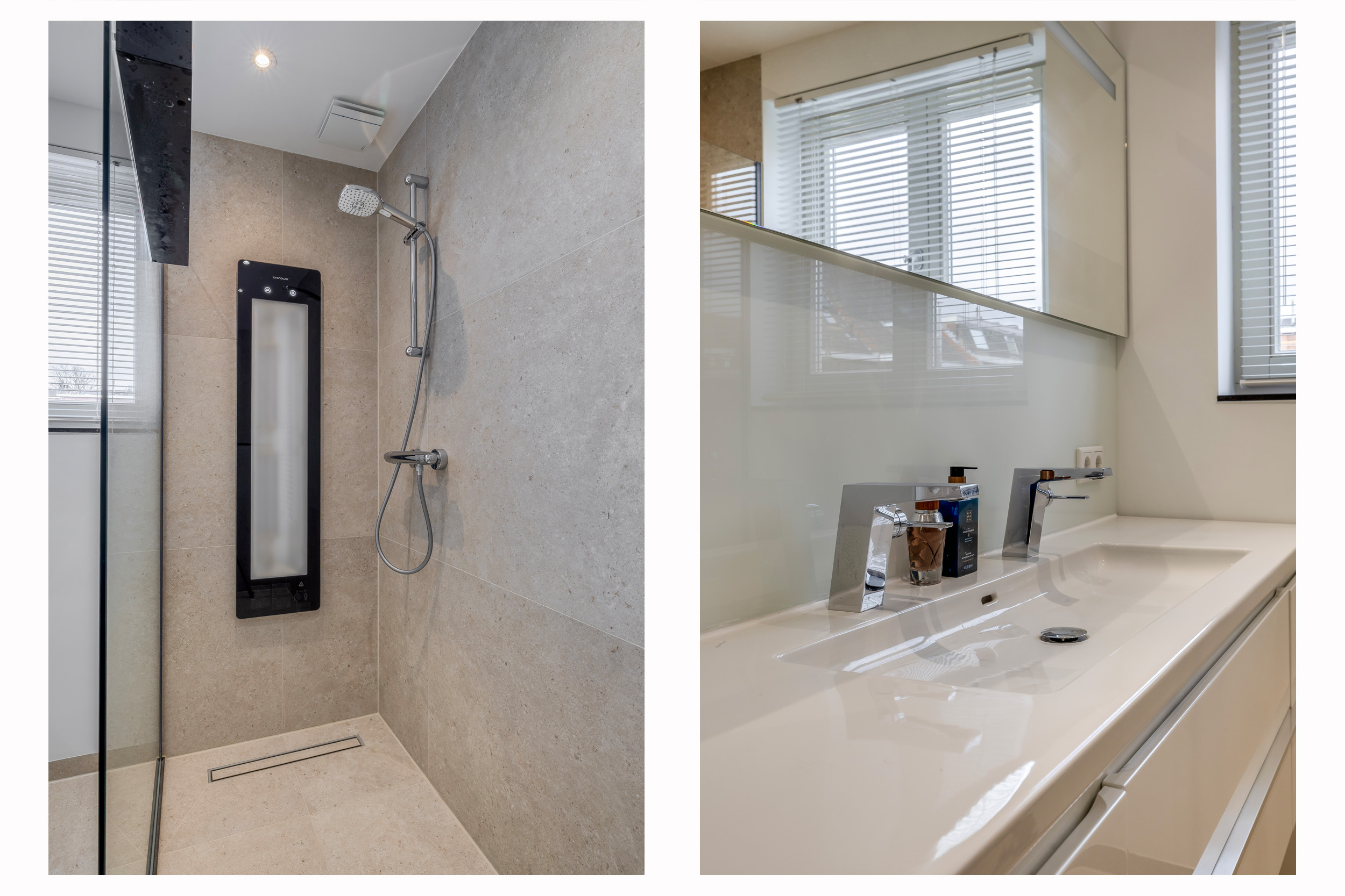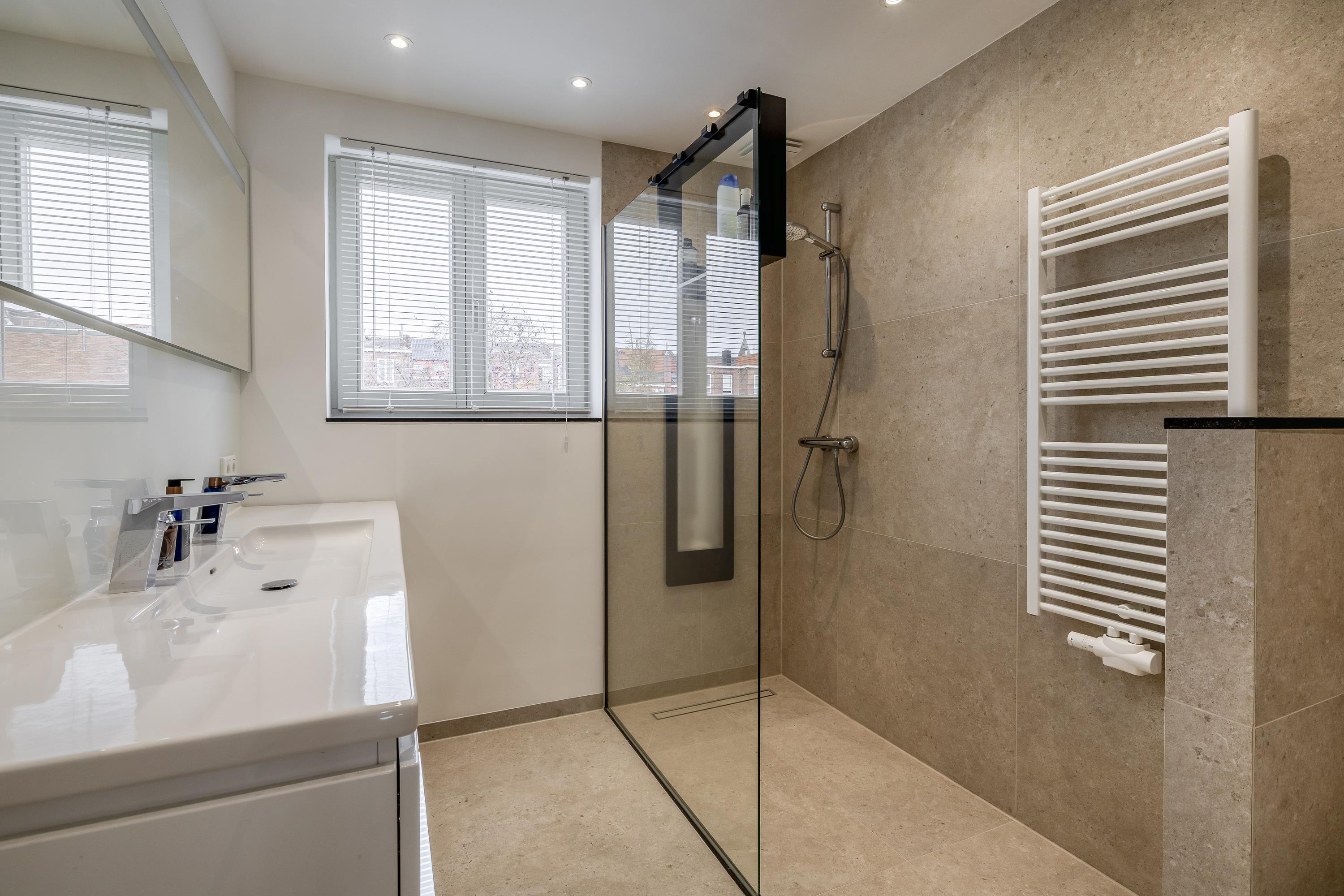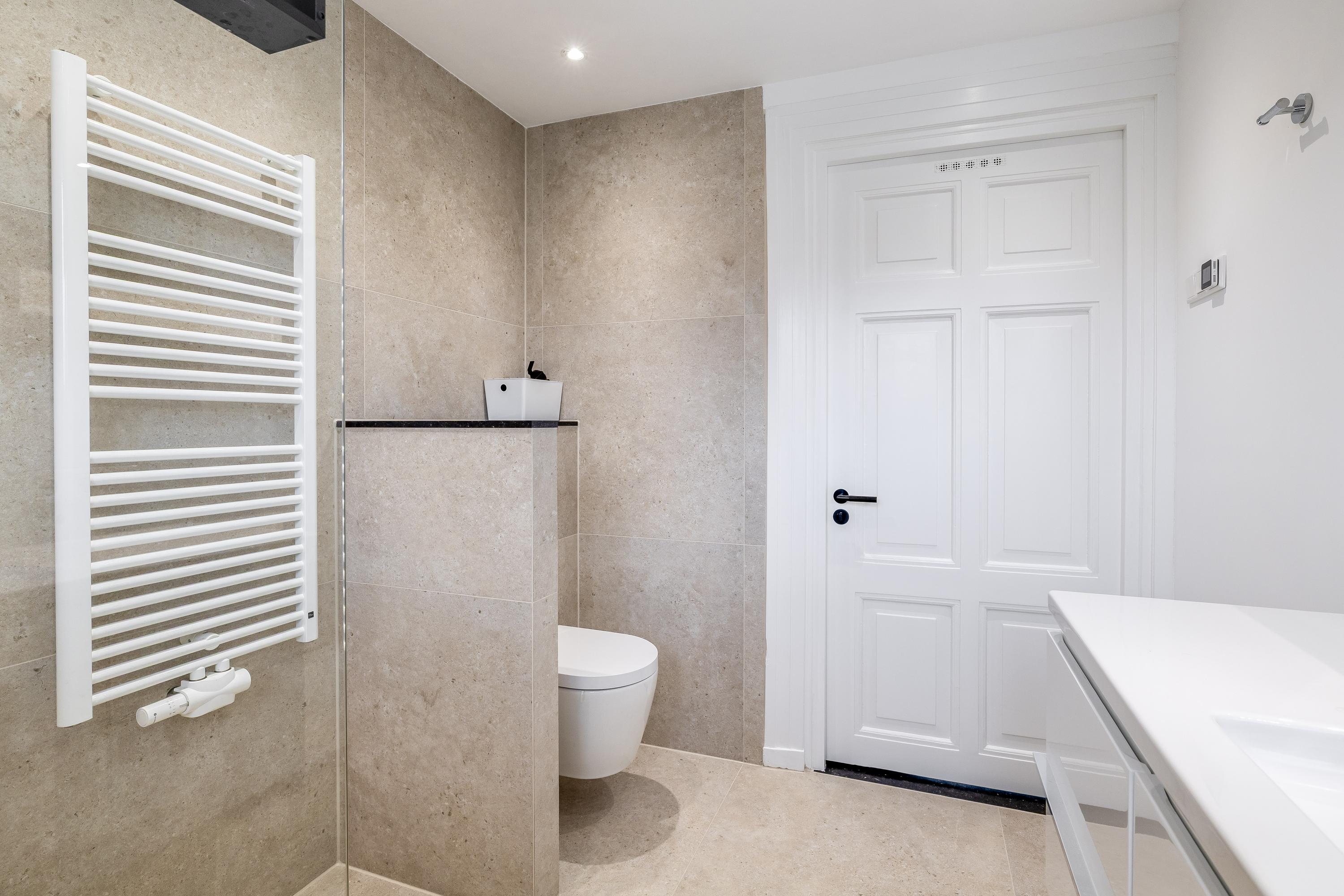 The large, high-quality bathroom (renovated in 2025) features a spacious walk-in shower with sunshower, toilet, double washbasin unit, designer radiator and mechanical ventilation. The tiled floor includes electric underfloor heating.