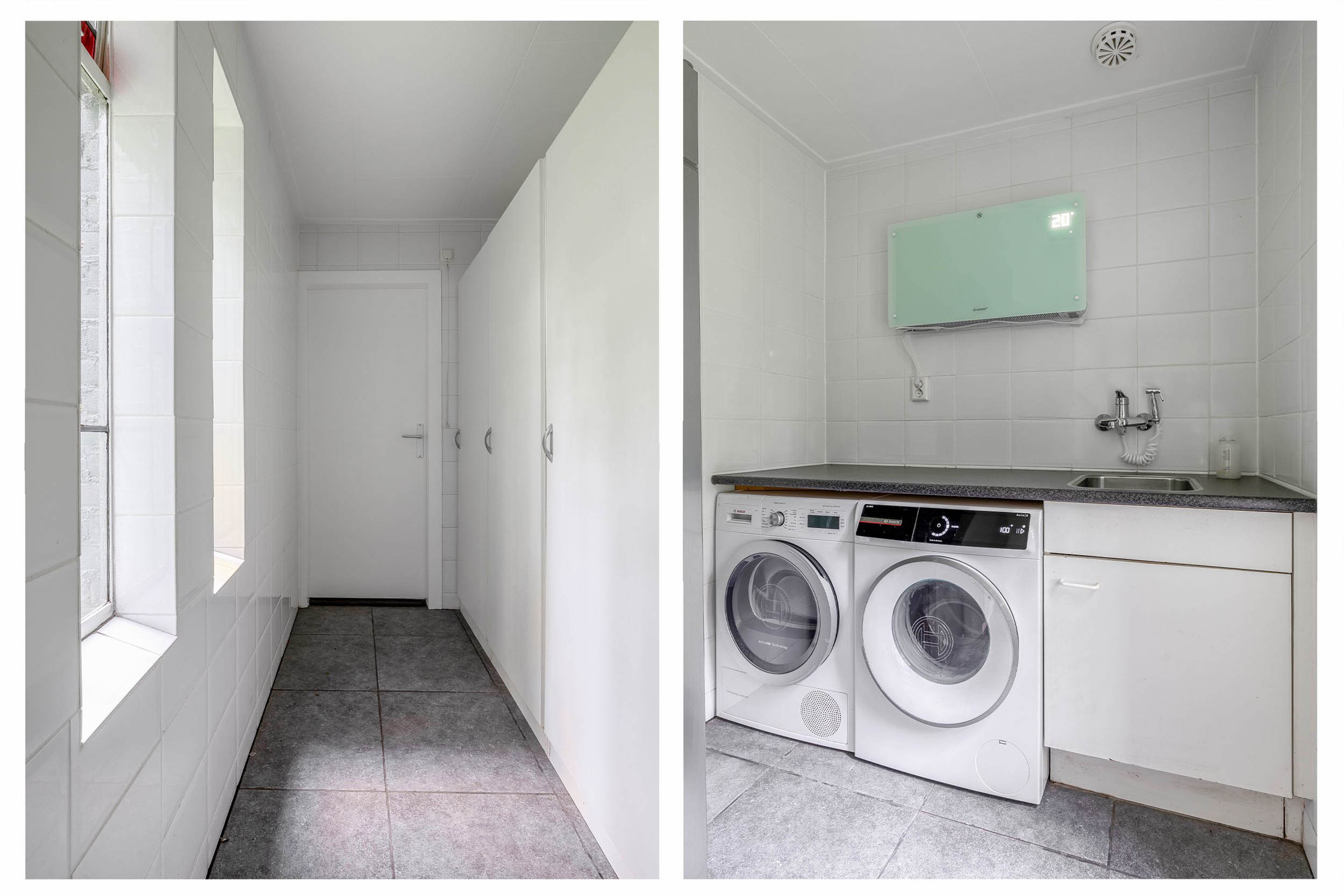 Here you will find not only a handy storage room with a renewed meter cupboard 3x25A and 12 groups, a sink, and the inverter for the solar panels, but also a laundry room with a sink, space for a washing machine and dryer, storage cupboards, and a fully tiled toilet with a washbasin and mechanical ventilation.