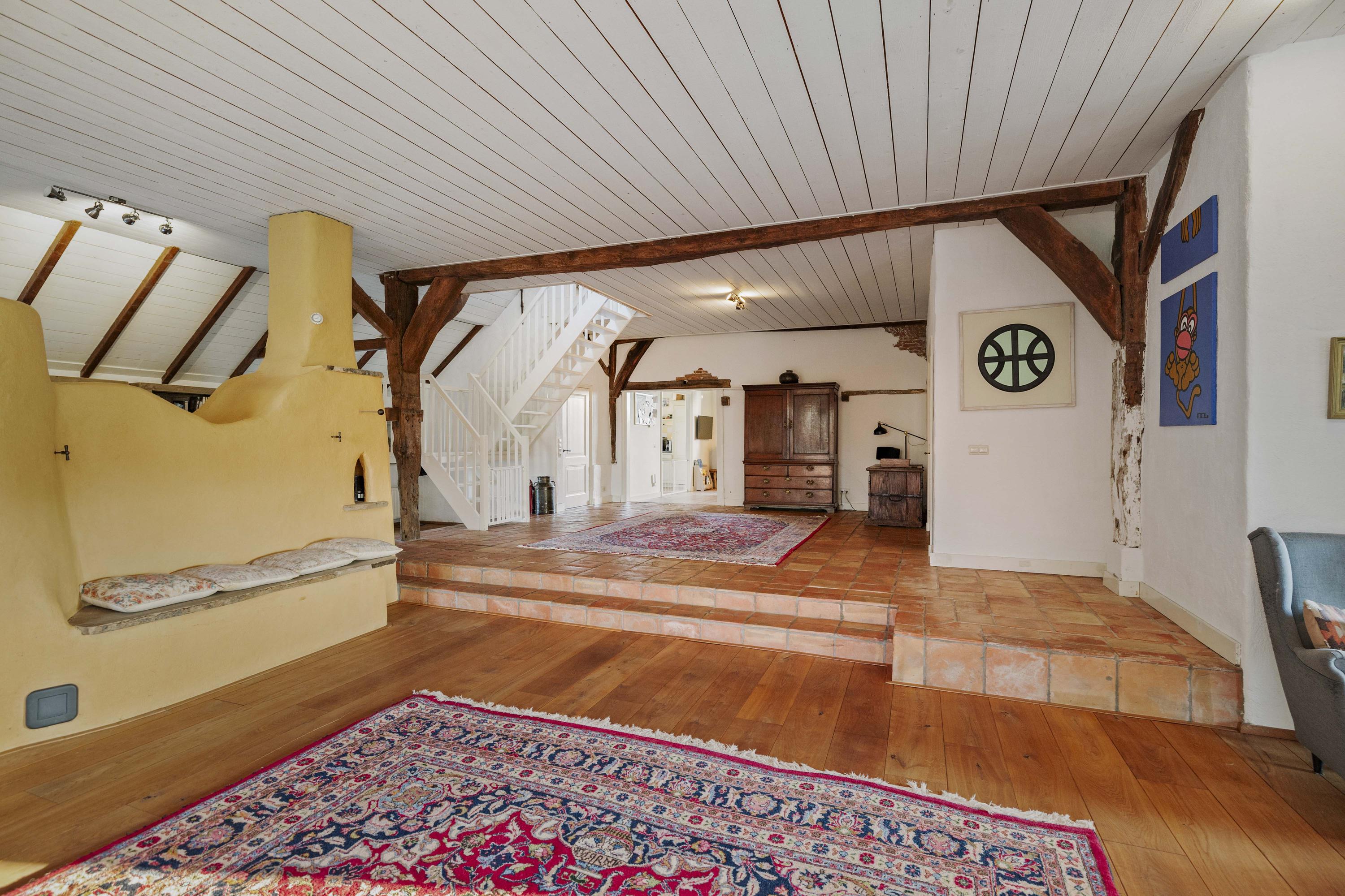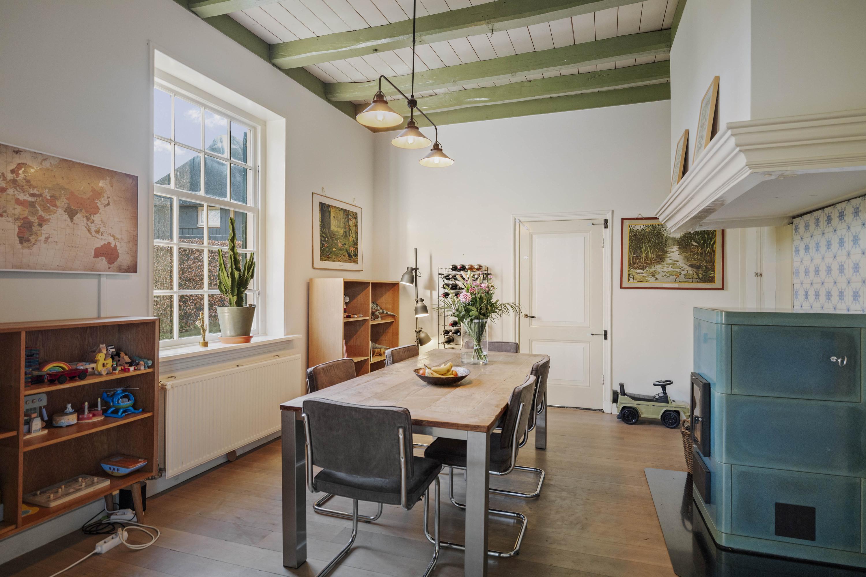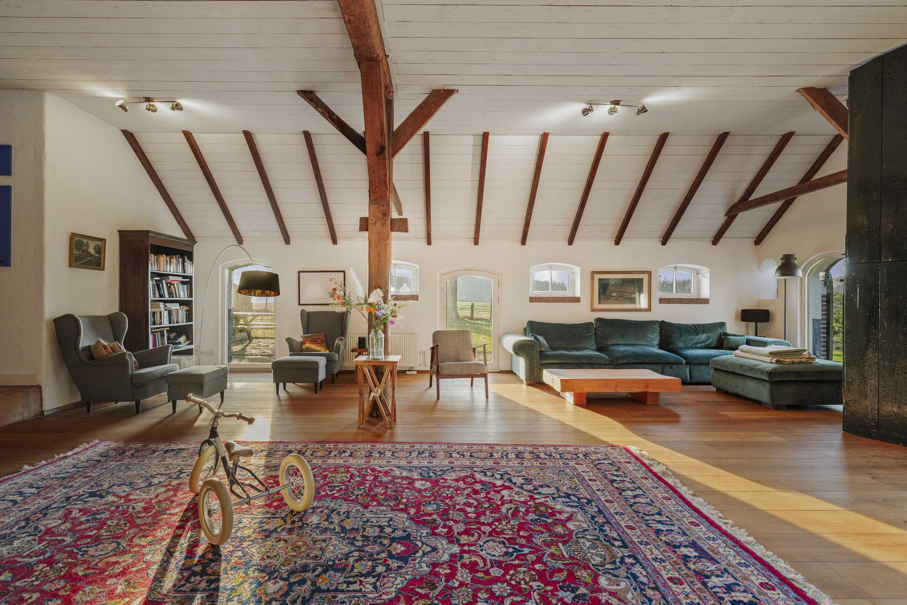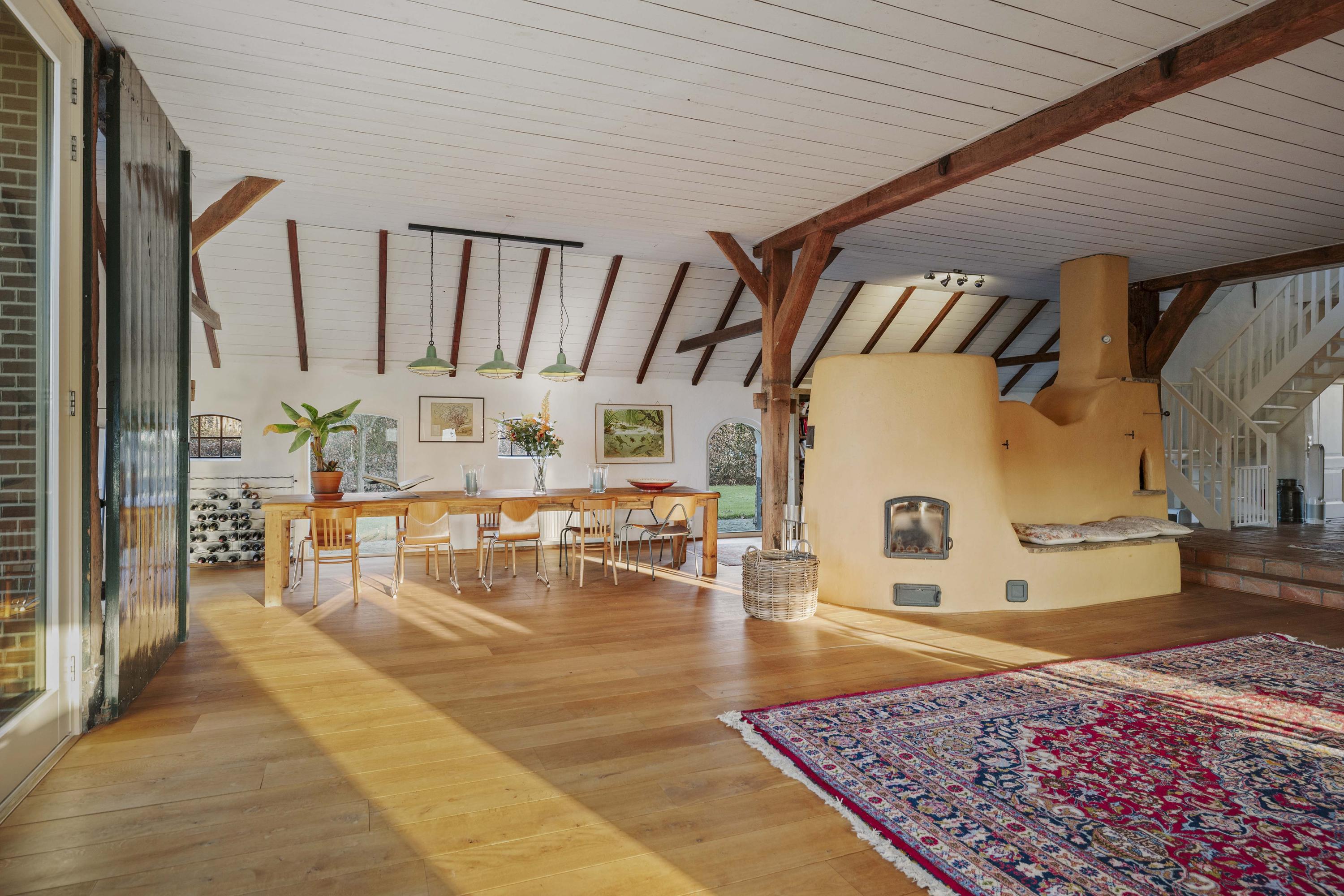 The barn is a fantastic space: over 150 m² of living space, brimming with atmosphere and rural charm. The floor is covered with oak planks and the old trusses still stand proudly in the room. In the heart of the space is a beautiful clay stove. These stoves are loved for their efficient heating, because in addition to keeping the living room warm, they also heat the water. The barn doors—the opening is now filled with glass—have been moved back on the inside and are a reminder of the barn's former function, as this is where the cows used to stand.