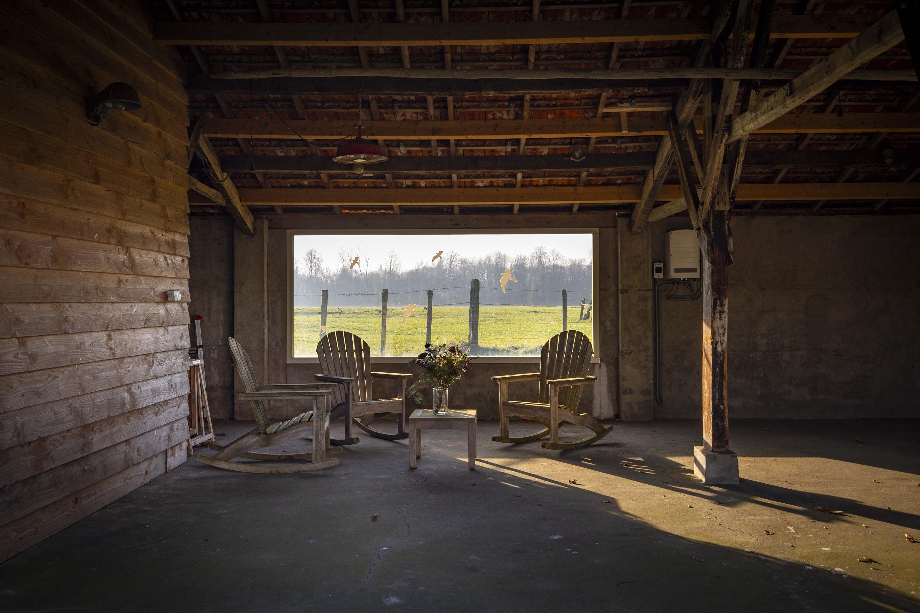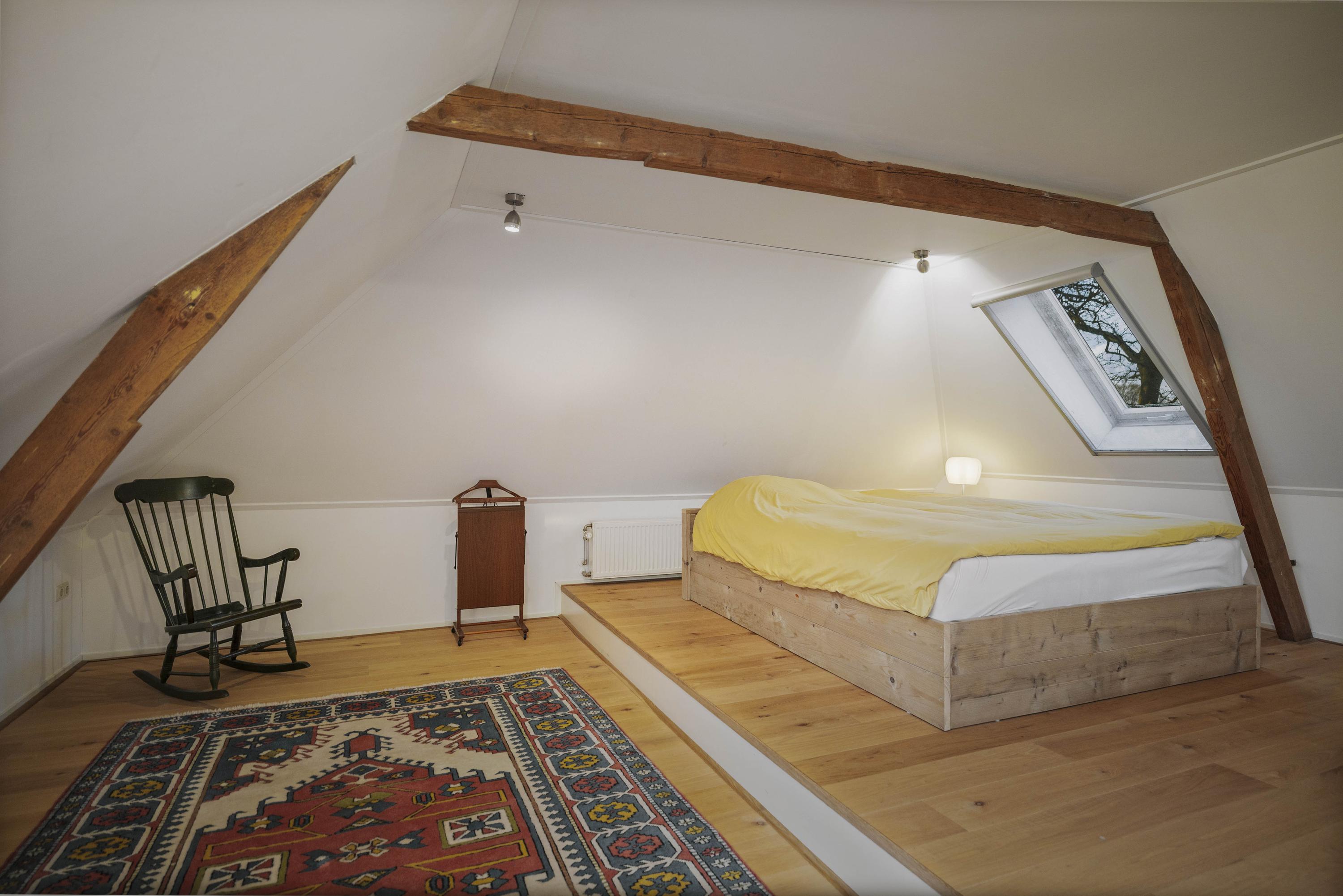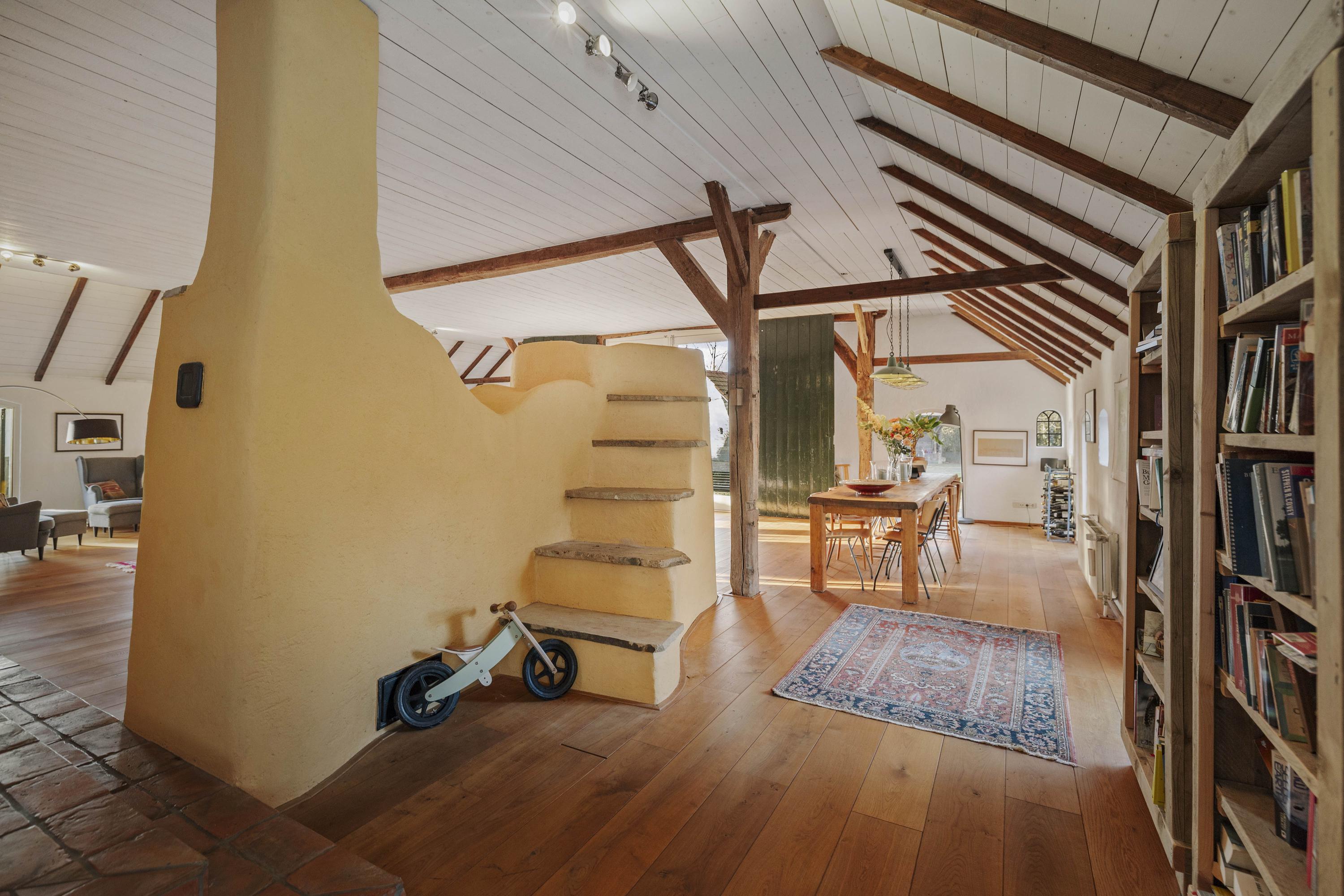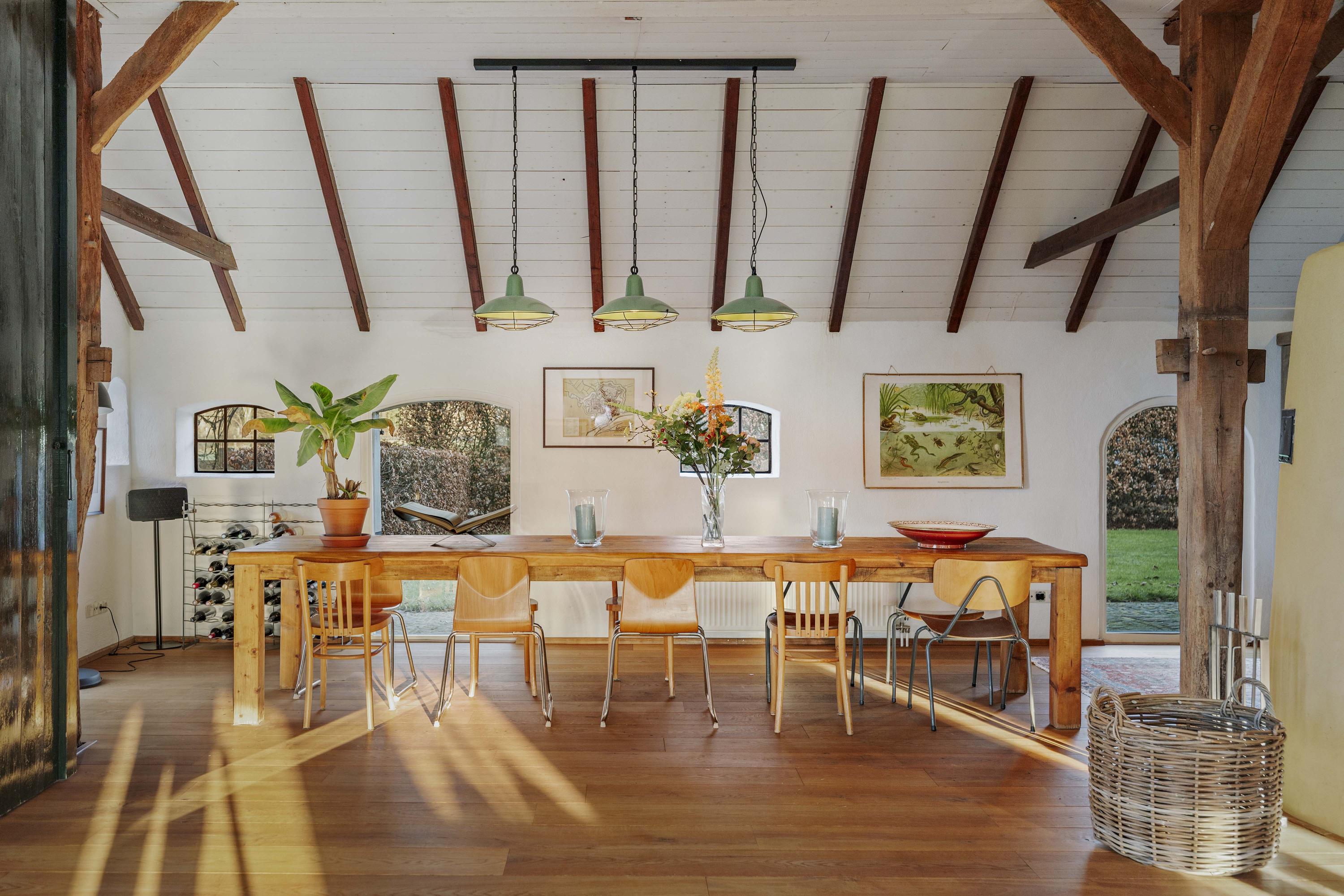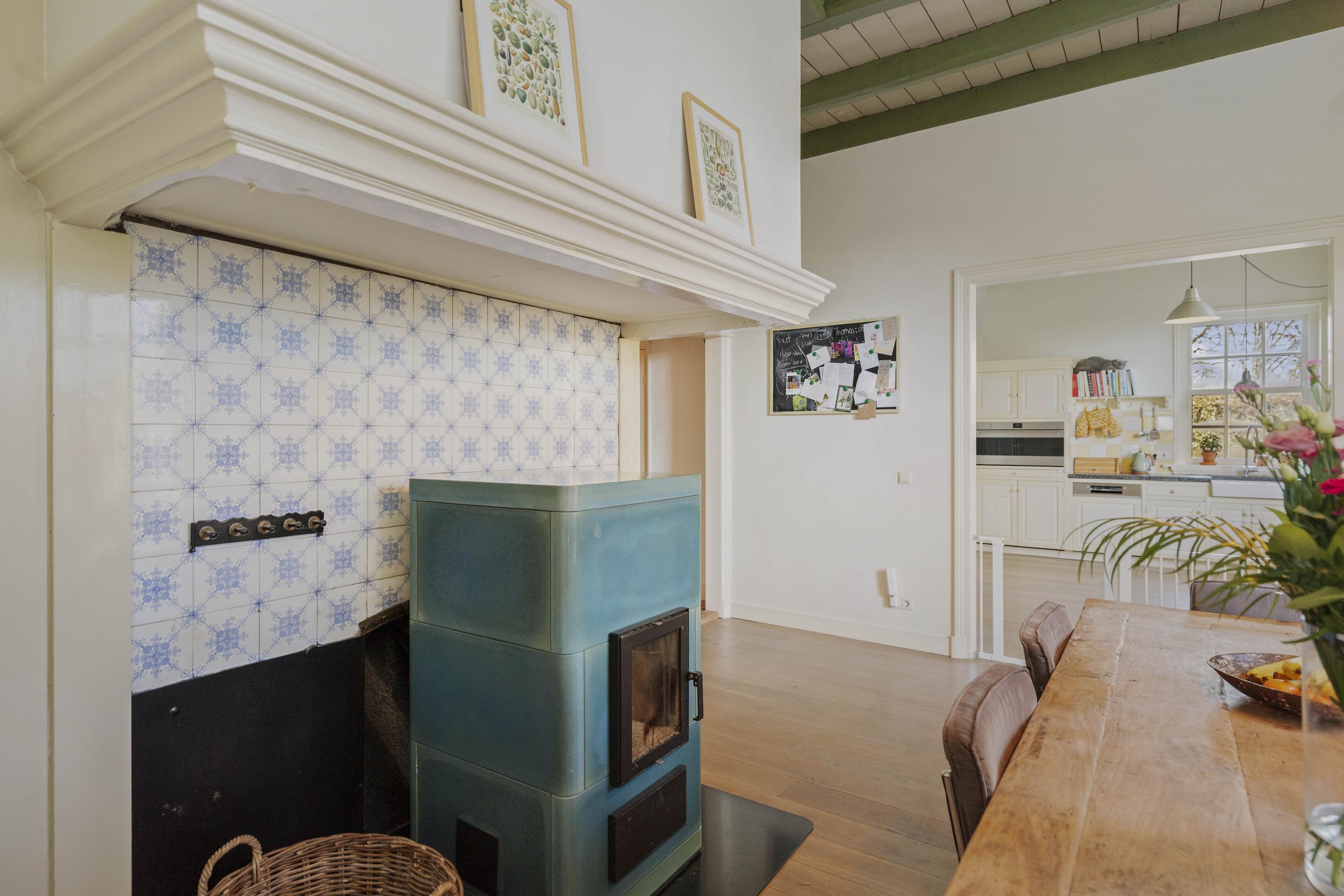 The barn is a fantastic space: over 150 m² of living space, brimming with atmosphere and rural charm. The floor is covered with oak planks and the old trusses still stand proudly in the room. In the heart of the space is a beautiful clay stove. These stoves are loved for their efficient heating, because in addition to keeping the living room warm, they also heat the water. The barn doors—the opening is now filled with glass—have been moved back on the inside and are a reminder of the barn's former function, as this is where the cows used to stand.