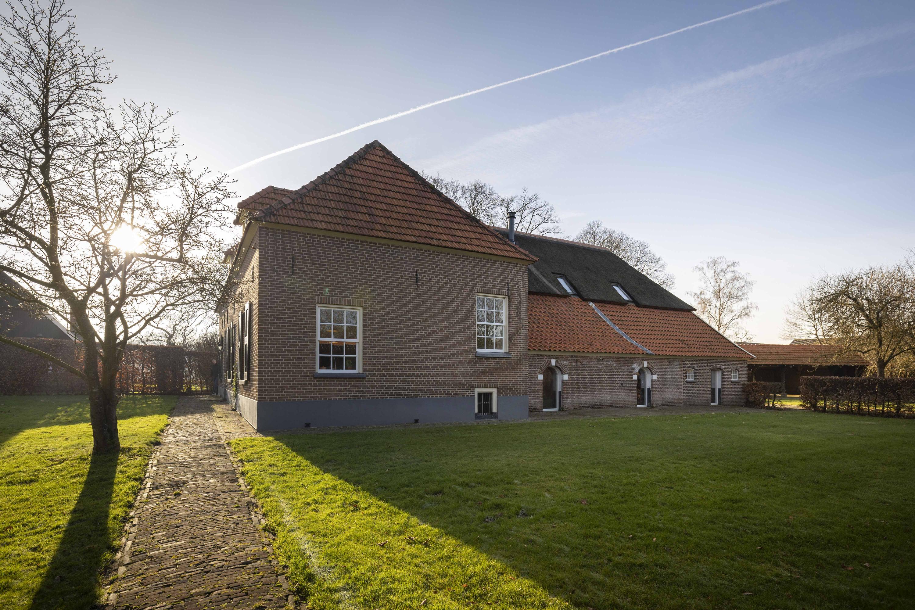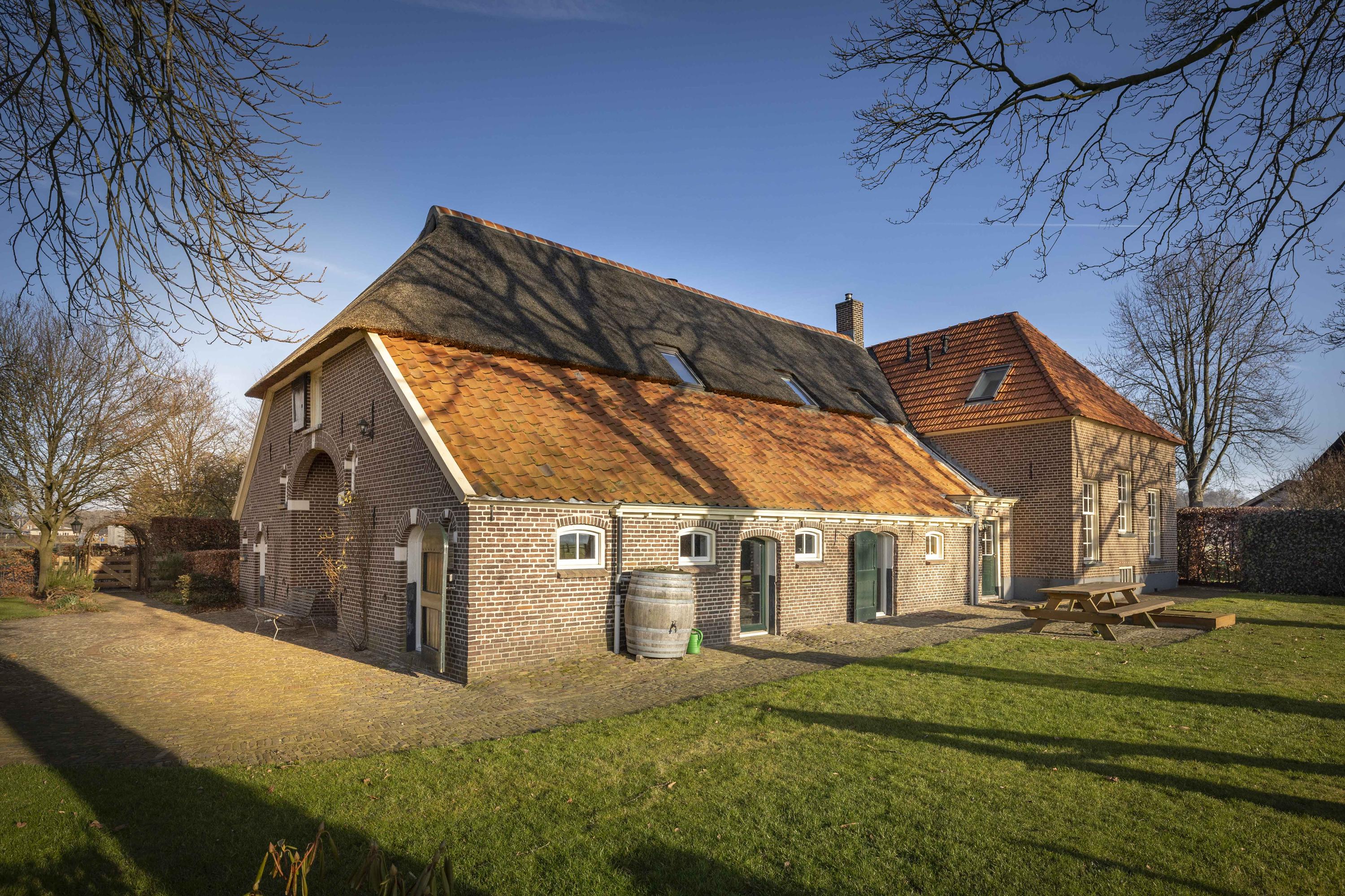 In the sunshine, the house shines out at you, with its fresh red tiles, neat joints, thatched roof (renovated in 2021), and beautiful woodwork covered in thick varnish. Despite its long history, Erve 't Norde is also completely up to date under the hood: the current residents have made the farm sustainable from top to bottom, with thick insulation, HR++ glass, 45 solar panels, and a super-efficient clay stove, making it ready for the next 163 years.