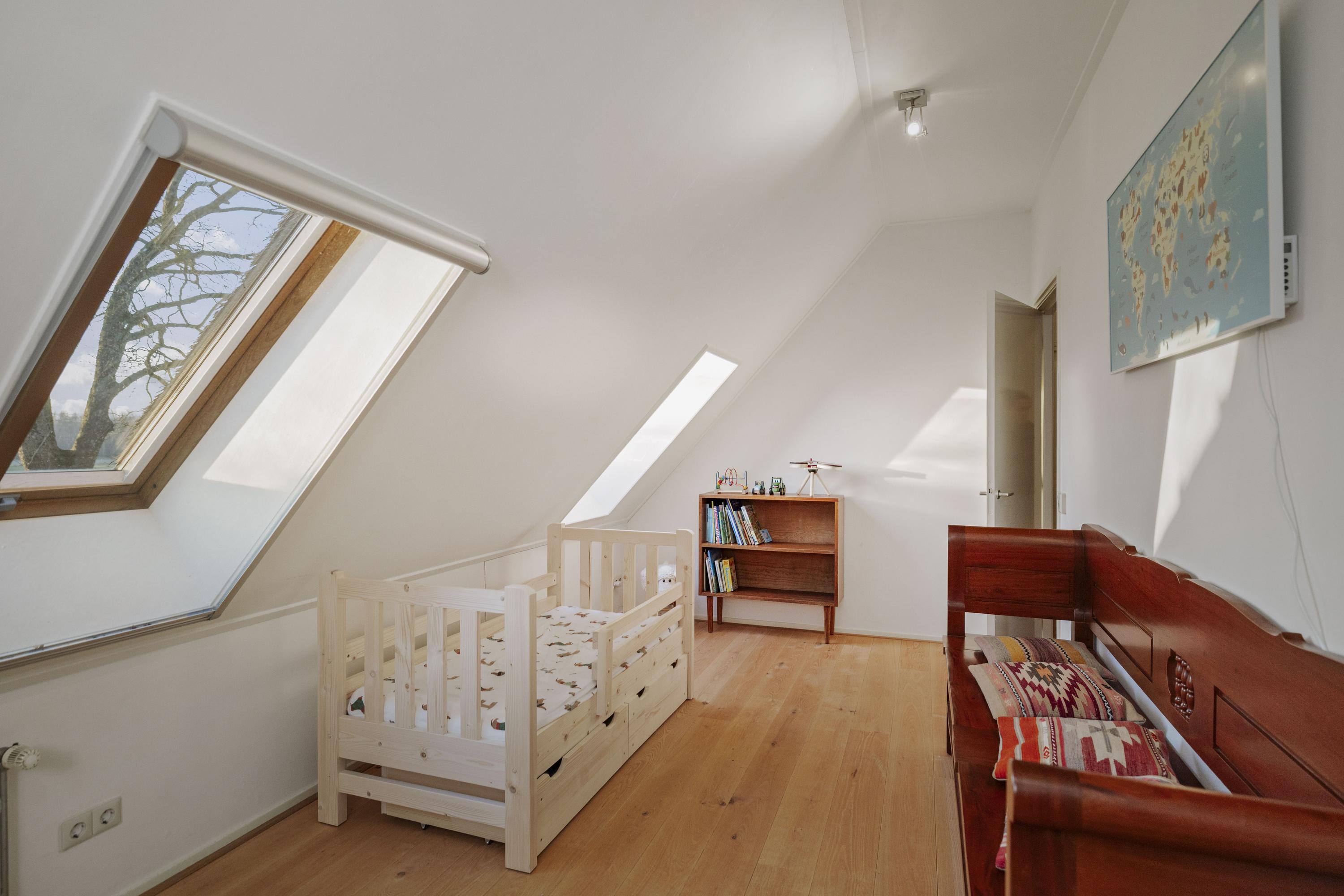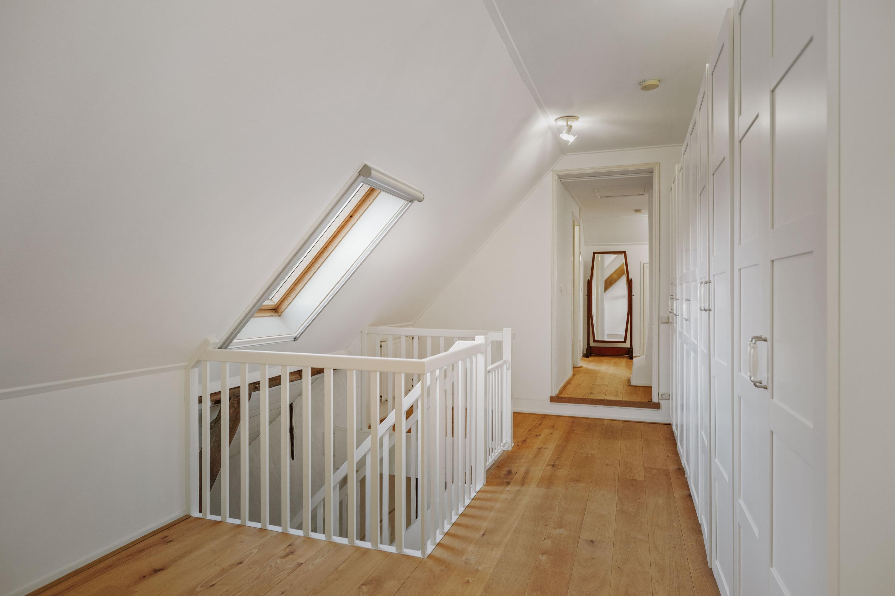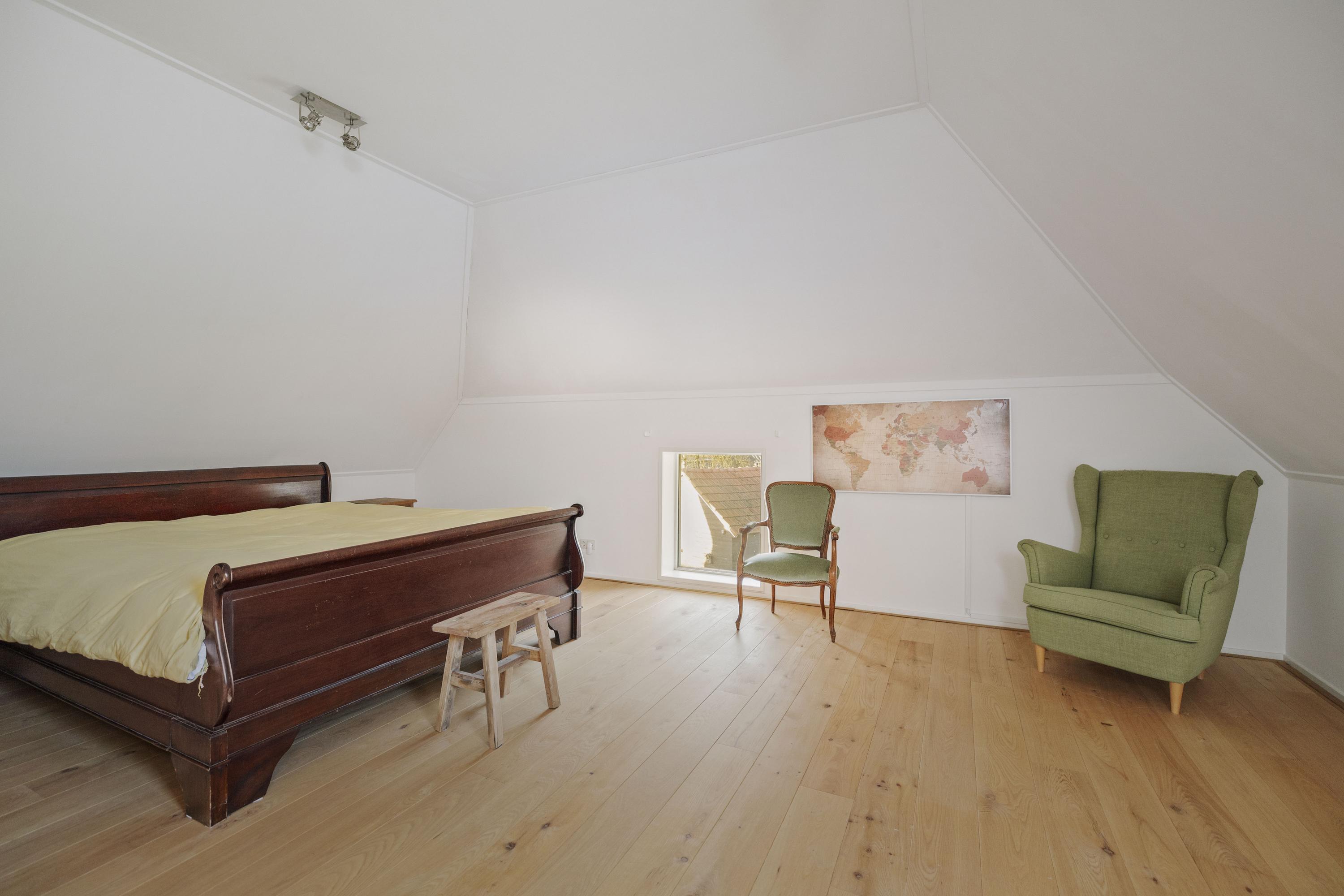 Five spacious bedrooms are located off the spacious and sunny landing, which has red oak plank flooring. The master bedroom has its own bathroom with a walk-in shower, toilet, and sink. The front part of the house also houses the laundry/utility room, with connections for the washing machine and dryer, the boiler and buffer tank, and a 120-liter boiler, as well as a practical storage room. Here you will also find the second bathroom, with double sinks, a spacious walk-in shower, and a toilet.