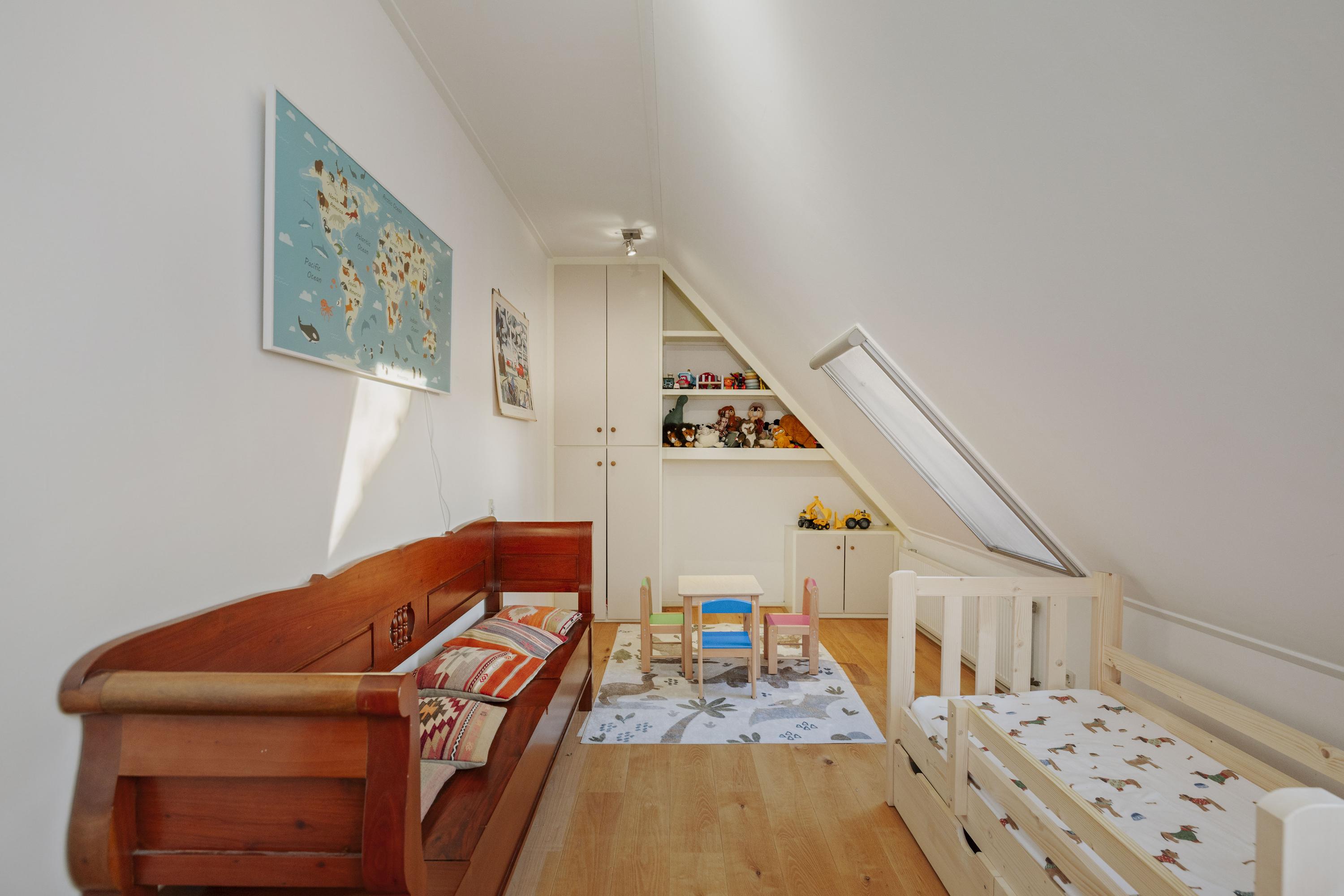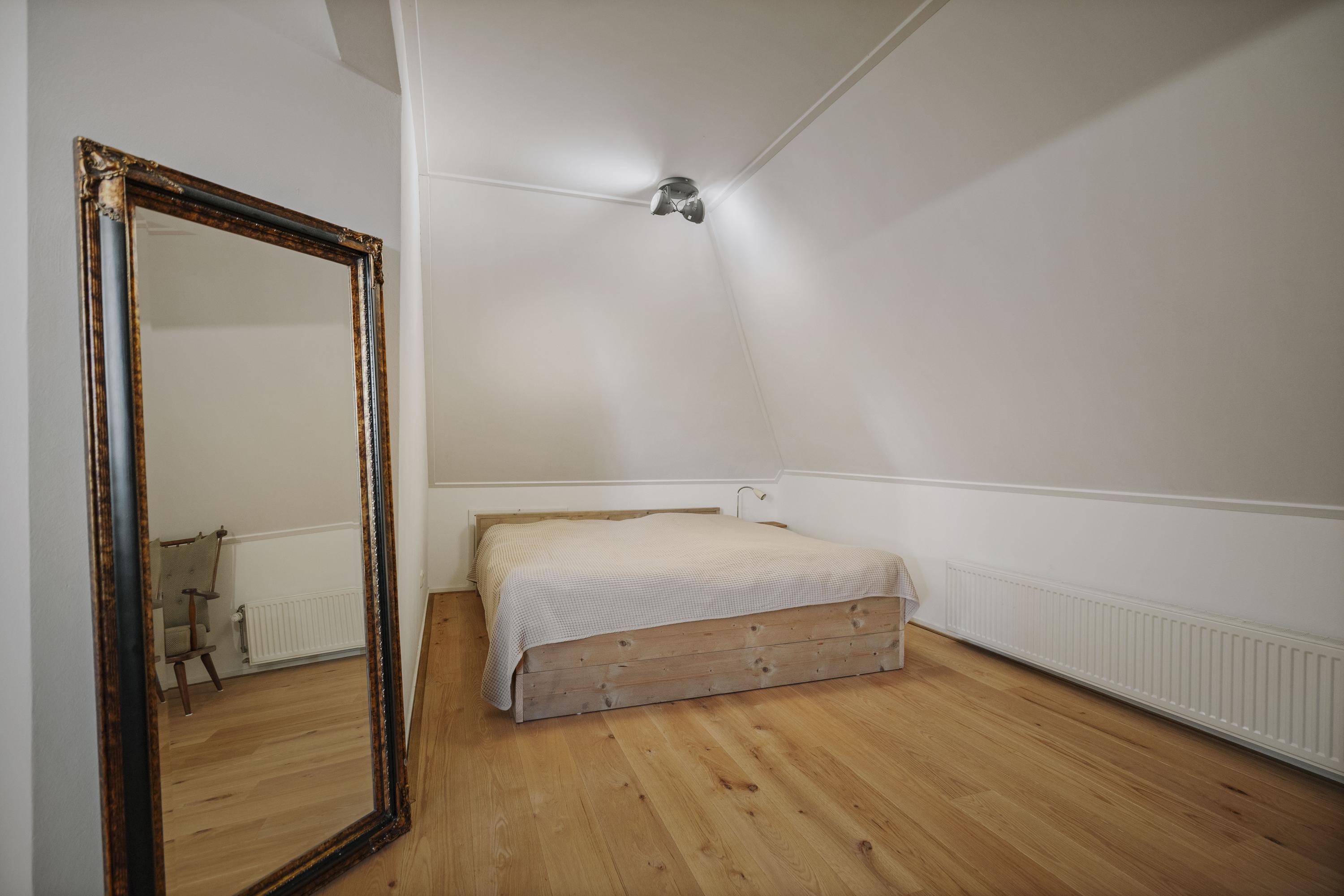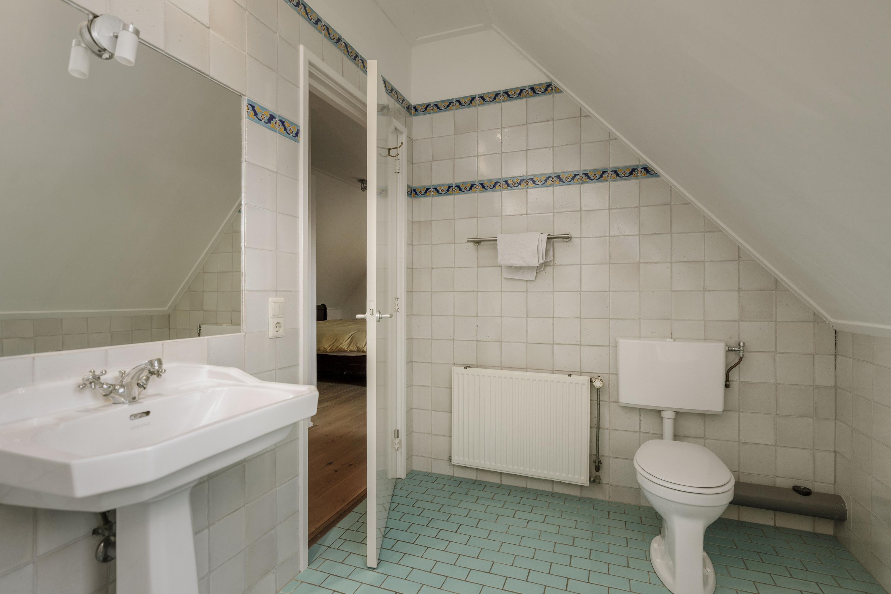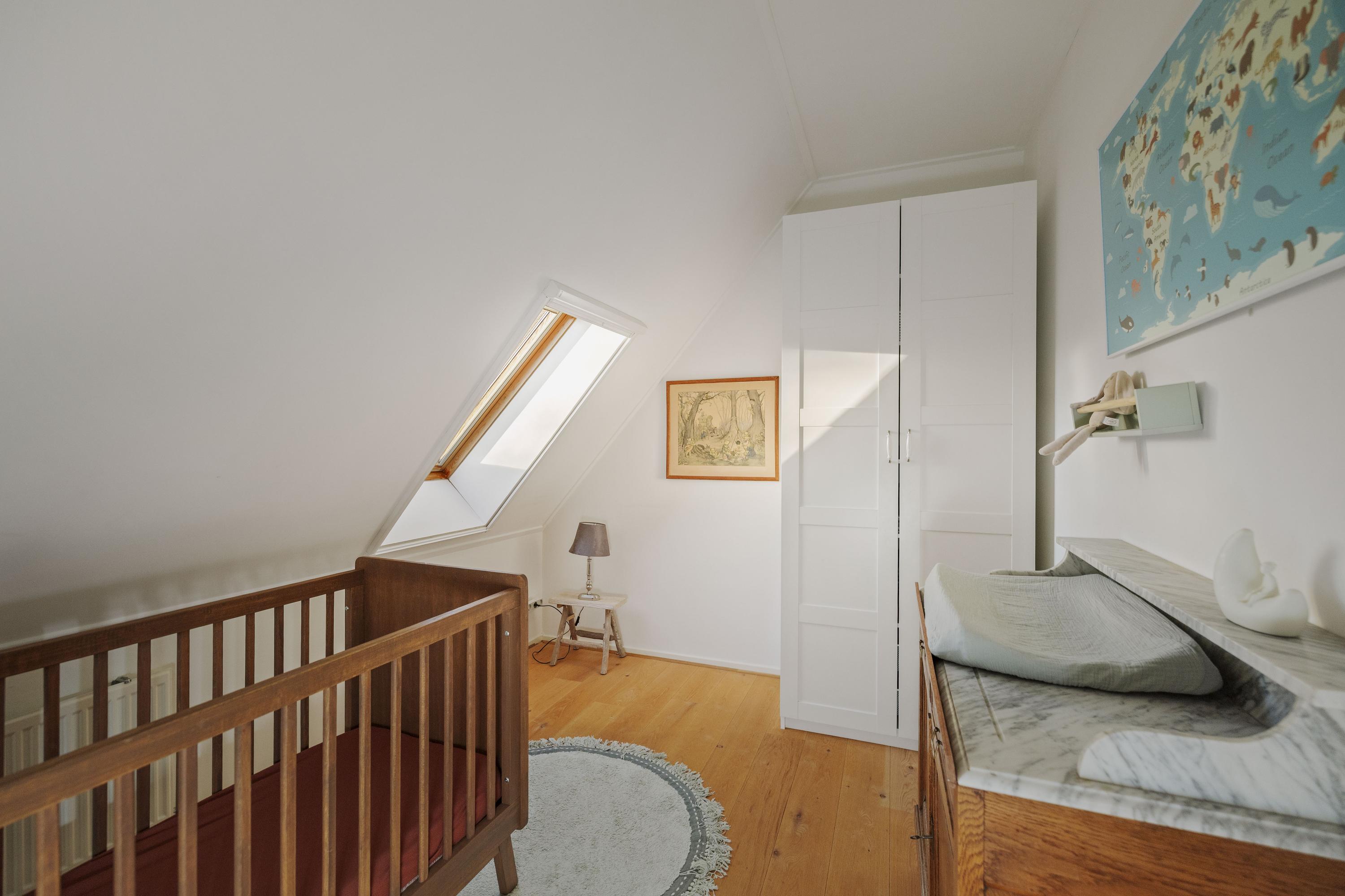 Five spacious bedrooms are located off the spacious and sunny landing, which has red oak plank flooring. The master bedroom has its own bathroom with a walk-in shower, toilet, and sink. The front part of the house also houses the laundry/utility room, with connections for the washing machine and dryer, the boiler and buffer tank, and a 120-liter boiler, as well as a practical storage room. Here you will also find the second bathroom, with double sinks, a spacious walk-in shower, and a toilet.