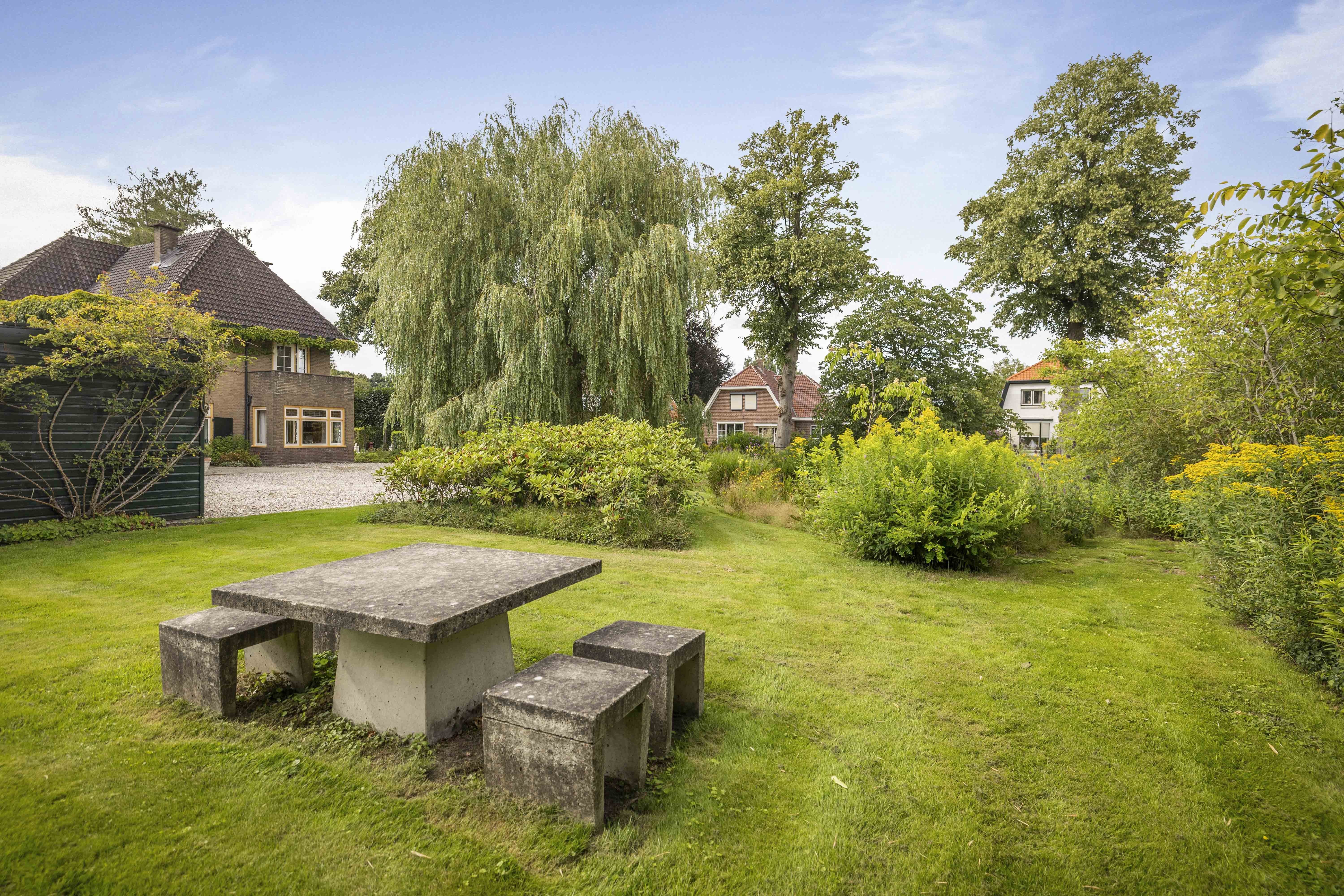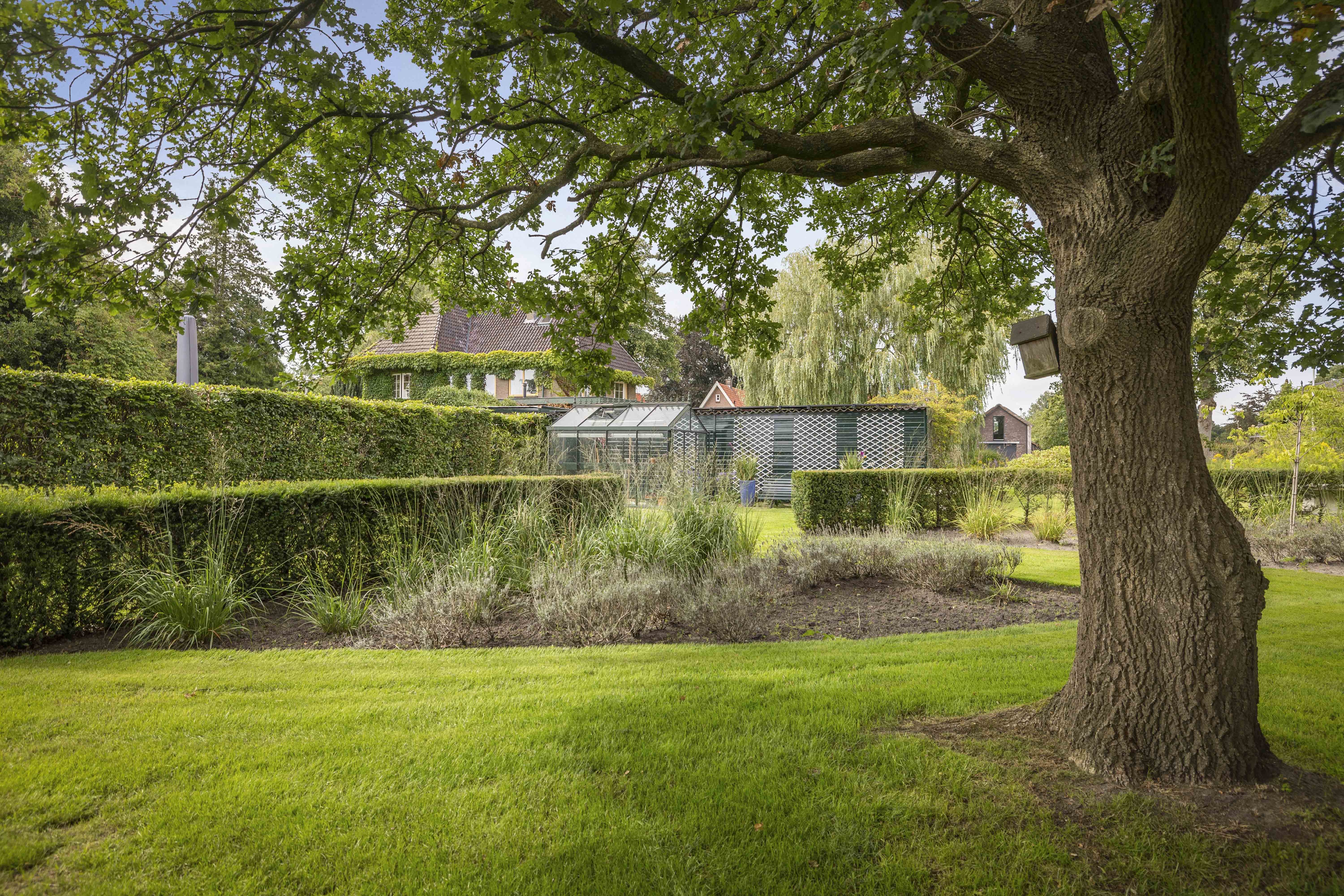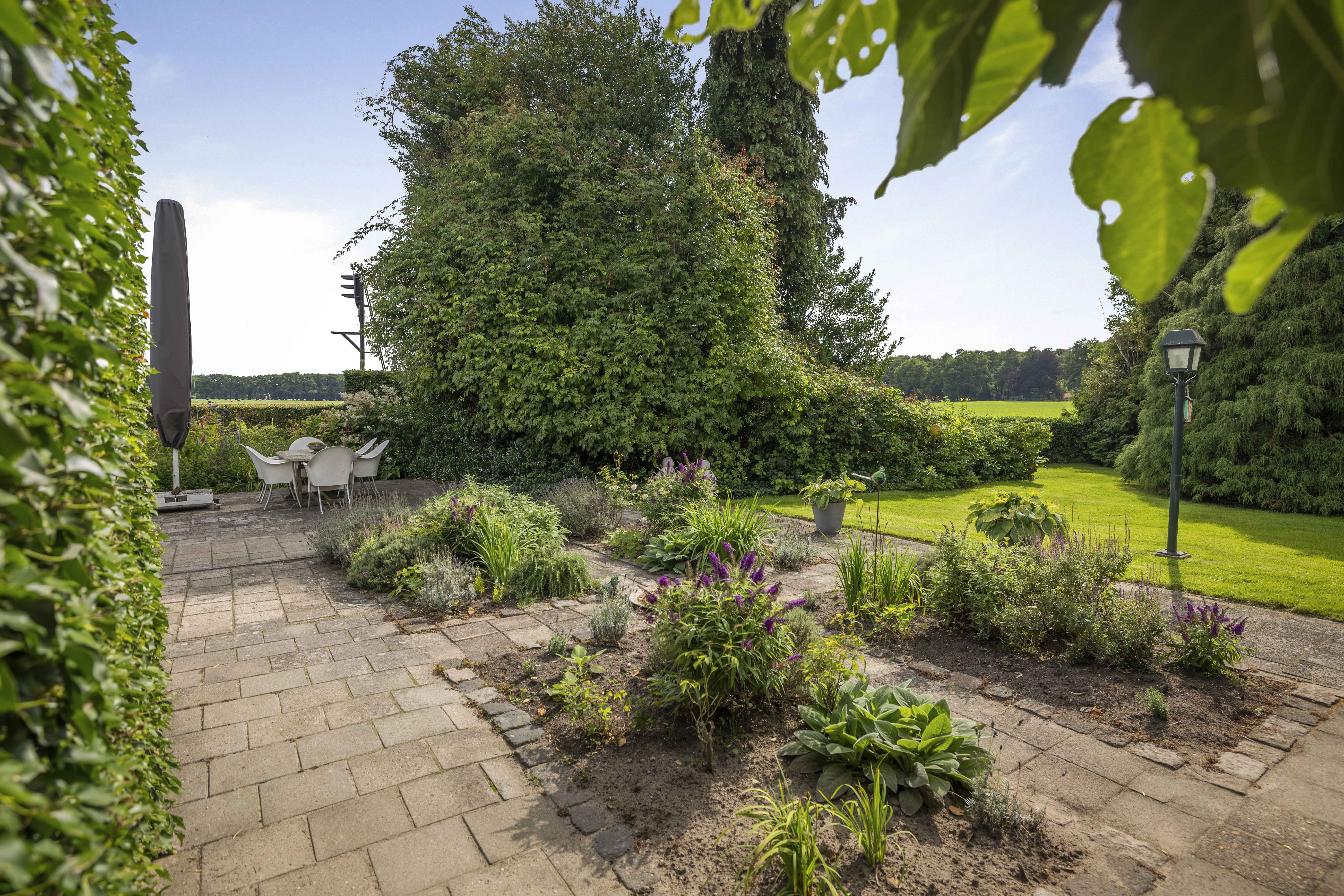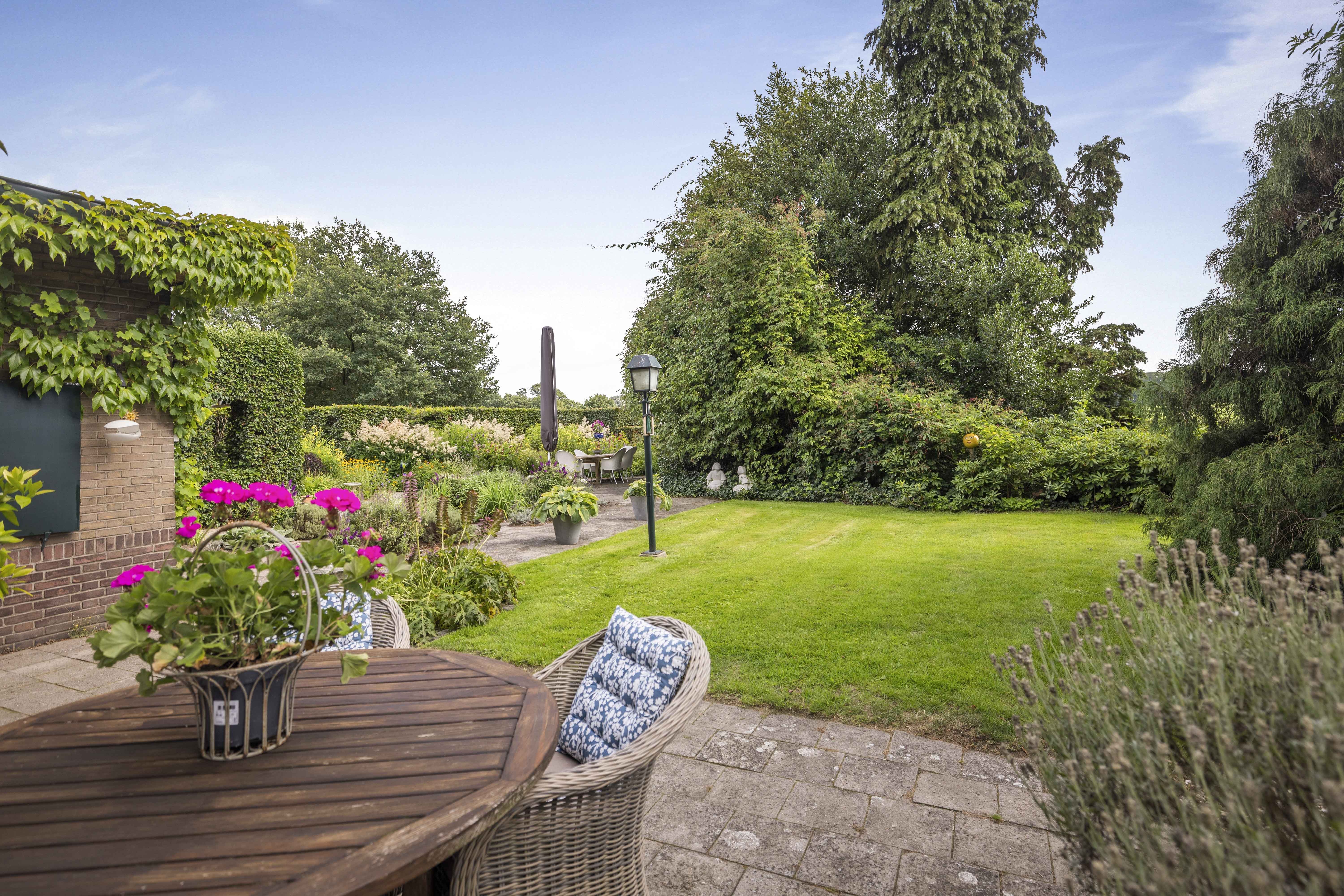 The house is surrounded by a beautiful garden. There is a wooden garage with an adjoining carport, providing space for two cars to be parked in the dry. Garden equipment can also be stored here neatly and sheltered. Due to the orientation of the house, there is a lovely sun terrace behind the property. There are cosy seating areas scattered throughout the garden. The plants are diverse, colourful and carefully chosen, making it a real treat for the senses. There are beautiful sightlines, a small flock of chickens in a cosy run and the dahlias can quietly awaken from their hibernation in the greenhouse. There are two water features and you will enjoy a great deal of privacy here thanks to the secluded location, the man-sized hedges and the mature trees.