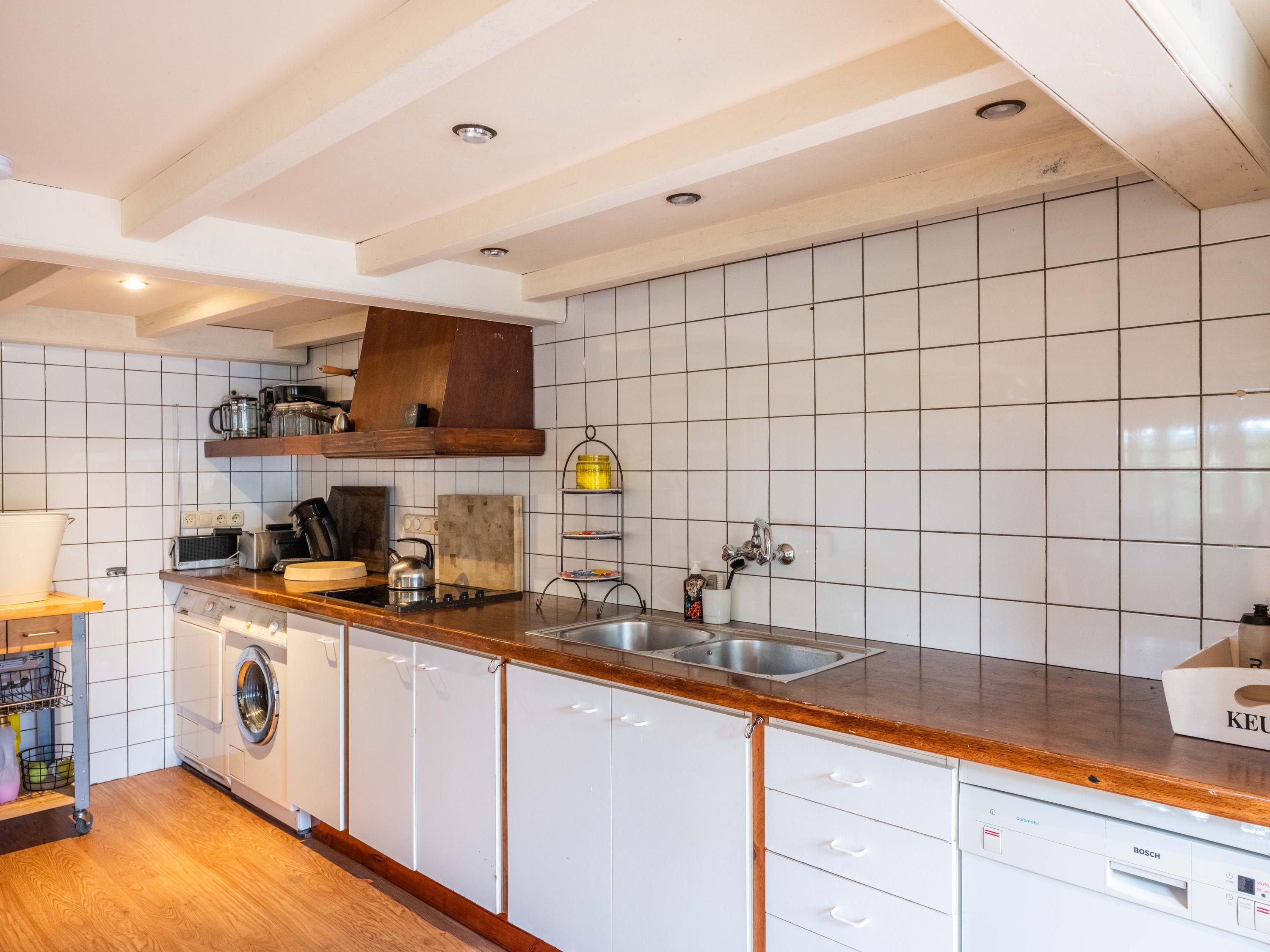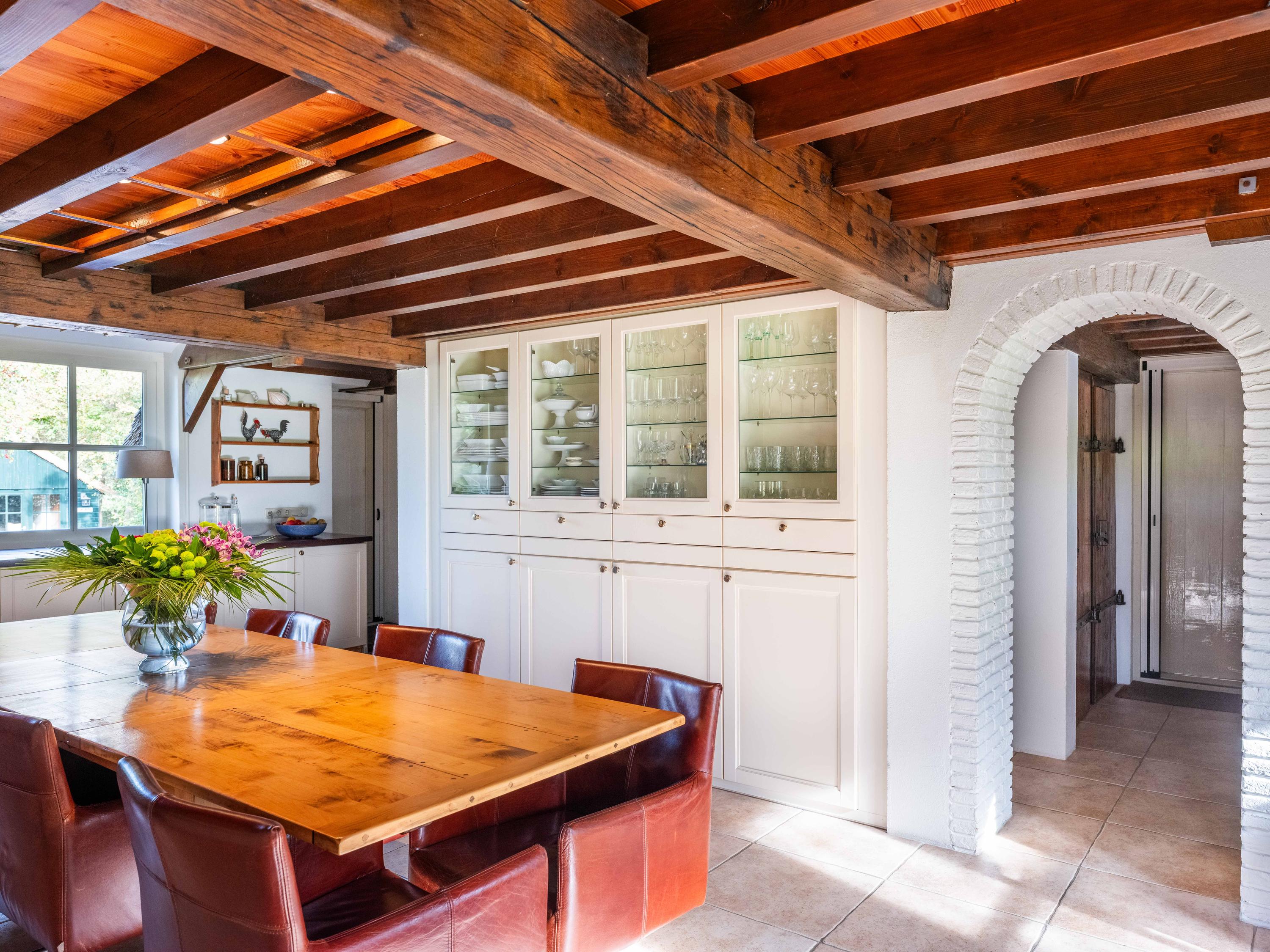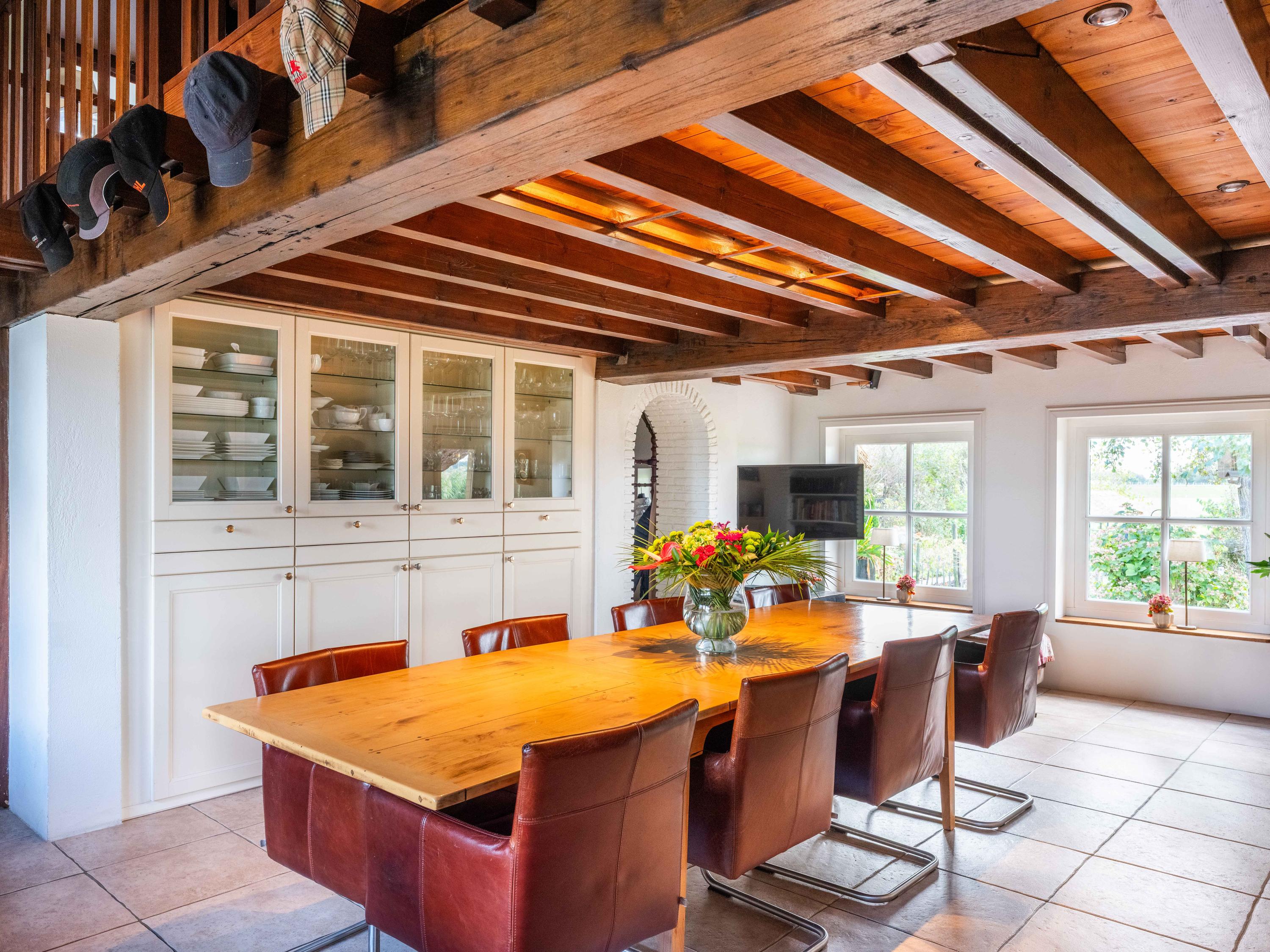 The 224 m² residence embraces country style with contemporary comfort. Full insulation, energy class A, underfloor heating, and a synthetic thatched roof ensure year-round ease. On entry, you are welcomed via an entrance hall with cloakroom and storage, opening to a light-filled dining area and an open kitchen. Authentic materials—beamed ceilings, built-in cabinetry, and an English cooker—delineate the spacious kitchen, at once inviting and functional, flowing into a generous living room where natural light plays across water and garden, anchored by a wood-burning stove.