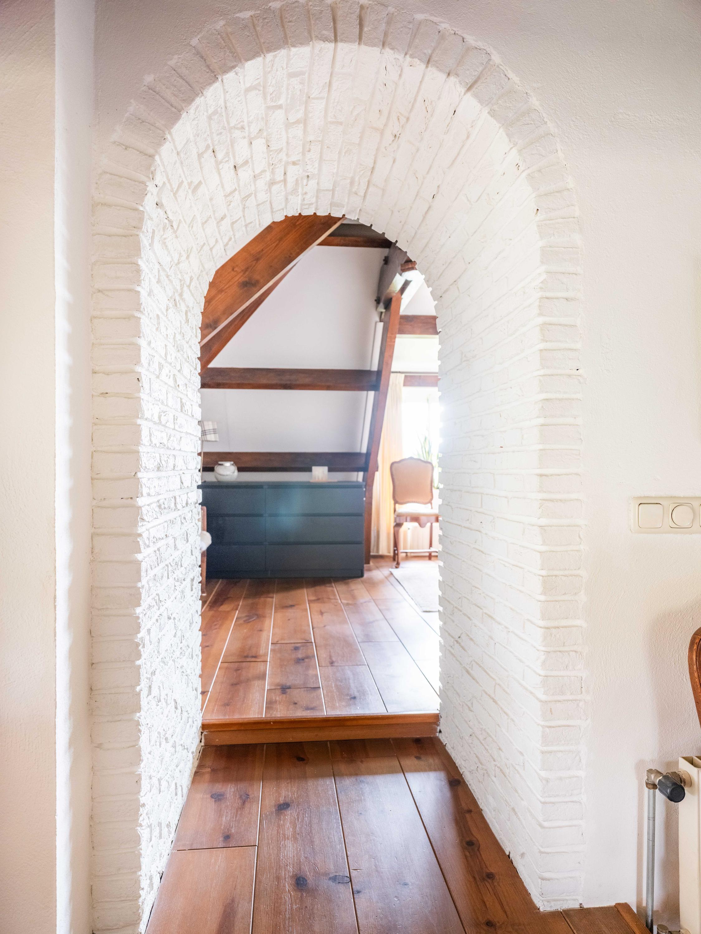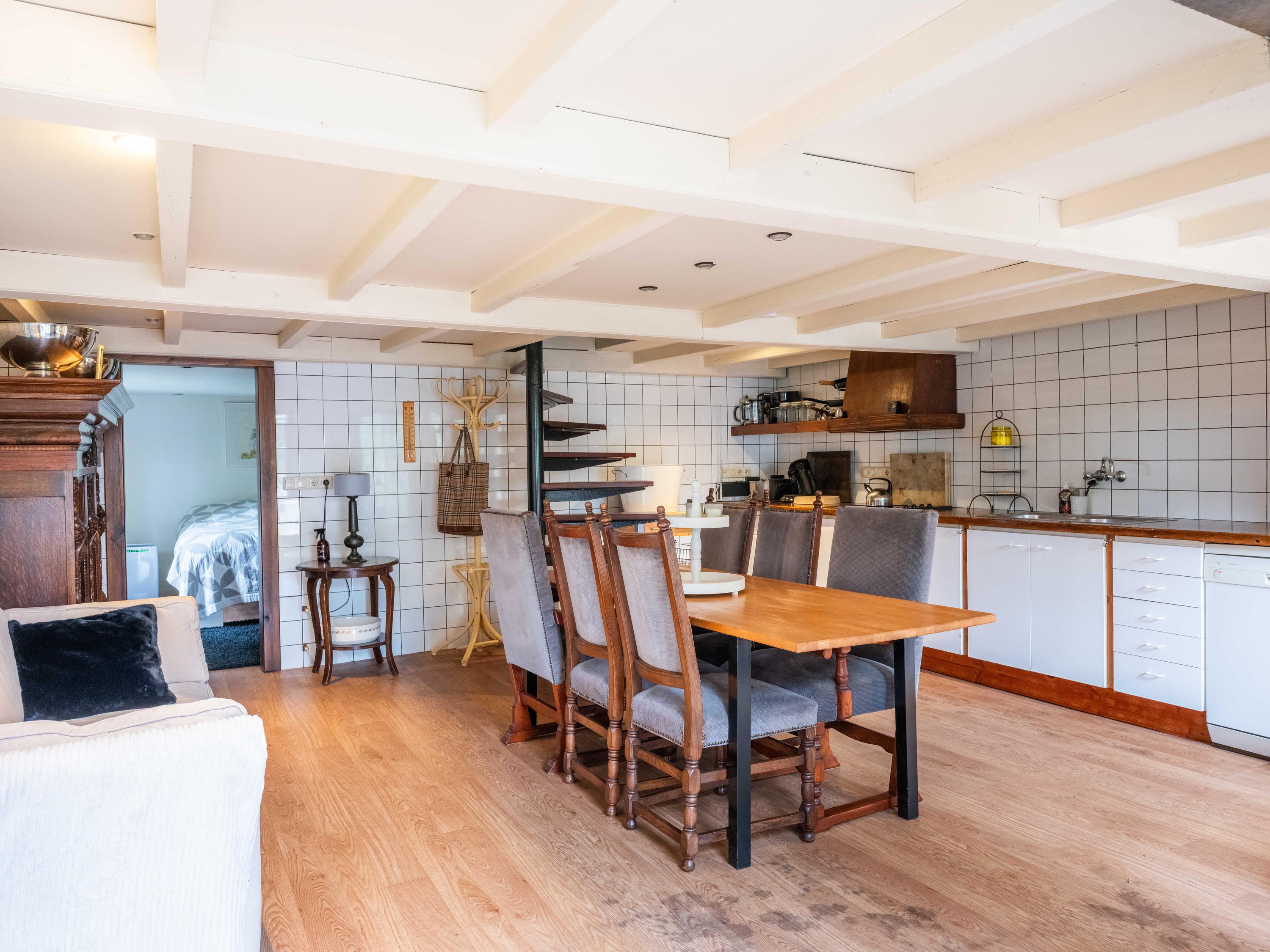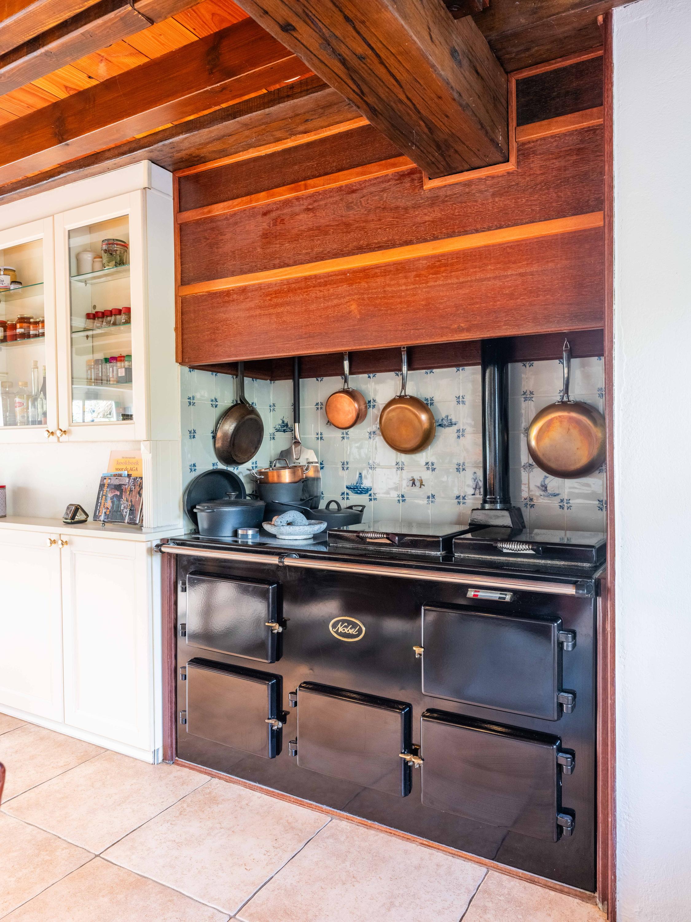 The 224 m² residence embraces country style with contemporary comfort. Full insulation, energy class A, underfloor heating, and a synthetic thatched roof ensure year-round ease. On entry, you are welcomed via an entrance hall with cloakroom and storage, opening to a light-filled dining area and an open kitchen. Authentic materials—beamed ceilings, built-in cabinetry, and an English cooker—delineate the spacious kitchen, at once inviting and functional, flowing into a generous living room where natural light plays across water and garden, anchored by a wood-burning stove.