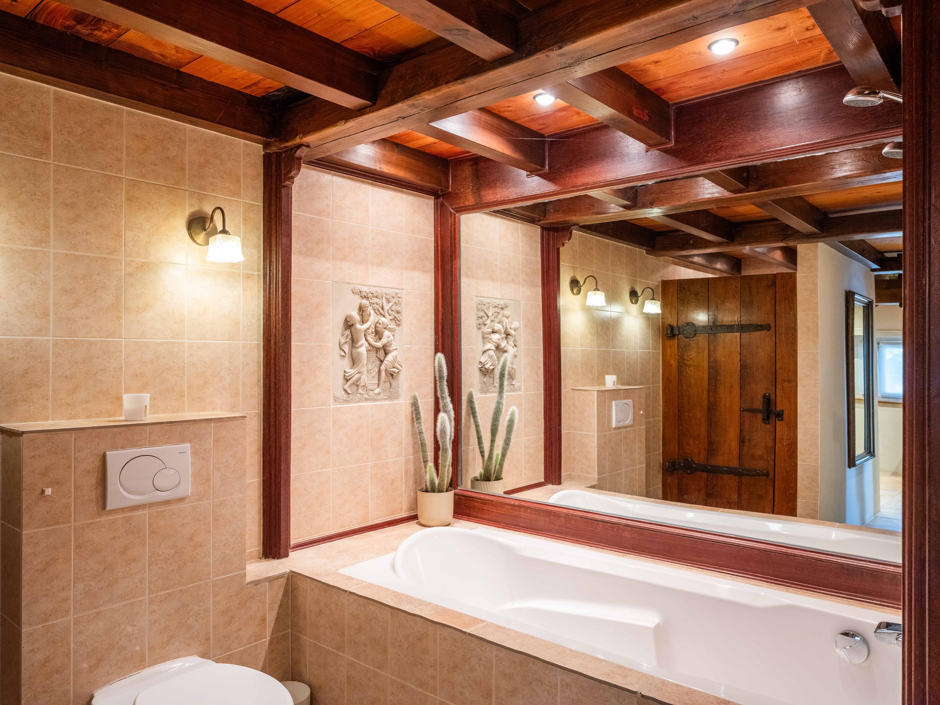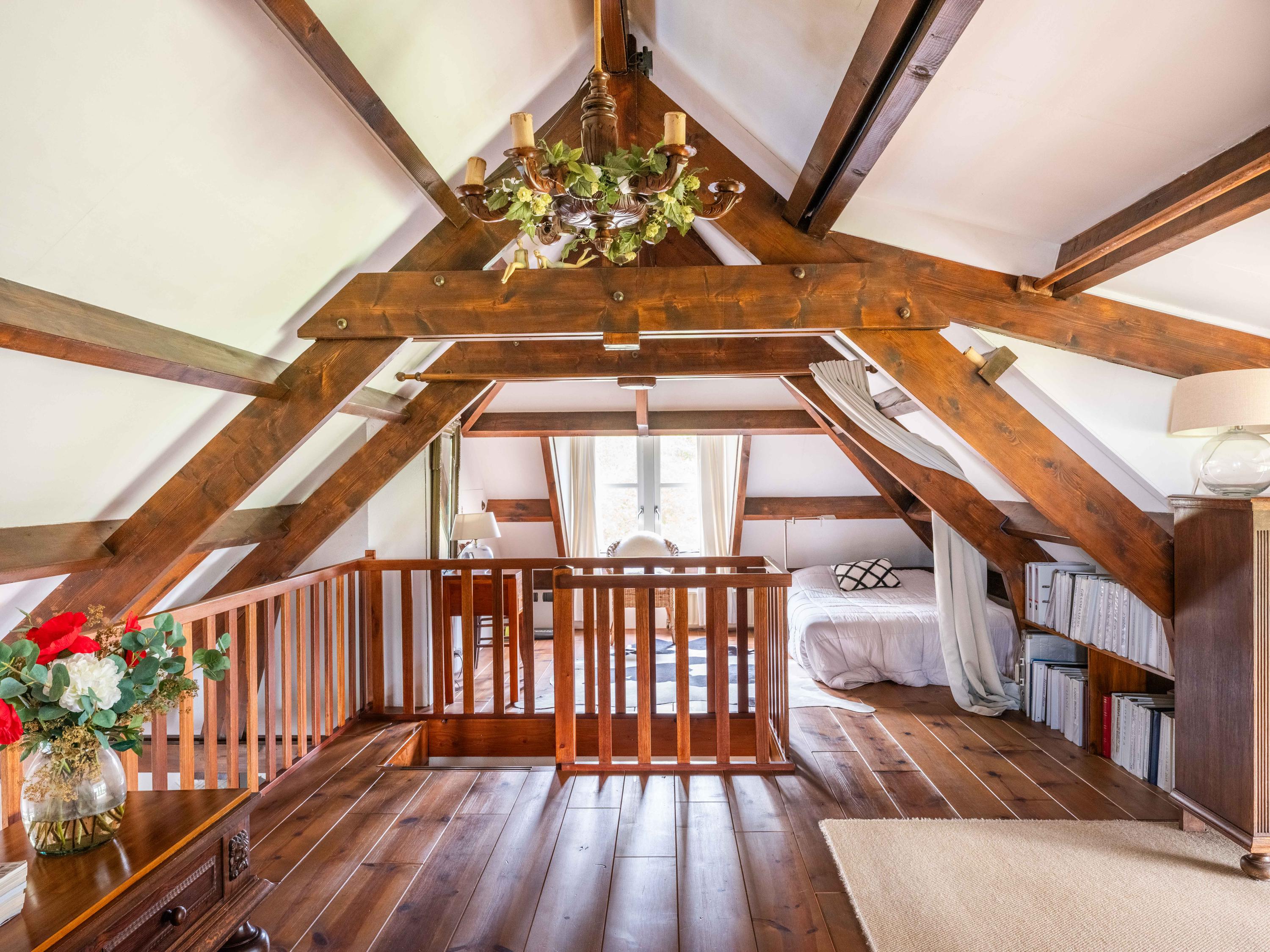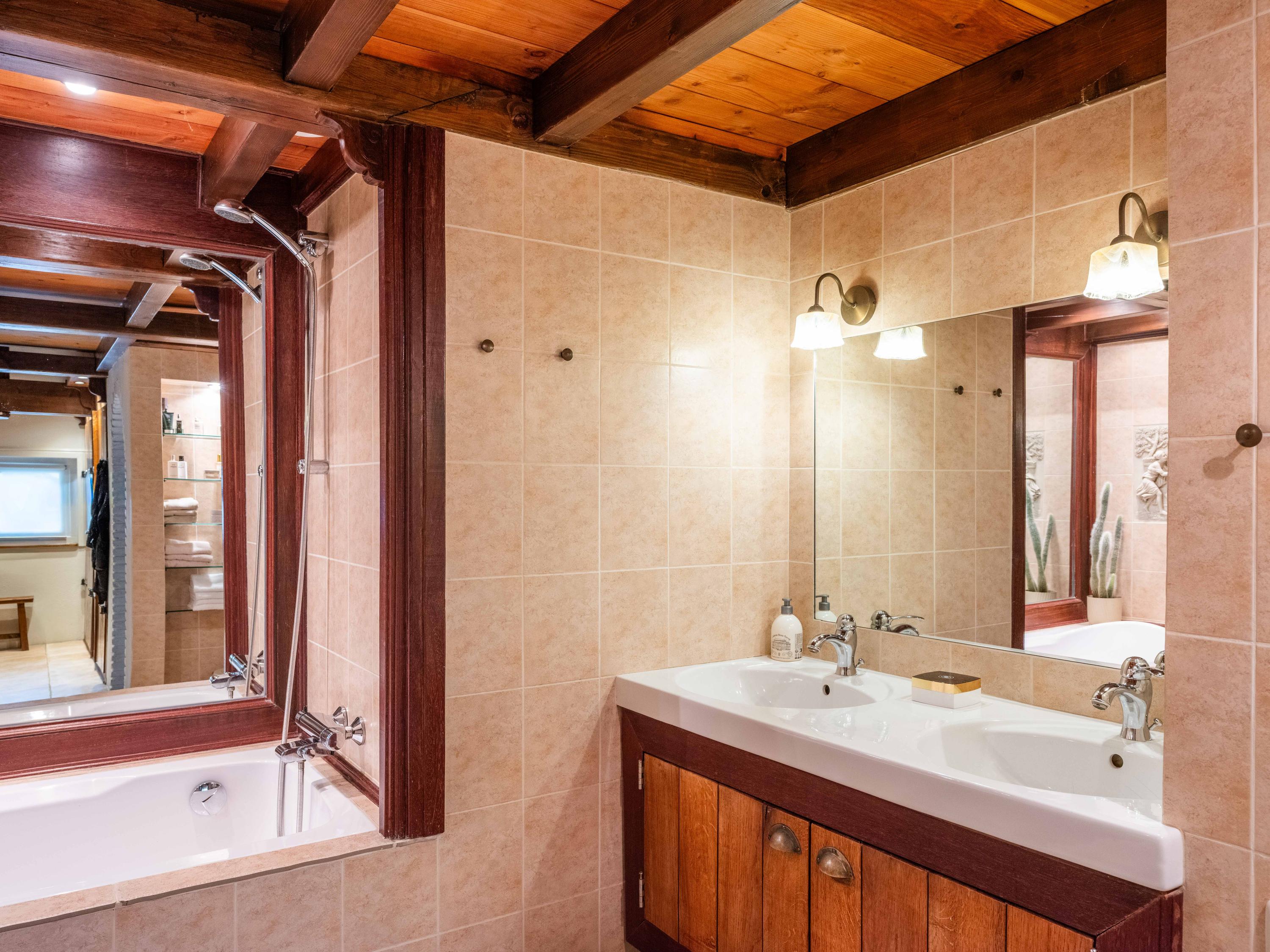 The ground floor encompasses a luxurious bathroom, a practical walk-in closet, a separate cellar, and a thoughtfully integrated work and guest area atop the mezzanine. The principal bedroom enjoys panoramic views of gardens and meadows, enhanced by optimal orientation for peace and sunlight.