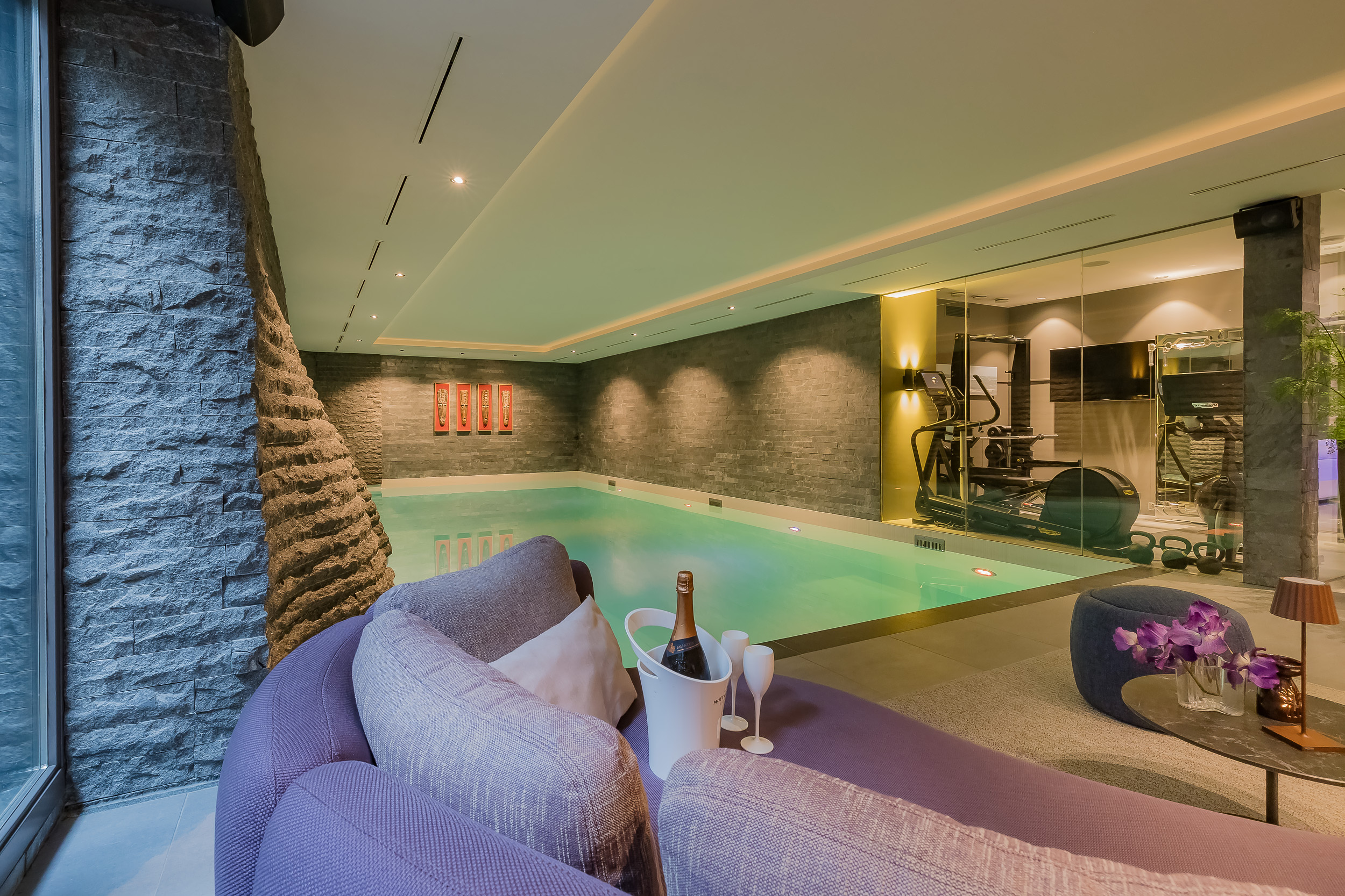The souterrain level is devoted to wellness, highlighted by a 13-metre heated indoor pool set beside sculpted, wave-like walls, plus a private cinema, fitness area, steam cabin, sauna, and soft lighting throughout.