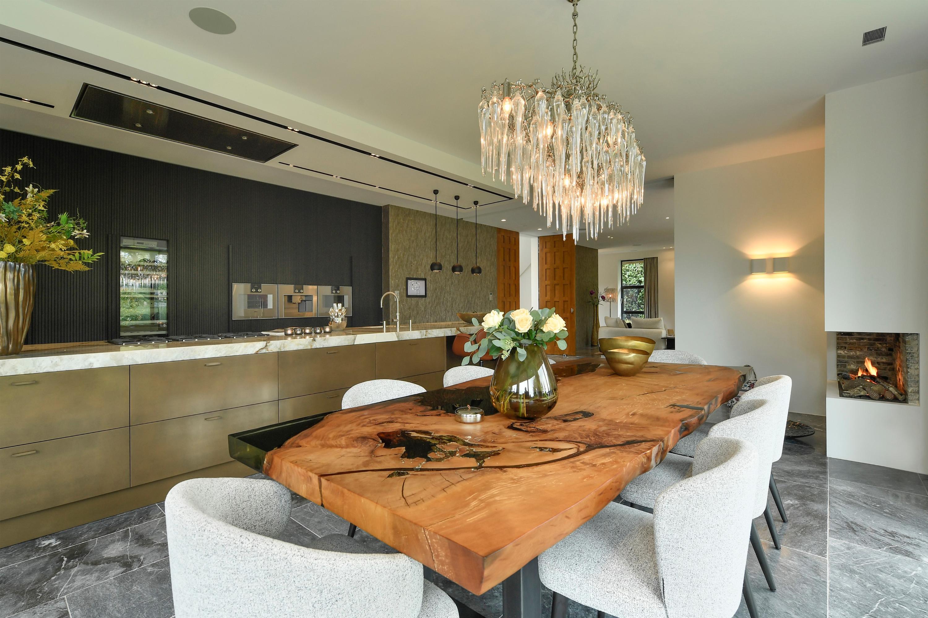 Upon entry, a grand hall with a sweeping staircase and high double doors welcomes, leading into living spaces where light shapes every room. The living room, centered by an elegant fireplace, connects seamlessly to terraces and garden, while sliding wooden doors allow for adaptable spaces between lounge and dining. The kitchen features a Patagonia quartzite island, Gaggenau appliances, and flows to a utility area with direct access to the double garage equipped with electric doors.