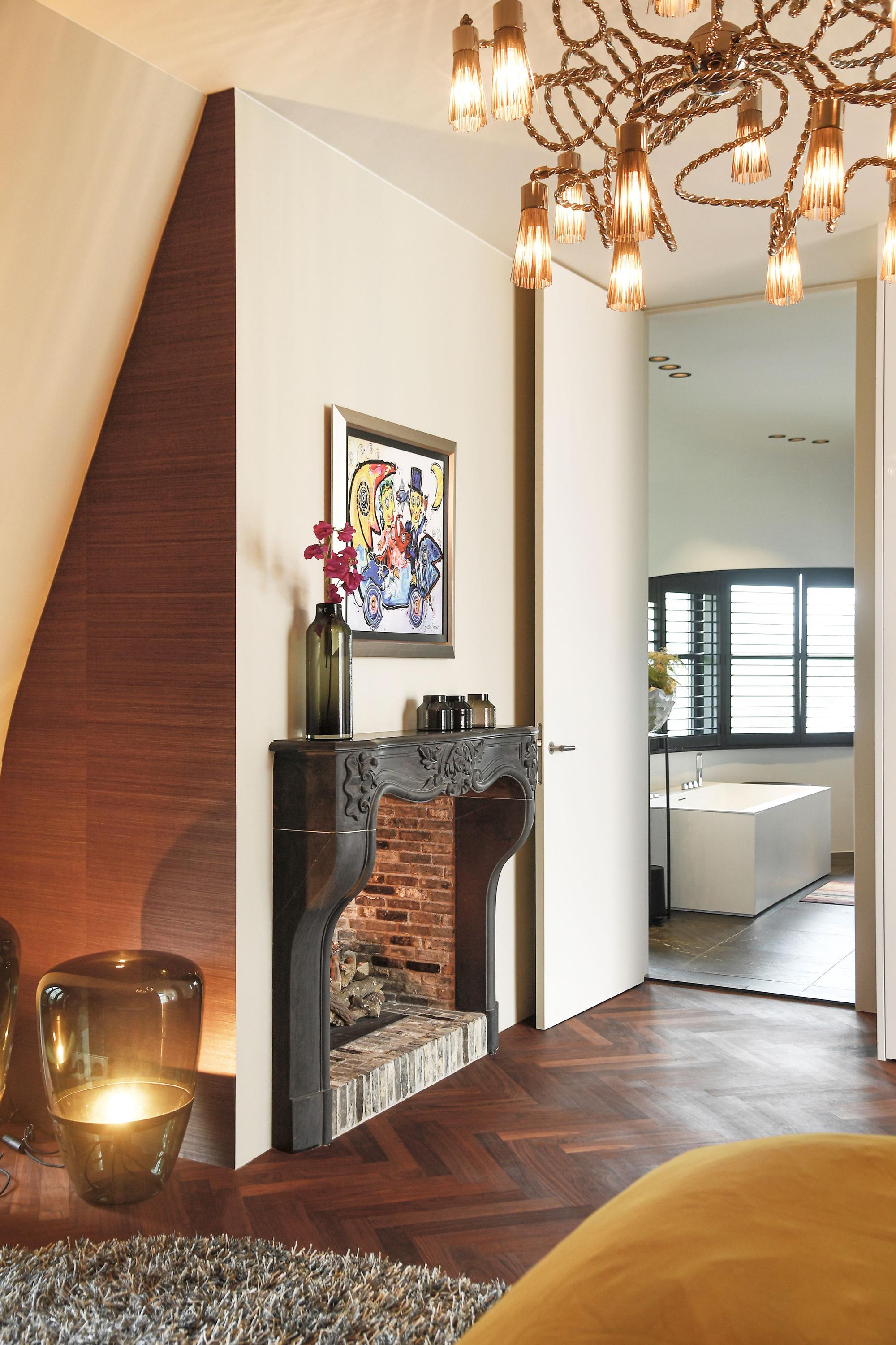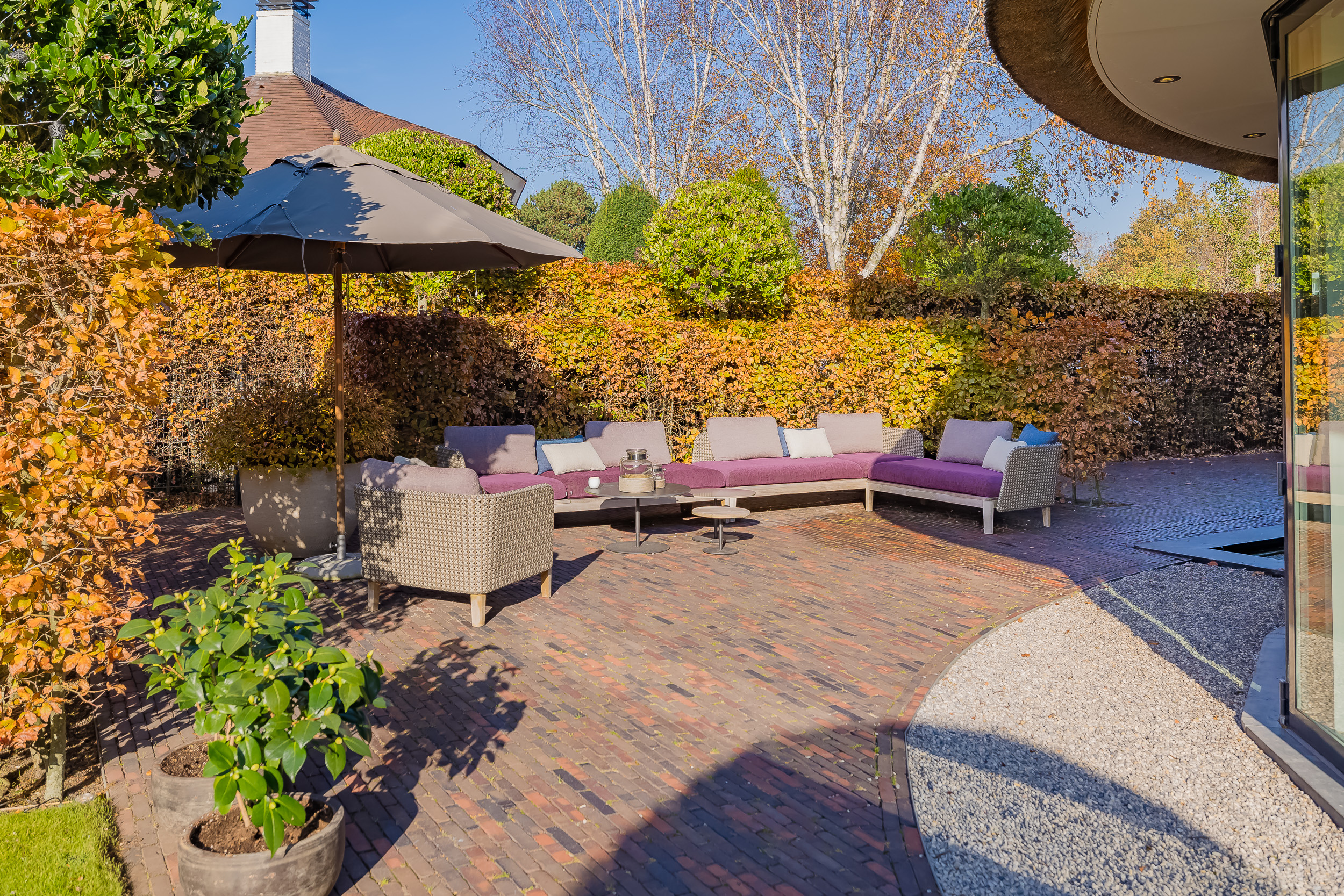 Gardens designed by a landscape architect frame terraces and a 53 m² boathouse with remote-controlled lift, enabling private access to Dutch waterways. An adjacent covered veranda with wood-burning fireplace allows year-round enjoyment outdoors.