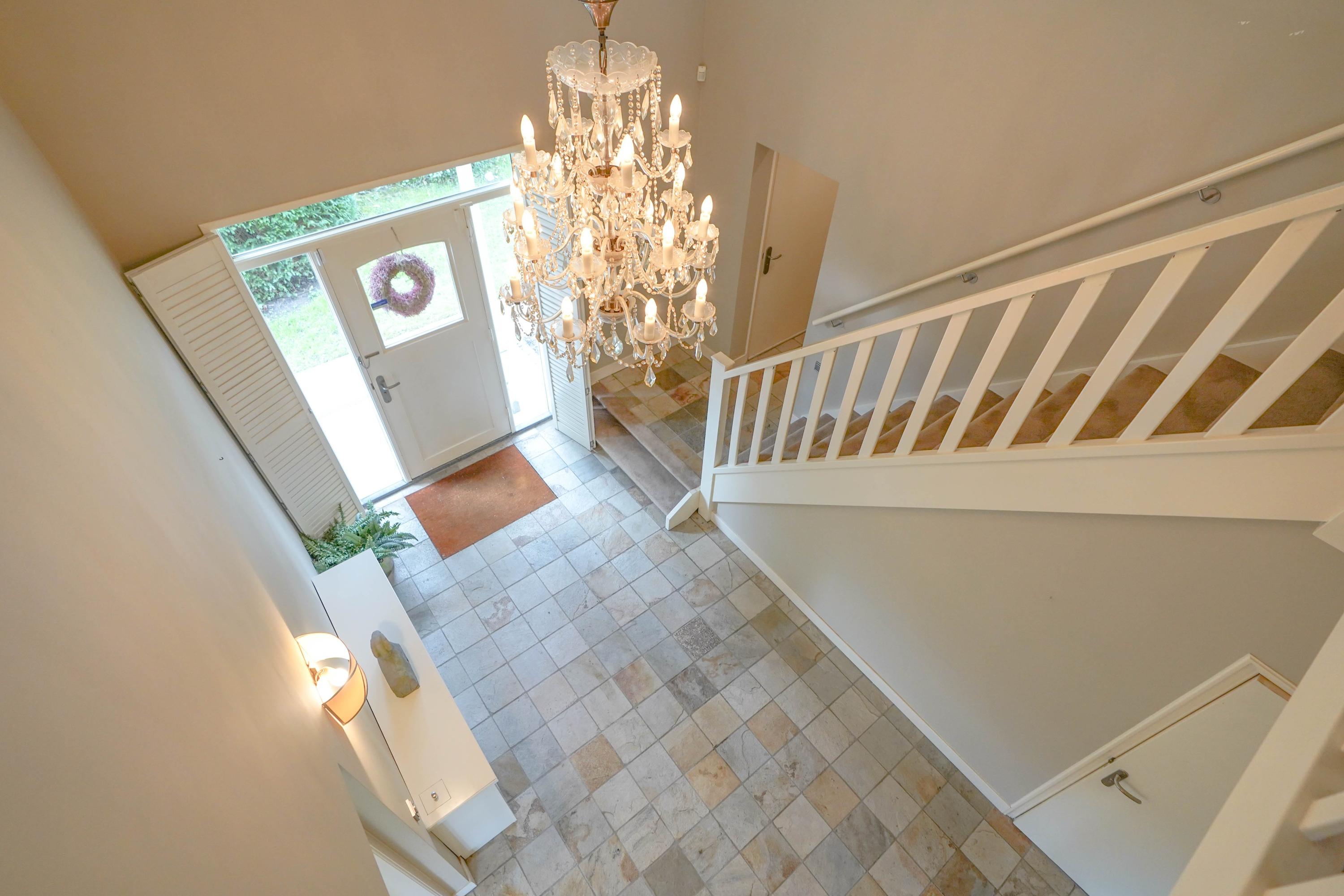 Via the private road through the park you reach the villa, with several parking spaces and a double, indoor garage with electric overhead doors. The front door gives access to the spacious and bright entrance with meter cupboard, wardrobe and a guest toilet. The hall also provides access to the basement with fixed stairs and standing height.