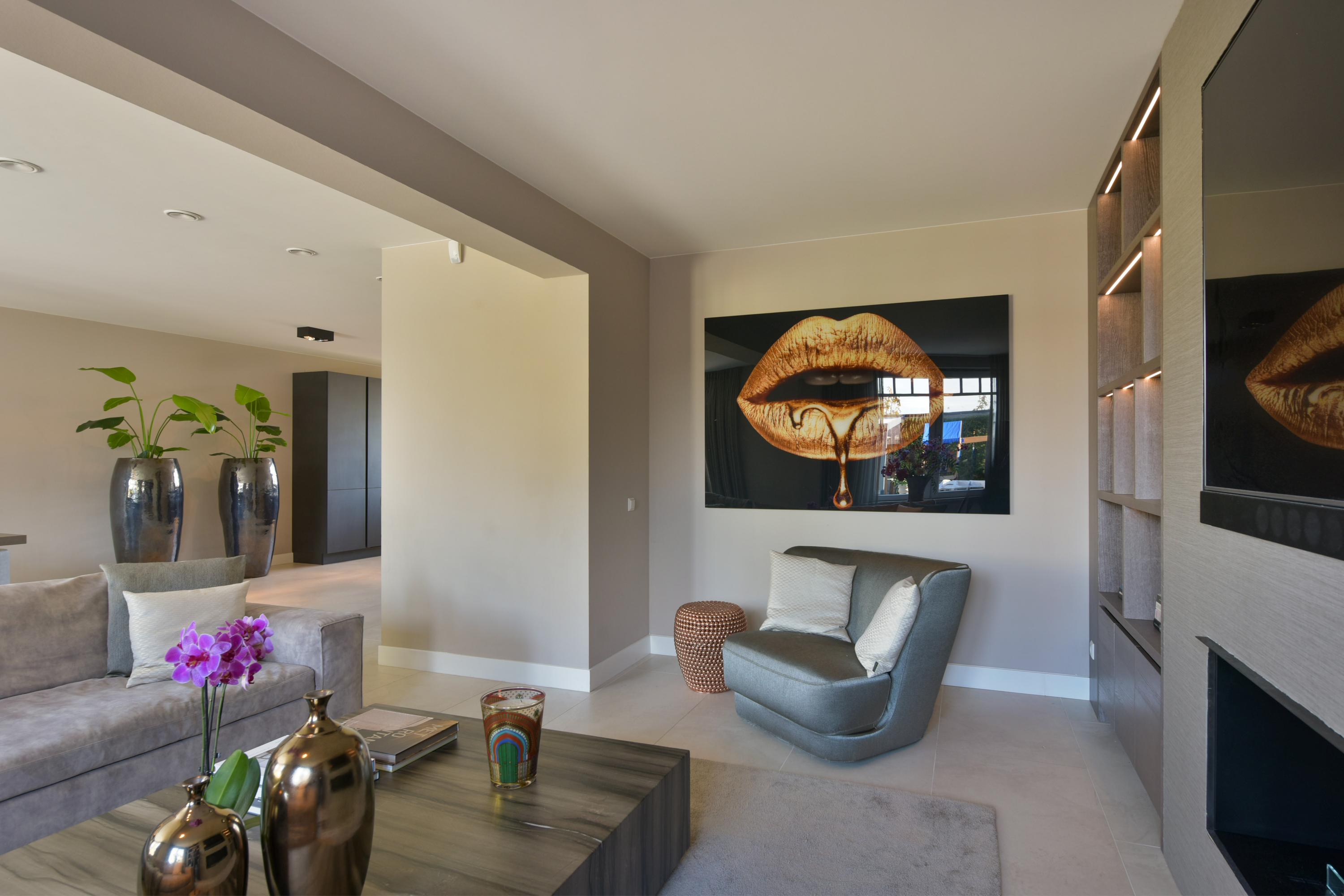 Opening this door reveals an impressively spacious and bright living room. Thanks to the extension at the rear—without a supporting column—the space feels completely open and uninterrupted. The custom-designed wall unit facing the garden perfectly combines design and functionality, with open shelves, concealed storage, a dedicated space for the TV, and a cozy bio-ethanol fireplace. All designed by Eric Kuster, whose style embodies cosmopolitan luxury, a balance of glamour and comfort, with rich materials, subtle color palettes, and layered textures, creating interiors as elegant as they are inviting, like a luxury hotel suite.