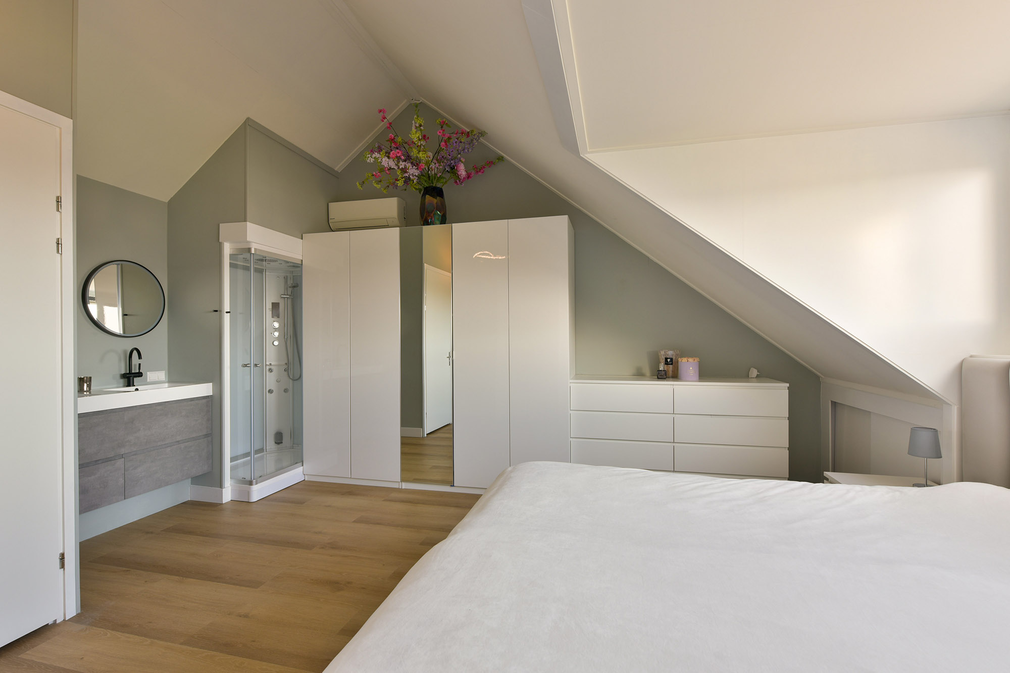 From the master suite, you can access a spacious storage area spanning the full width of the house, housing the heat pump, heat recovery system, washing machine, dryer connections, and an extra boiler to ensure optimal water pressure for the steam shower.