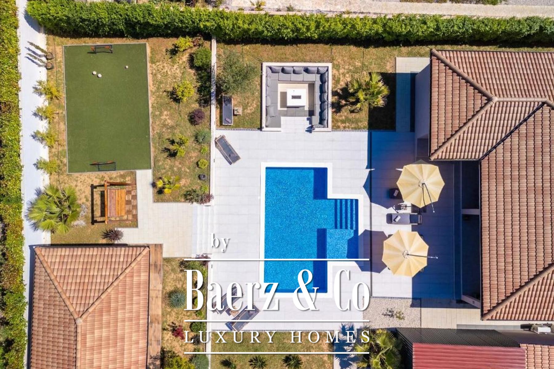 Spanning 483 m², the villa is arranged with clarity and purpose. A spacious living room and open kitchen gather the light and flow seamlessly to the garden, where a private swimming pool invites quiet afternoons or convivial evenings. Three thoughtfully appointed bedrooms, each with their own en suite bathroom, allow for privacy and ease across the home. In the grounds, a garden tavern adds a subtle note of tradition, designed for lingering meals or restorative solitude.