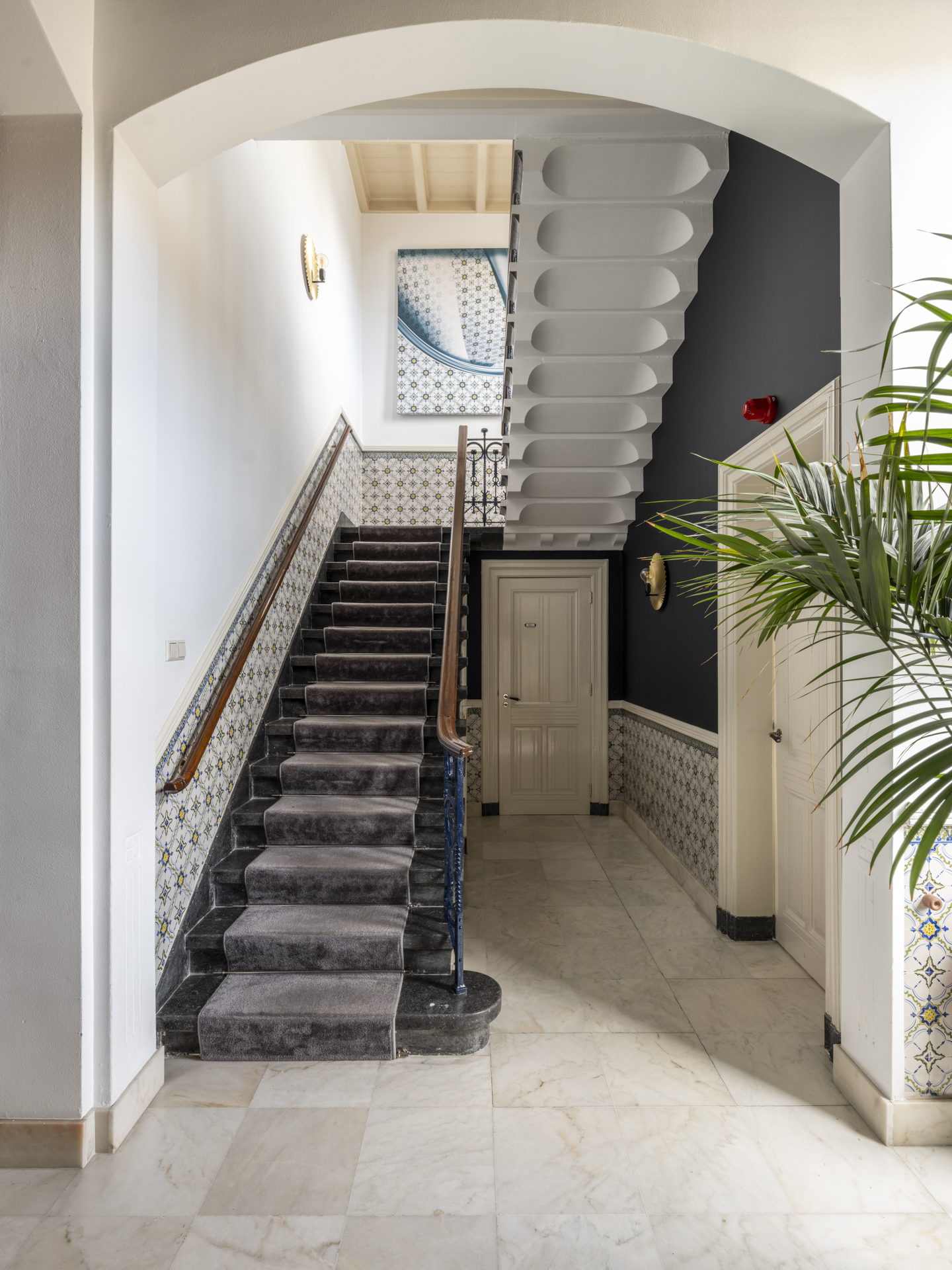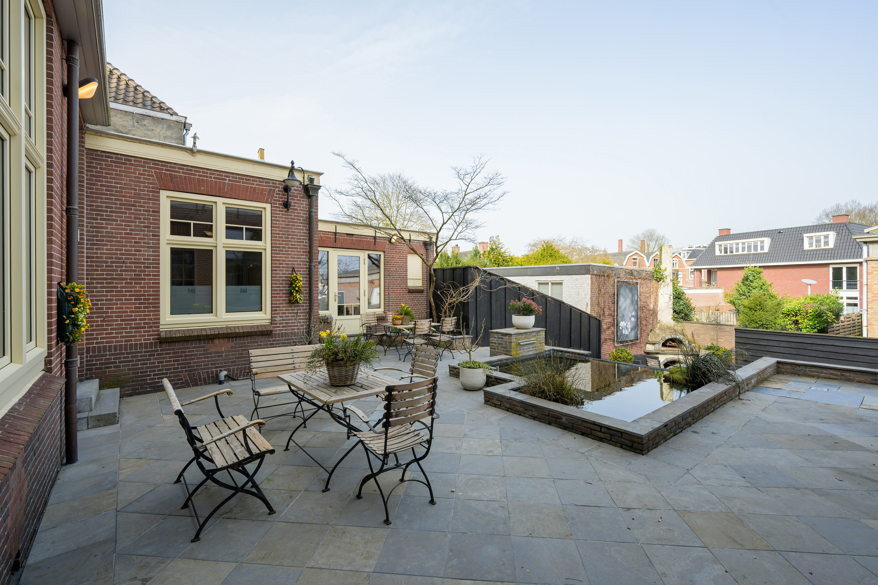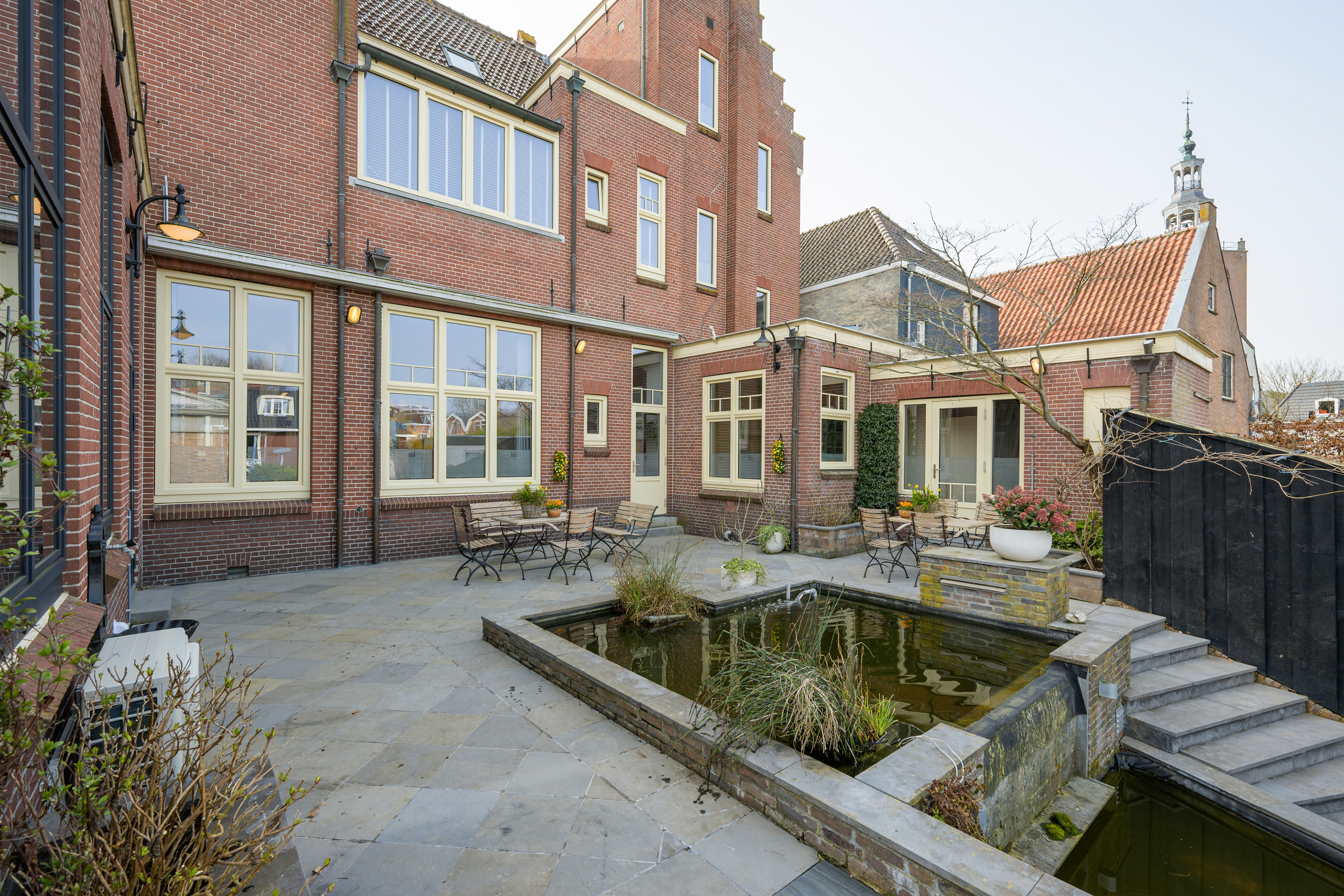 Period elements such as an original hardstone staircase, marble floors, intricate plasterwork, and leaded glass appear throughout. The flow of the home is anchored by a dramatic central hallway, with distinct living and working rooms branching off. Carefully updated, the villa marries heritage with modern comfort: high-grade insulation, HR++ double glazing, 23 solar panels, and three heating systems.