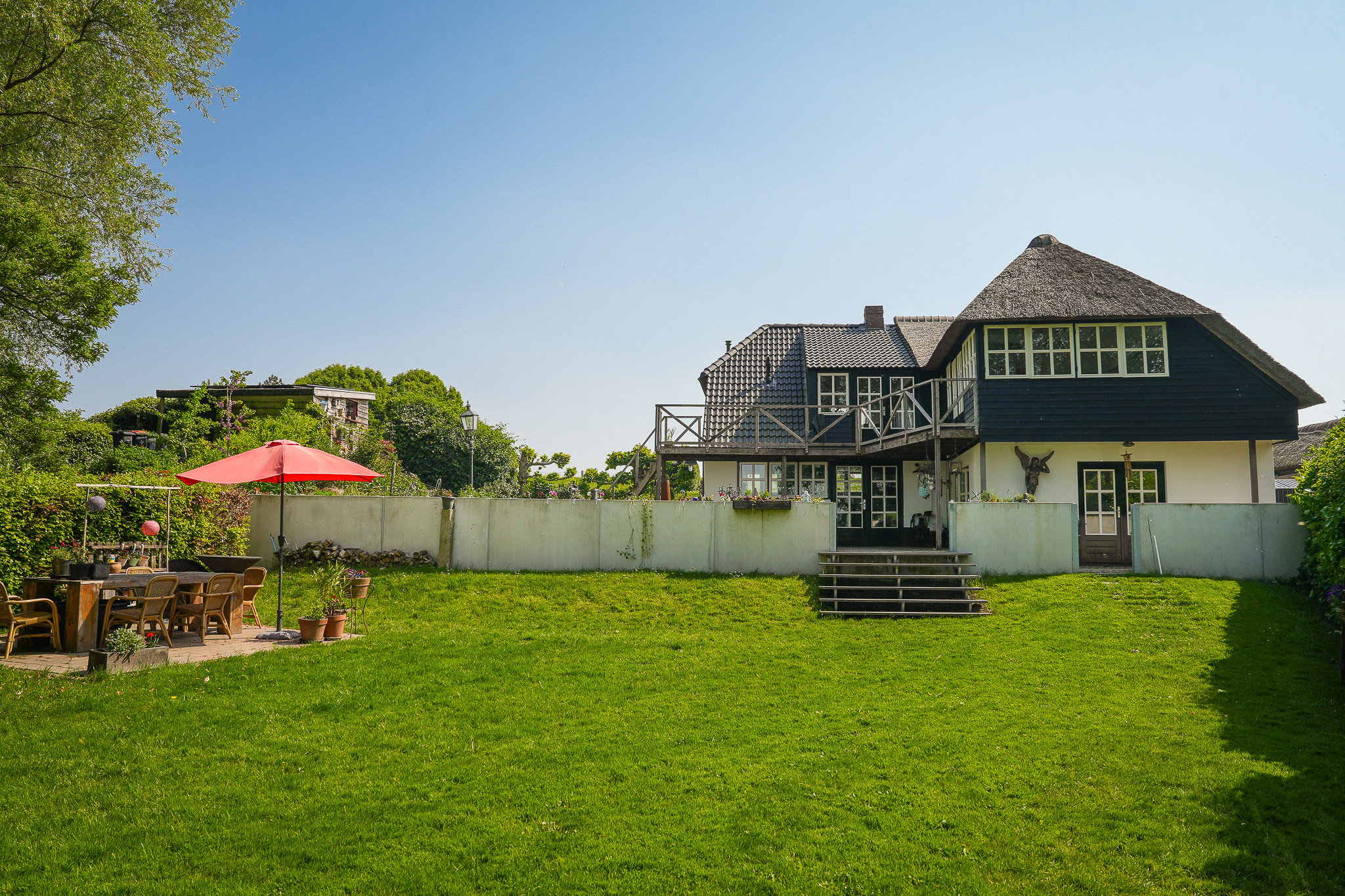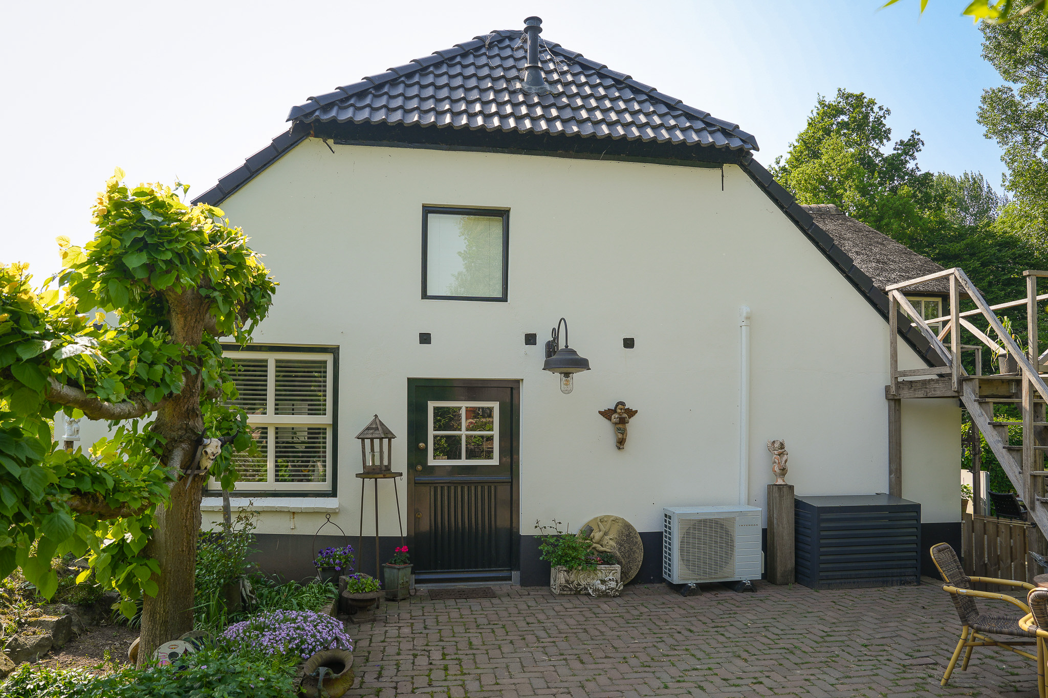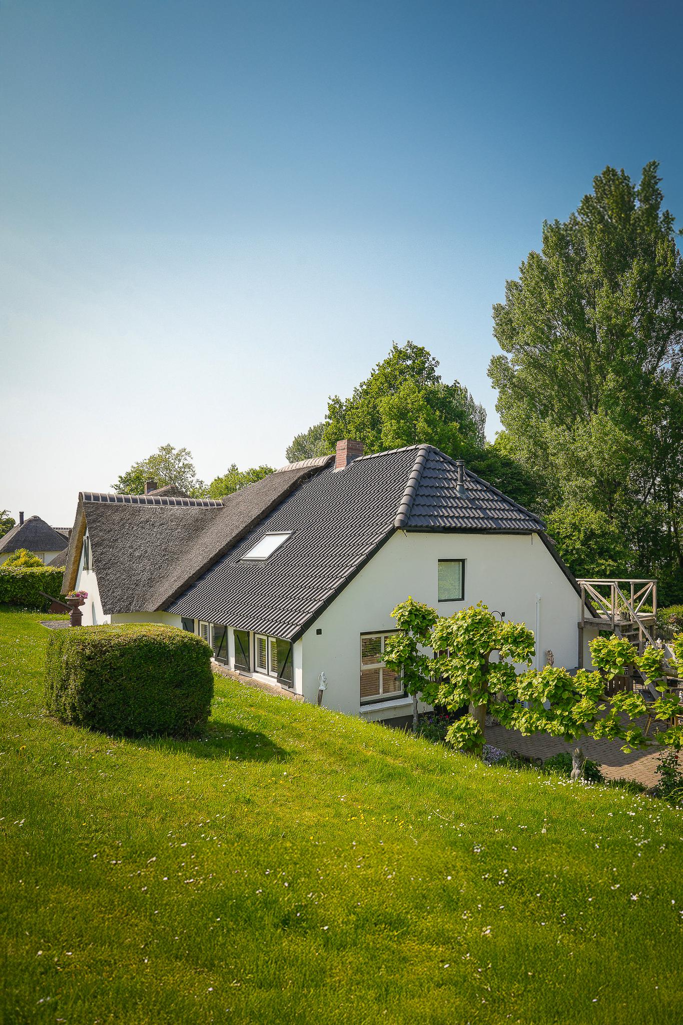 This property is known locally as “The Old Smithy,” as it was the village blacksmith’s house until 1964. From the dike, the house resembles a classic dike house commonly found along the River Waal. However, the rear boasts the appearance of a luxury villa, thanks to the clapboard extension, thatched roof, and French doors.