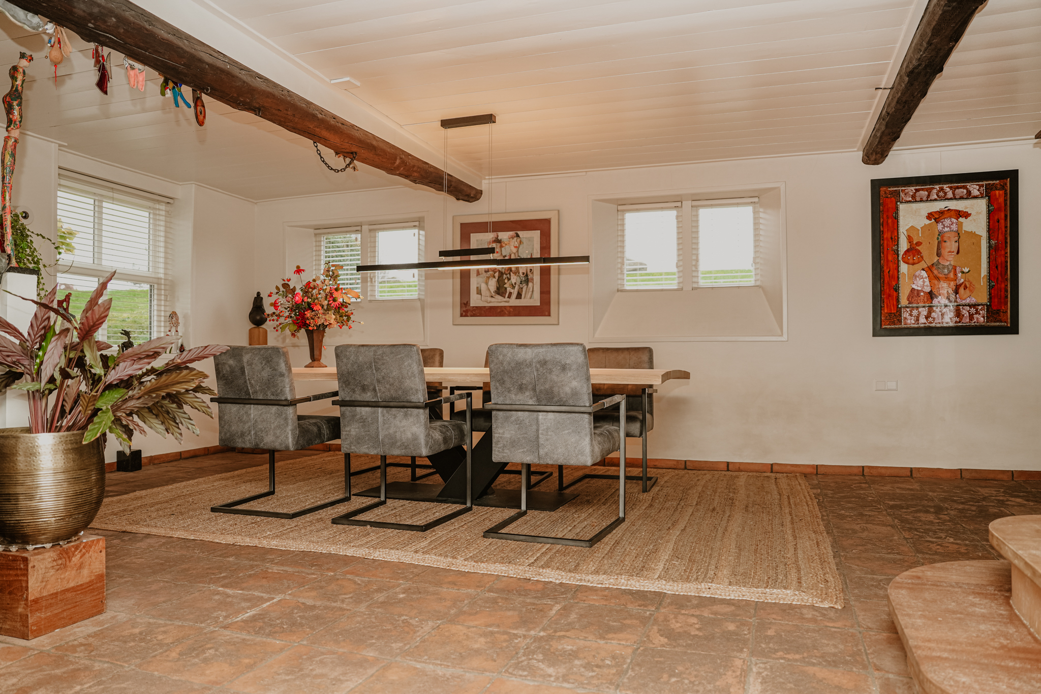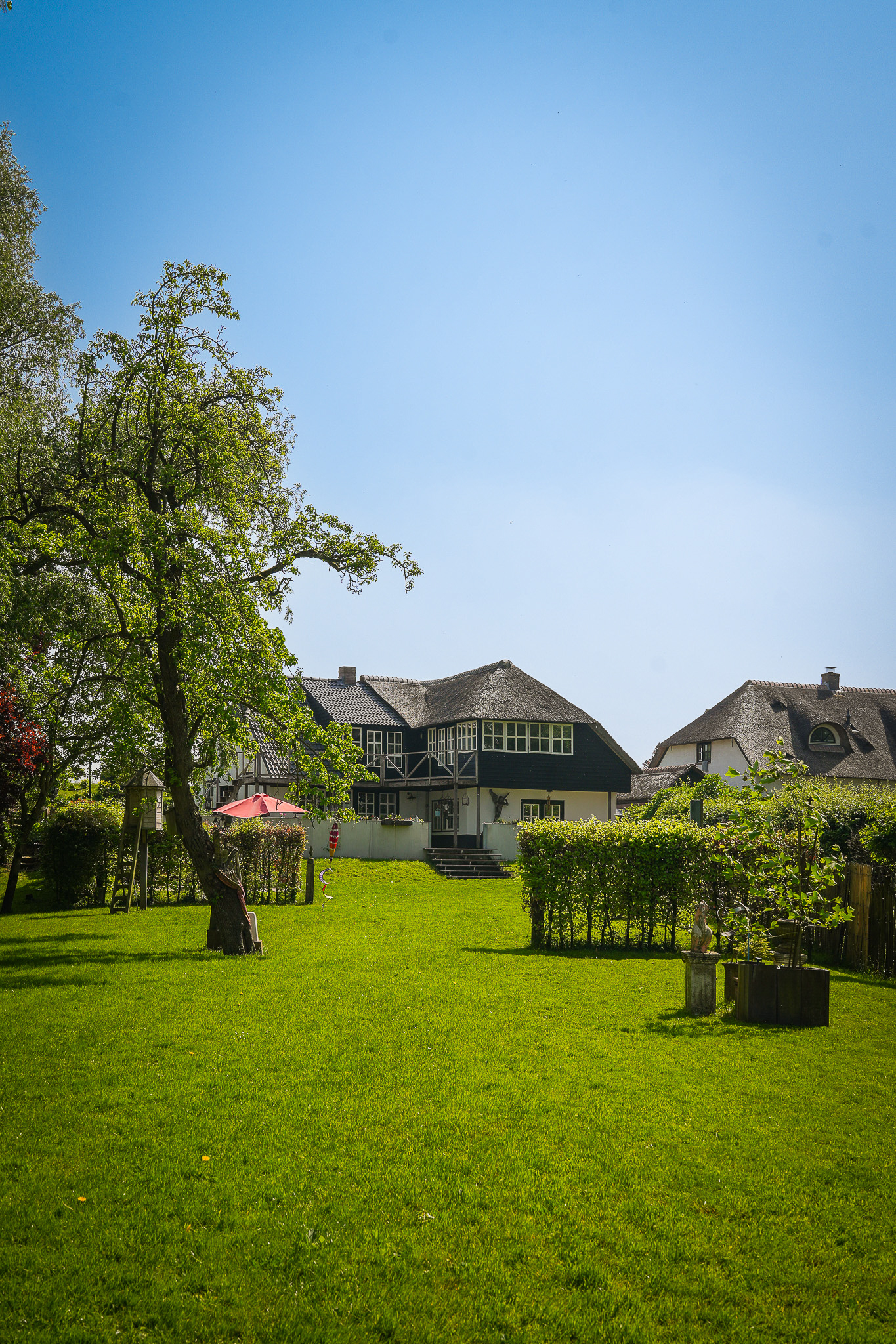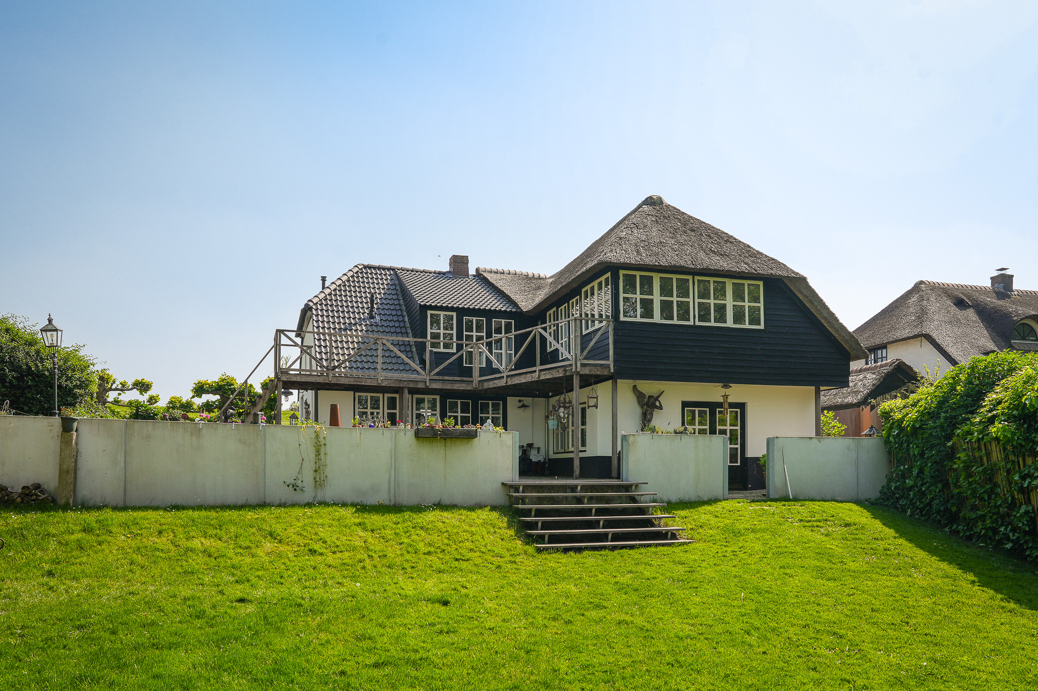 This property is known locally as “The Old Smithy,” as it was the village blacksmith’s house until 1964. From the dike, the house resembles a classic dike house commonly found along the River Waal. However, the rear boasts the appearance of a luxury villa, thanks to the clapboard extension, thatched roof, and French doors.