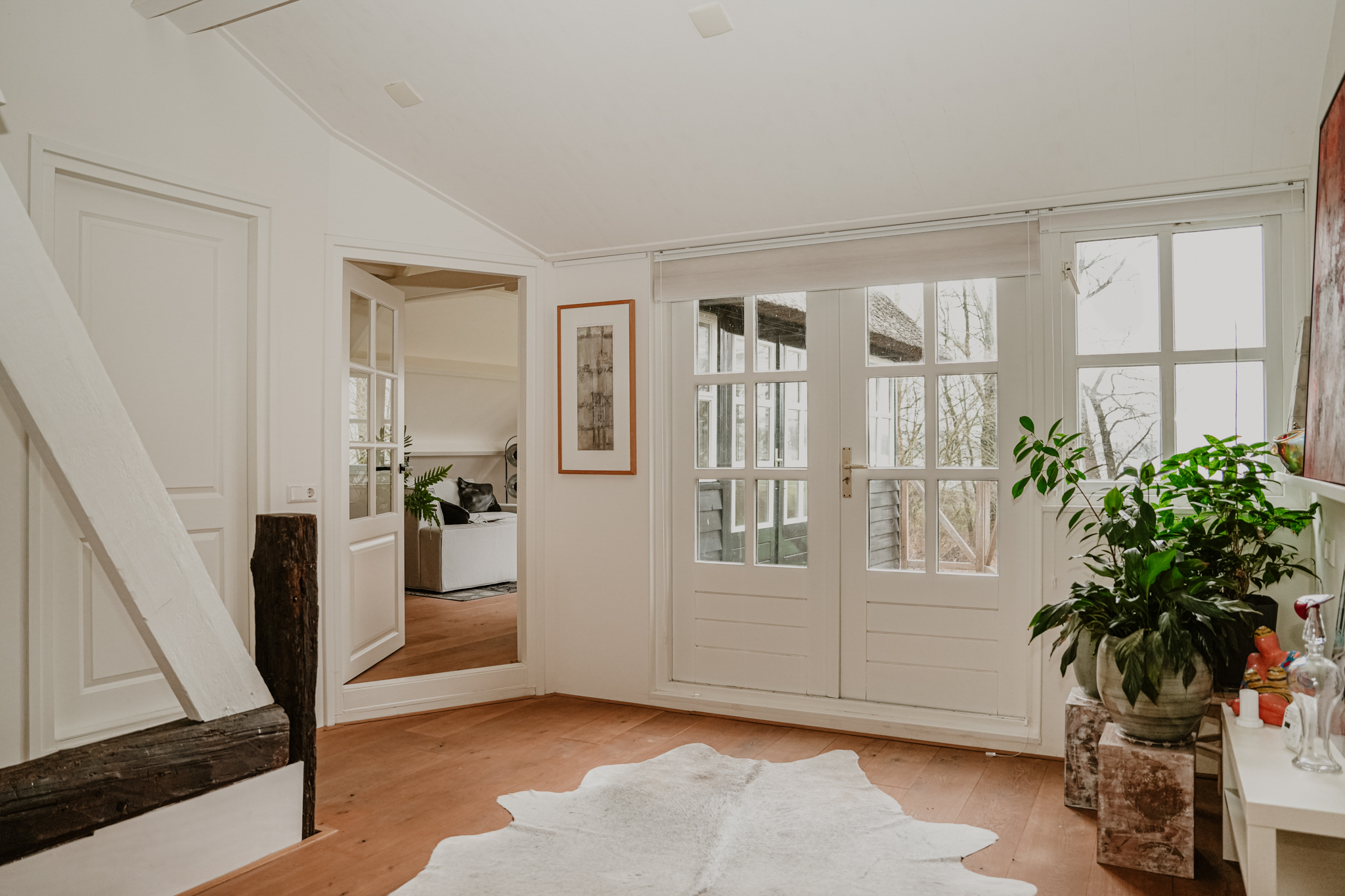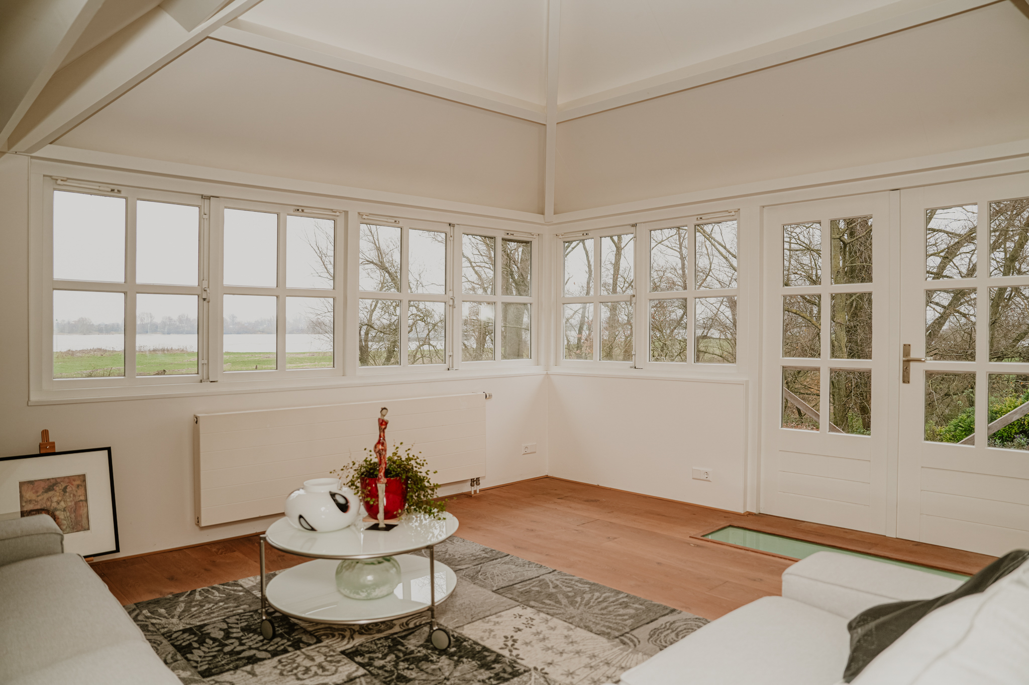 Upon reaching the first floor, you are greeted by a surprising amount of space, light, and breathtaking views. The area in the original dike house is designed as a work/lounge space, with the exposed beams remaining visible. French doors with six-pane division open onto the river-facing roof terrace. At the rear, in the 2003 extension, there is a second living space with additional French doors and numerous windows, offering stunning views of the River Waal. This inspiring space is perfect as an atelier or additional bedroom.