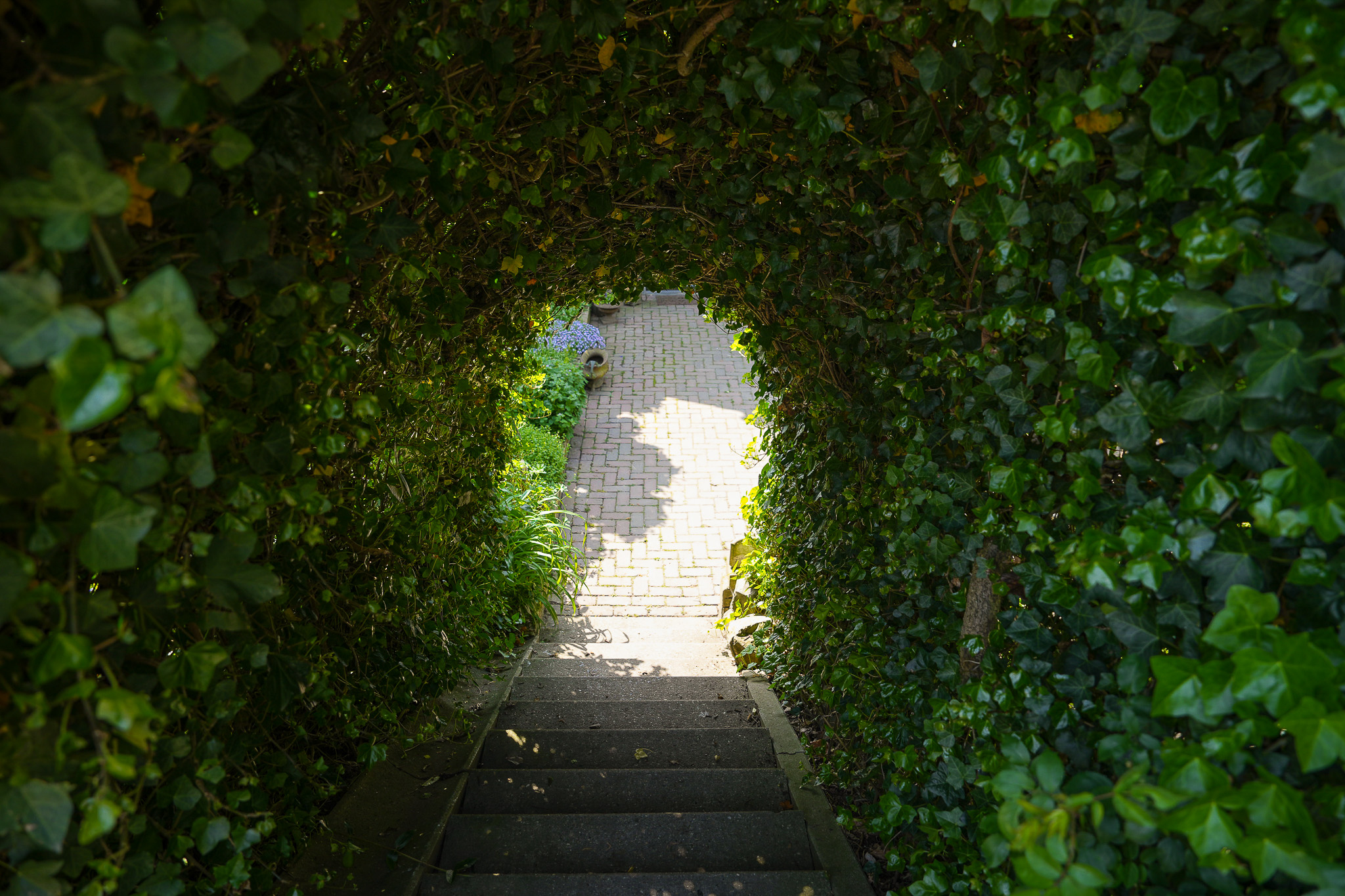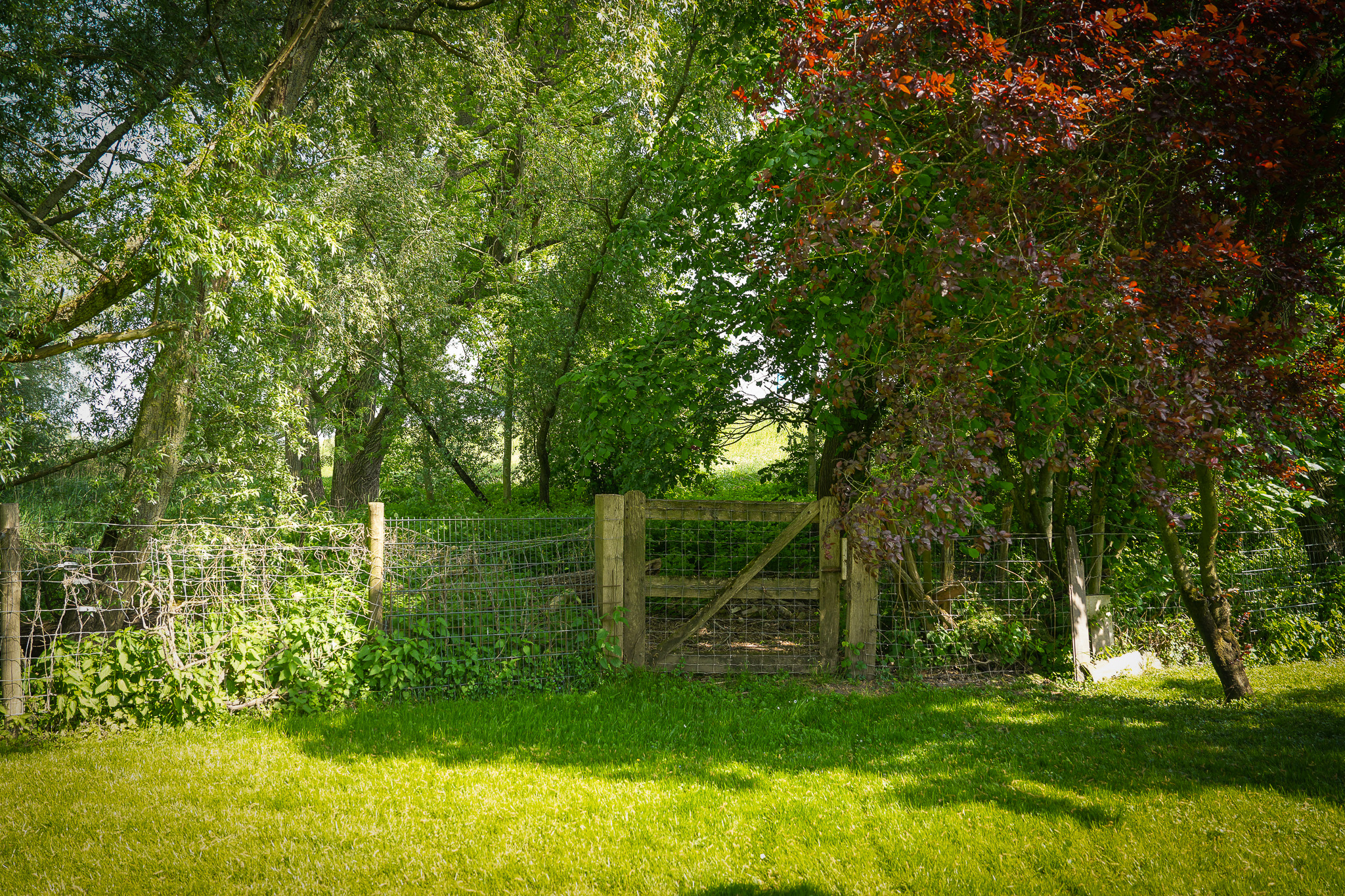 The garden, with various terraces, a wood storage area, lovely beech hedges, and an old high-stem fruit tree, is planted to withstand potential river flooding in winter. The solid retaining wall installed by the owners ensures safety while living near the water.